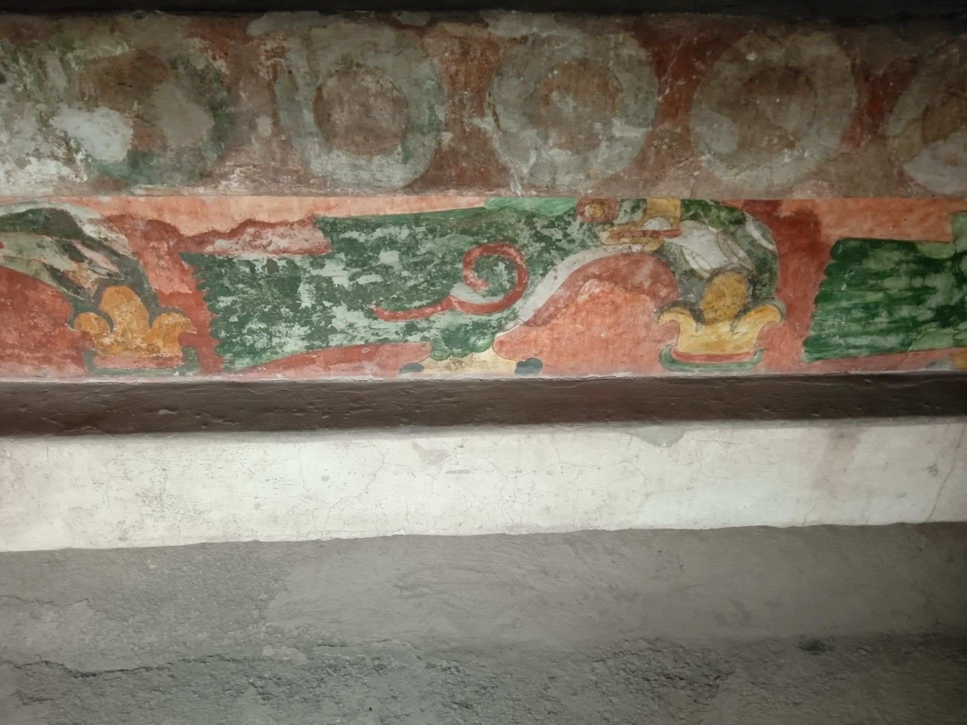 Es esta zona del sitio arqueológico hay también un área de exhibición subterranea, en la que destaca la conservación de los coleres de las pinturas que adornan parte de las paredes, y las tallas que adornan las columnas.