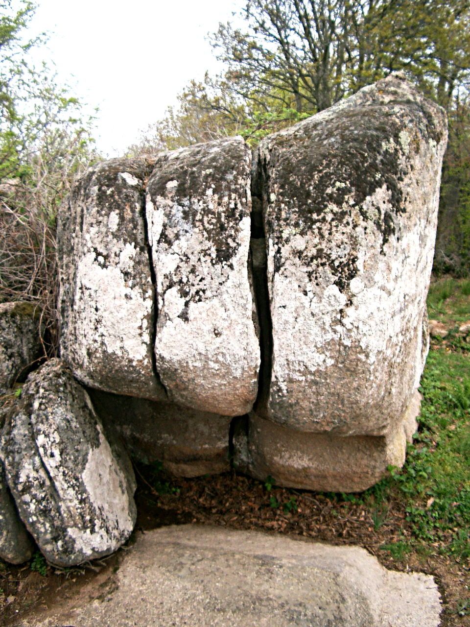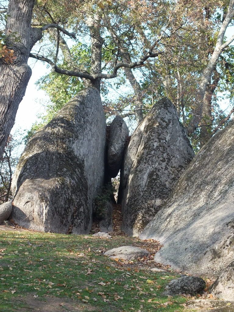 Right behind the “Big Heart”, the giant Monolith standing upright, we find another one, not much smaller. This one is laying flat, with one end lifted up in the air. What is beneath you will only discover walking around the rocks to the meadow below. The rock giant is not laying on the ground, but on the tops of two other big ones, building a huge confined space, a Dolmen. All three rocks with their sheer size, the smooth surface and round elongated shape remind me on three Whales, or of the wide open mouth of one even more giant whale. Aligned to the south it is light and warm in this space. ideal to meditate, and there is even a small rock in the center to sit on.