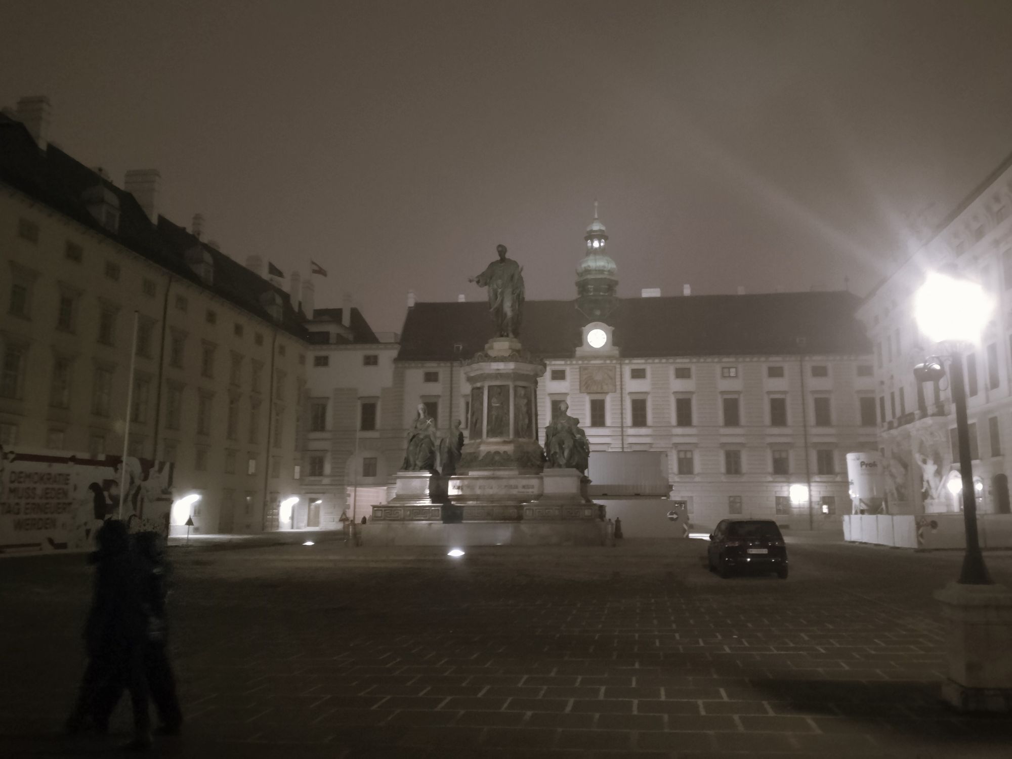 Na Korutanské ulici (Kärntner Strasse) se konala party ve stylu 80. a 90. let. Odtud jsme měli namířeno na Neuer Markt, který jsme ovšem minuli. Místo toho jsme se ocitli před Hofburgem. Ve srovnání s vřavou a proudícími davy v blízkých ulicích zde panoval klid. Překvapilo mě, že i v tuto dobu probíhaly prohlídky v Muzeu císařovny Sissi.