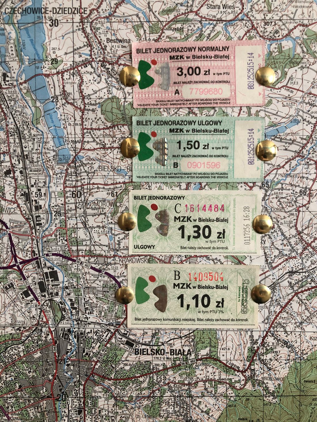 Na koniec 4 bilety z Bielska-Białej. Jeśli ktoś chce pozwiedzać miasto to nie musi korzystać z komunikacji miejskiej. Z Dworca łatwo przejdzie na Plac Chrobrego a stąd już rzut beretem do Rynku. Miasto urocze, położone na górzystym terenie, więc chodzi się w górę i dół. Z autobusu natomiast warto skorzystać jeśli chcemy wyjść na szlak. Wówczas wystarczy wsiąść w 8-kę, która zawiezie nas wprost na szlak. Leniwi nawet nie muszą na niego wychodzić, mogą skorzystać z kolejki. Ja jednak nigdy z niej nie korzystałem.