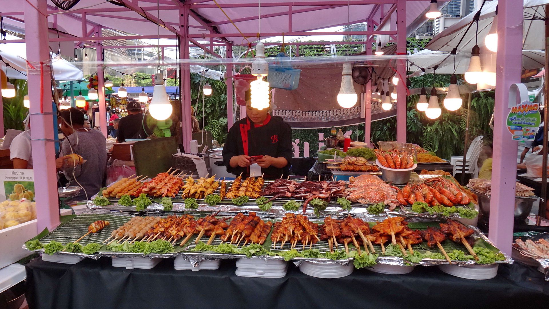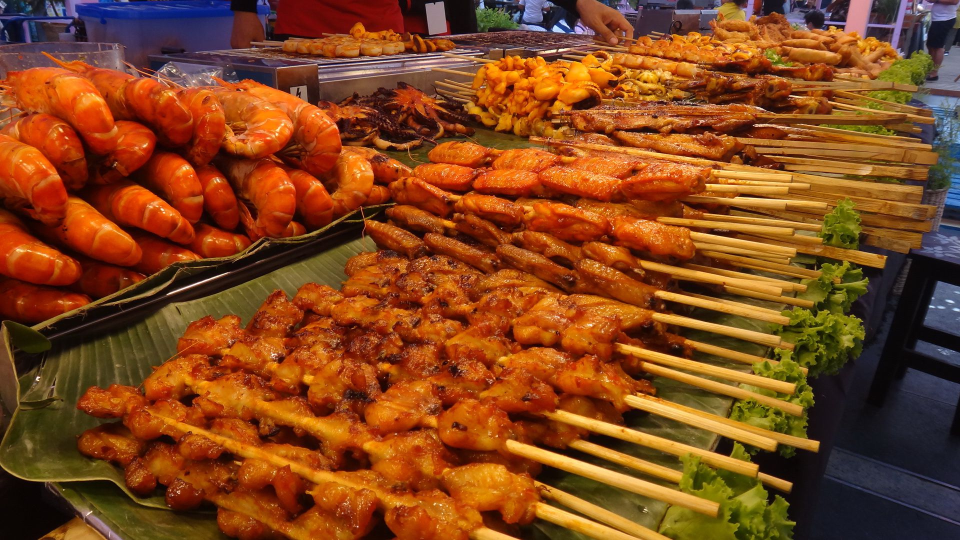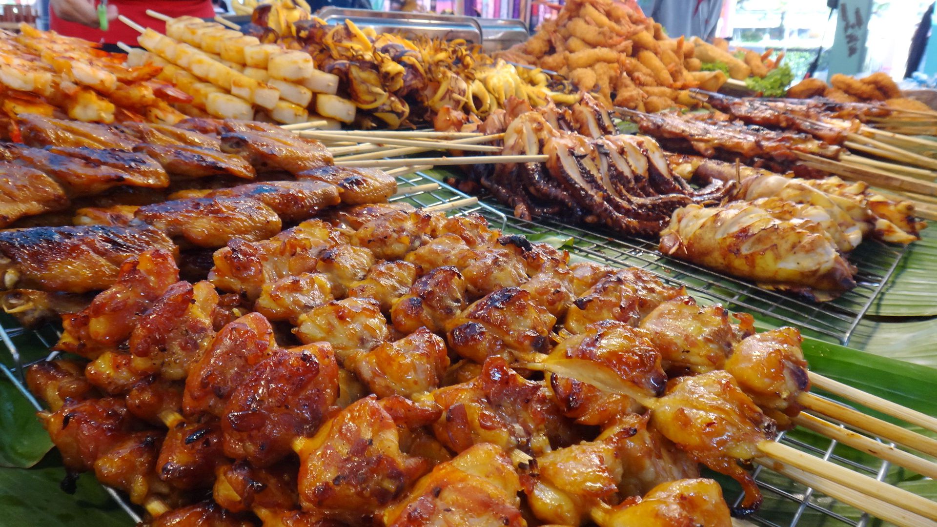 The choice of food on the stick is very popular in Thailand and the variety is in abundance it can be chicken , pork , beef , sausages , seafood and even veggies on the stick like mushrooms , broccoli , mixed in with a sausage wrapped in bacon if you like all on a stick how awesome and with what even sauce you prefer hot , mild or sweet.