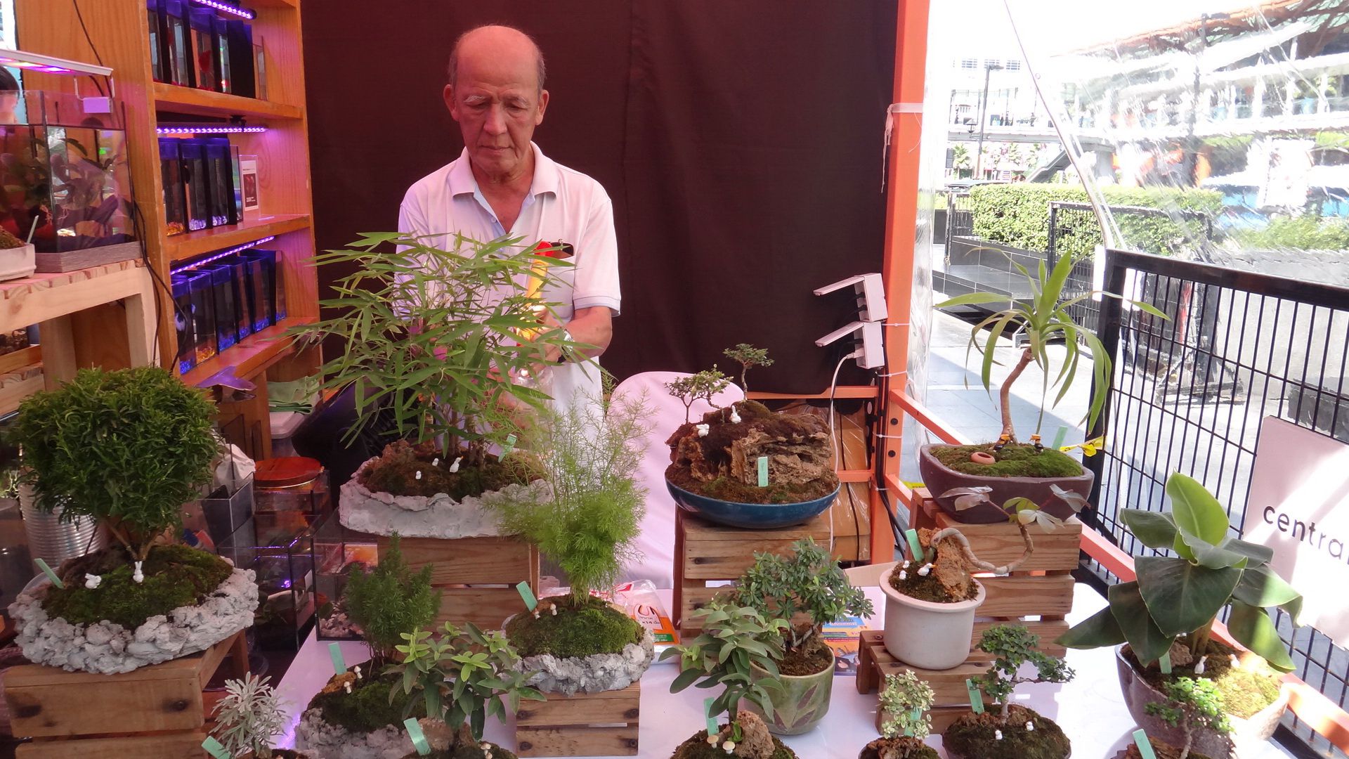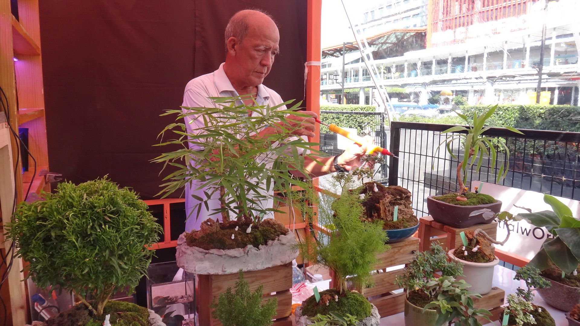 The Bonsai man keeping his precious Bonsai's cool on this hot day.