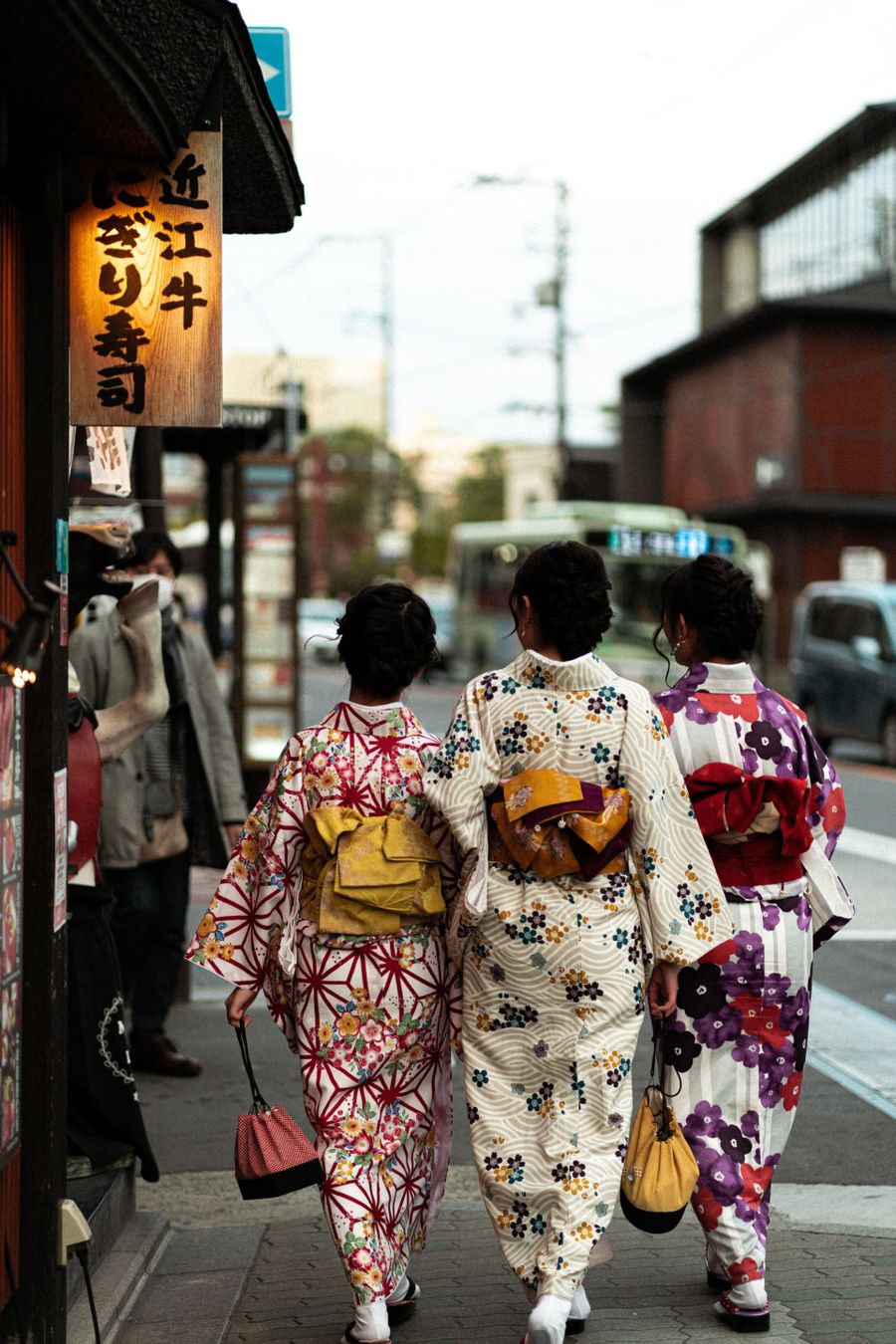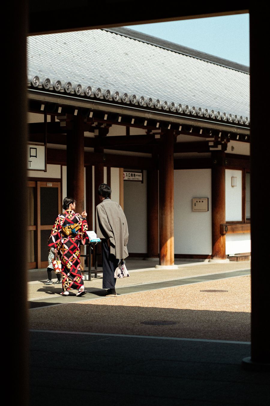Fortunately, Kyoto was an easy enough city to navigate on foot. Our plan was to avoid relying on public transport and walk the entire time, which seemed like the best way to discover some of the city’s major sights but also be able to feel its vibe. A 20-minute walk through calm avenues and a pretty bridge crossing the Kamogawa River took us to our first destination, the Sanjusangen-dô temple. It was no surprise we were the only foreign tourists there, something that had been happening quite a lot since we had arrived in Japan a week before, but there were plenty of local tourists at the entrance, many wearing traditional kimono garbs.