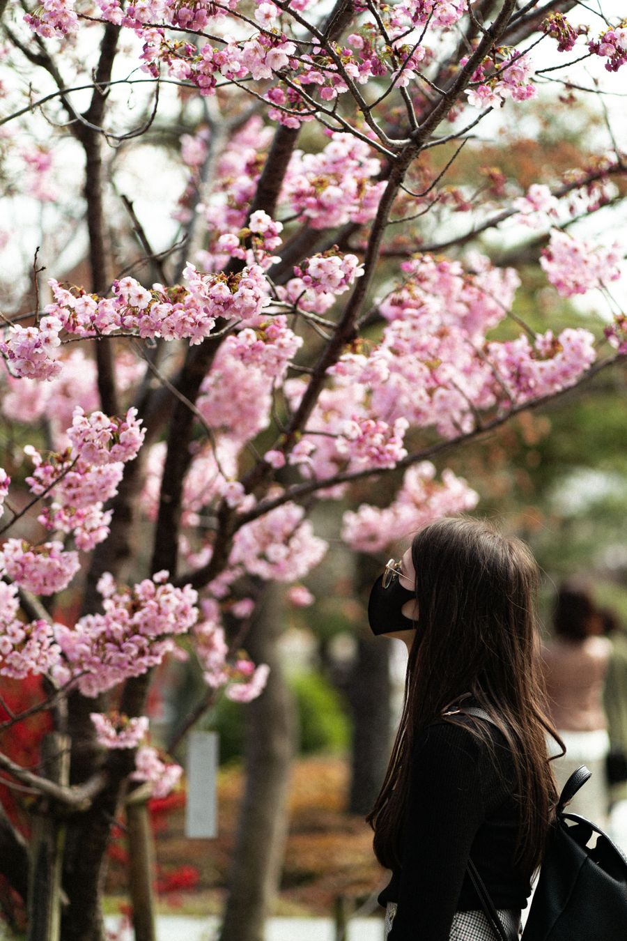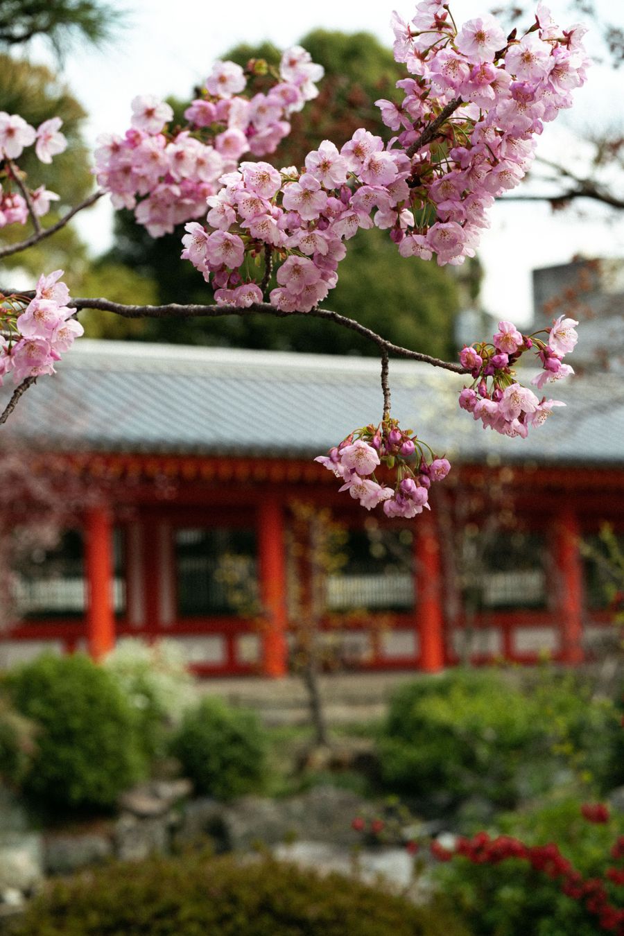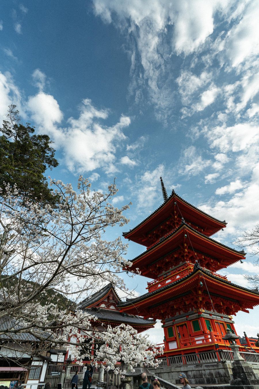 Cherry blossoms were less prominent when we arrived at the Kiyomizu-dera through an almost empty steep alley, whose souvenir shops had been all but deserted. The Temple of the Pure Waterfall Spring was one of the most popular cherry-blossom sightseeing spots in the entire city and it was a recurring theme all around us, from sakura-flavoured ice creams to sakura mochi, a sticky rice candy on a stick. Yet, sakura petals were blooming shyly at the entrance of the temple, contrary to a fully-grown plum tree, whose pristine white flowers perfectly contrasted the bright crimson of the temple’s pagoda.