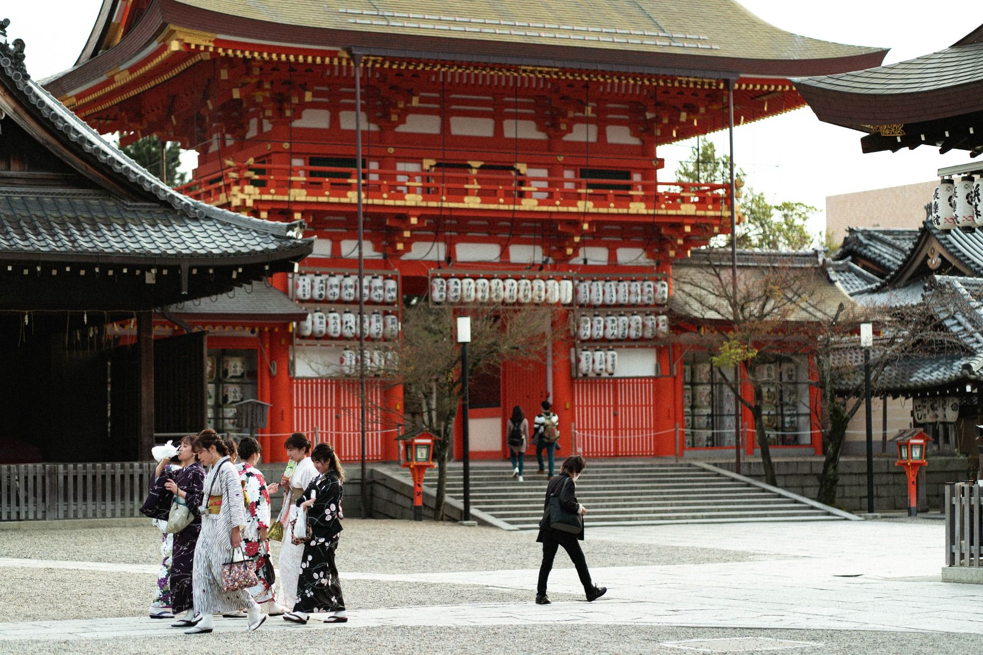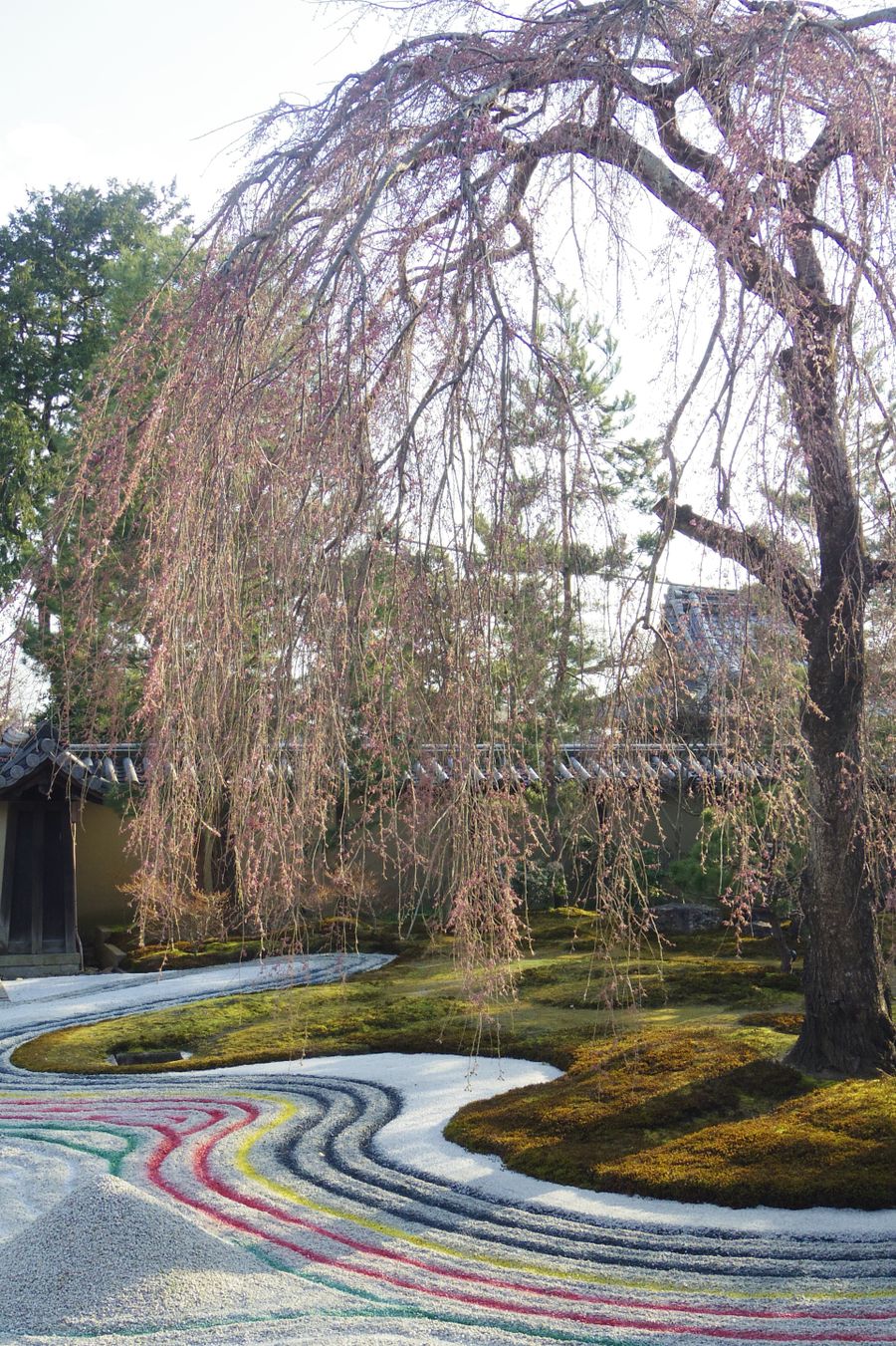 Our plan was then to head to the equally ancient and traditional neighborhood of Gion, which we eventually did after a few stops on the way. Located close to the Sannenzaka area, our path first took us to the temple of Kôdai-ji, a Buddhist peaceful haven renowned for its incredible zen gravel garden where a blossoming sakura tree was watching over an area of rainbow-like colored gravel the likes of which we had never seen. We then reached the bright red shintô temple of Yasaka, crossing through the Maruyama Park where we were greeted by a number of pretty pink petals.