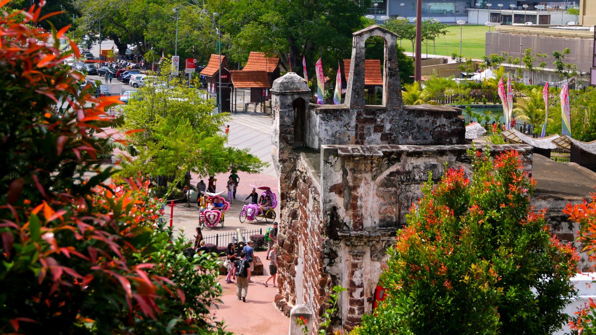 We then climbed up a hill near the Palace, that led to the ruins of the Church of St-Paul, the oldest church building in Southeast Asia, erected in 1521 by the Portuguese. From the original building, only a few walls still stood and tombstones carved with inscriptions and ominous skulls. Its location made it the perfect vantage point to admire the view on the ruins of the old A Famosa, a former Portuguese fortress which now consisted of a single gate house, the Porta de Santiago, firmly resisting the onslaught of time.