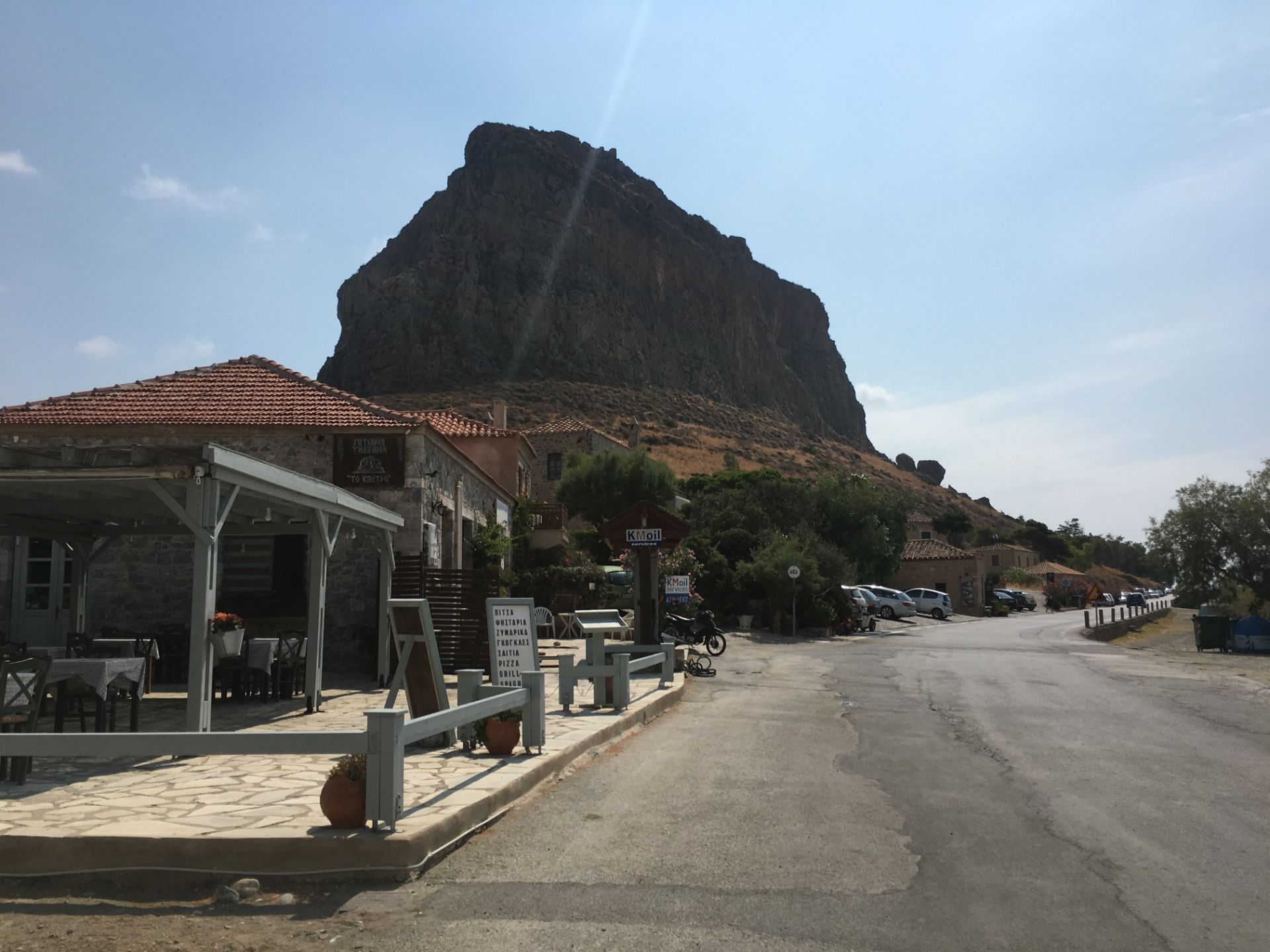 This was quite the imposing sight. Across the sea stood a massive, lonely rock that looked a bit like a stranded cruise ship or like the tip of a million-year old turtle shell. Monemvasia was known as the Gibraltar of the East or even as the Rock. Both names had a nice ring to them and they described the island quite aptly but they hadn't prepared us for that hypnotic vision anyway.