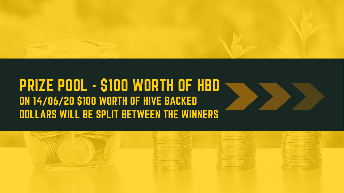 - The Total Prize Pool for this contest will be $100 worth of Cryptocurrency! On the last day of the contest, $100 will be used to buy as much Hive Backed Dollars (HBD) as possible.