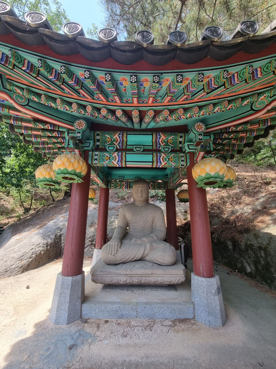 There are mountains...And there is a statue of Buddha in the mountains. That statue was brought from Geonju in 2018, and it was created around 110 years ago during the Silla dynasty.