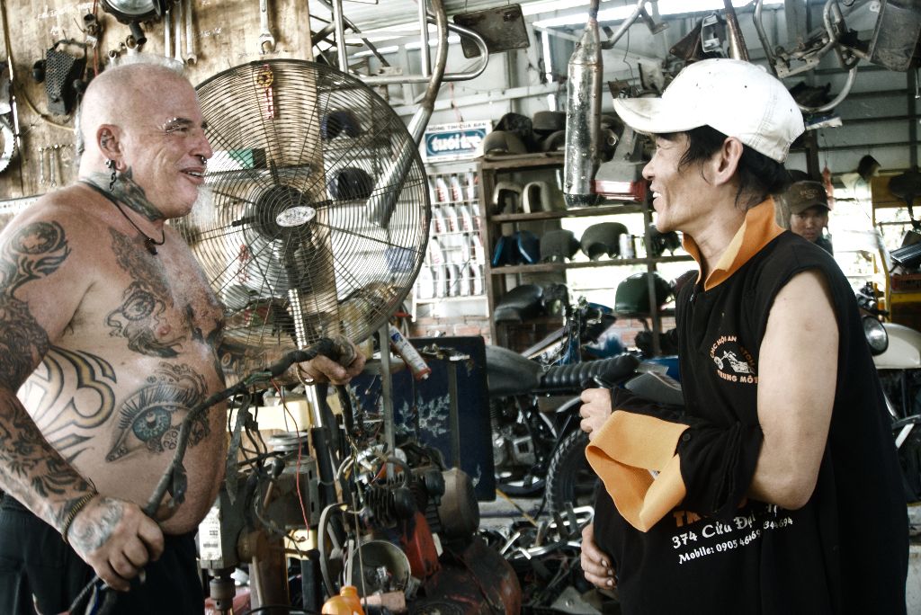 While waiting, I meet another expat, Arnold. Arnold is a 65-year young man covered in tattoos that left a job working state said heling kids with substance abuse. He just got back from Northern Vietnam, where he picked up a MONSTER of an old bike. A bike that Mr.Trung was helping him fix-up.