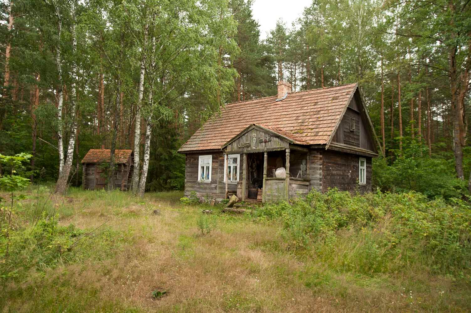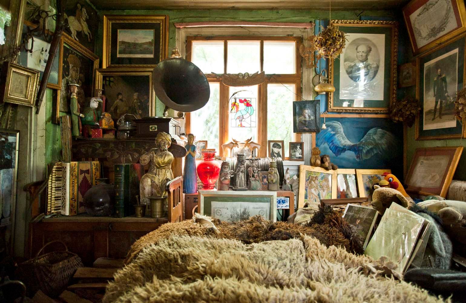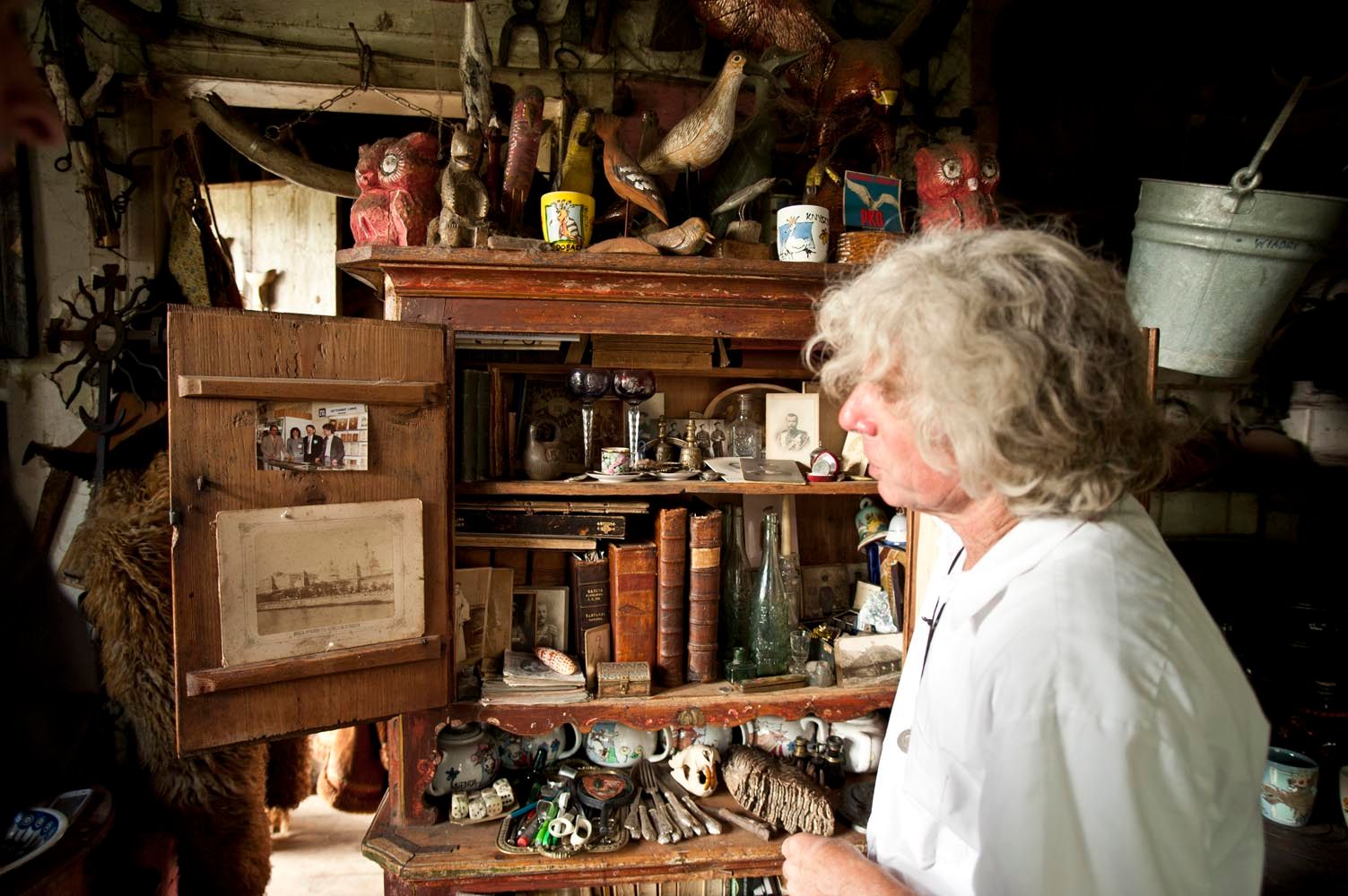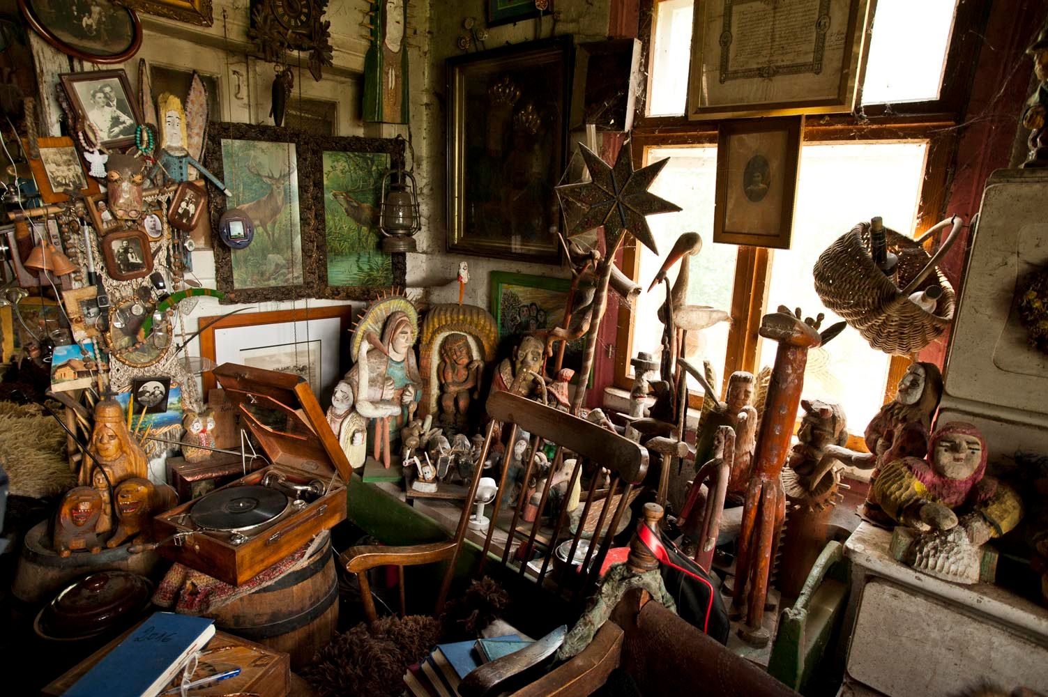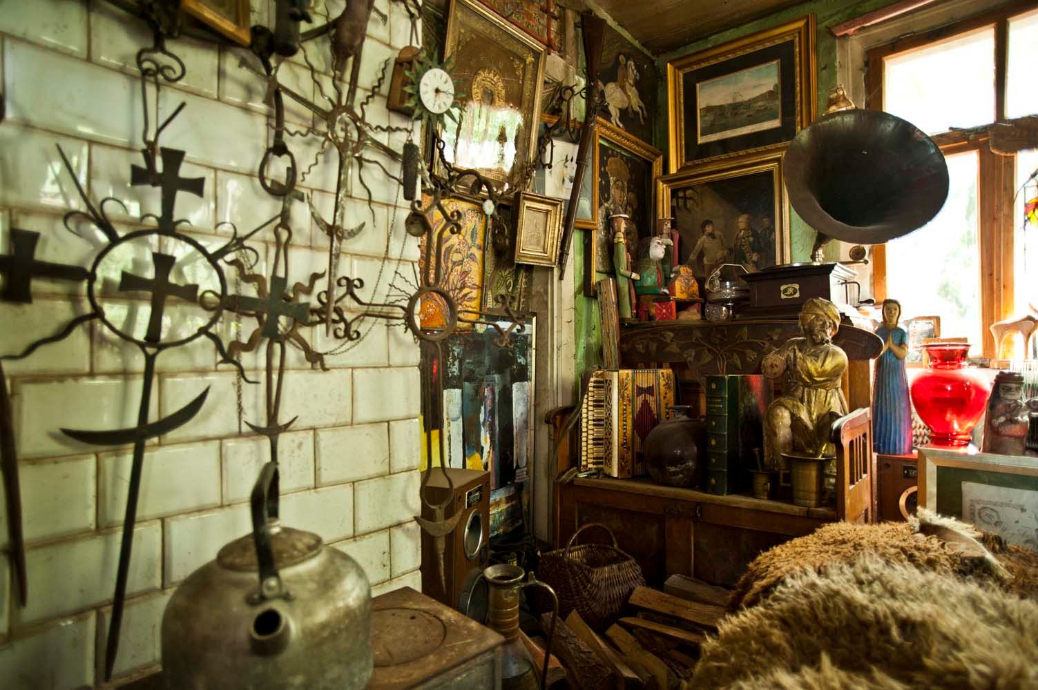 "King" invites me to the cottage. Just the entrance and the porch arouses my interest. Lots of different items here. Old wicker baskets, wooden sculptures, horseshoes, bells, farm tools. Everything looks like it's a hundred years old. The first impression after going inside is the incredible narrowness resulting from the huge amount of various artifacts accumulated here. First of all, there are wooden figurines of various sizes - from ordinary people, through religious figures, animals, to terrible demons. The walls are full of decorations - paintings, photos, diplomas, wrought iron crosses, kerosene lamps, old clocks. On shelves and archaic furniture - books, books, parchment scrolls, dishes, turntables, accordion, vases. Virtually every item looks antique. Mr. Krzysztof opens one of the cabinets. It shows documents and photographs related to both Polish and Russian history. It has many memorabilia of the former Osówiec fortress, whose ruins are located a few kilometers up Biebrza. As it turns out, many items Mr. Krzysztof bought from the locals. However, he brought most of the old books from Warsaw.