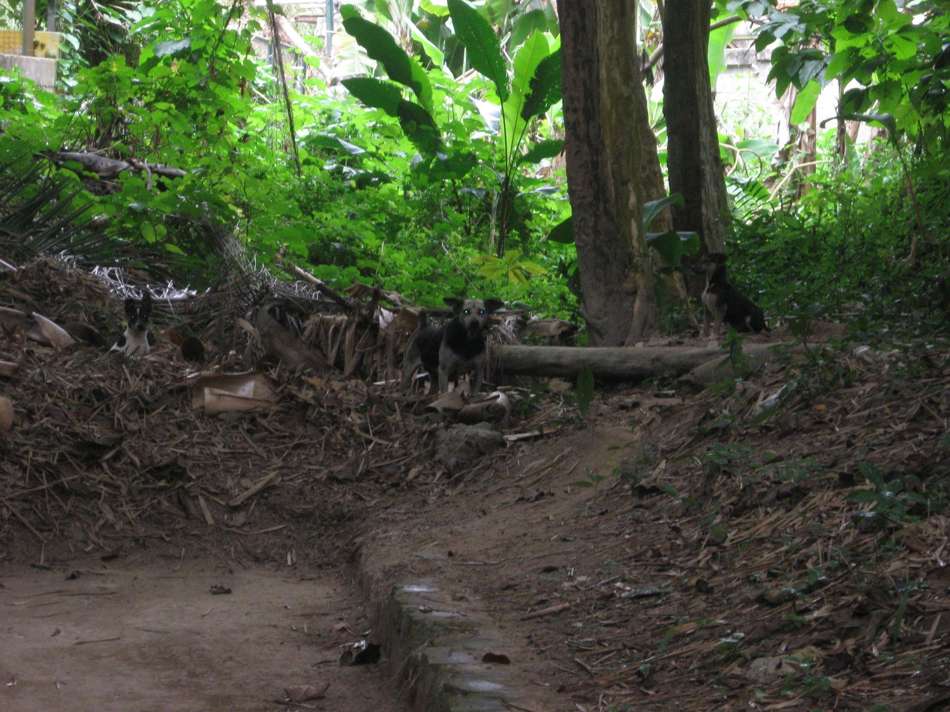 We follow the path and begin to descend to the area of Camatagua Creek, commenting on some botanical species. He emphasized the beauty of yellow bamboo. Some stray dogs had their lair around them.