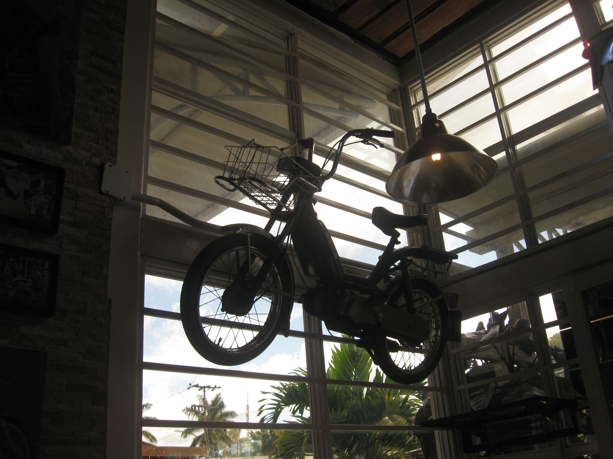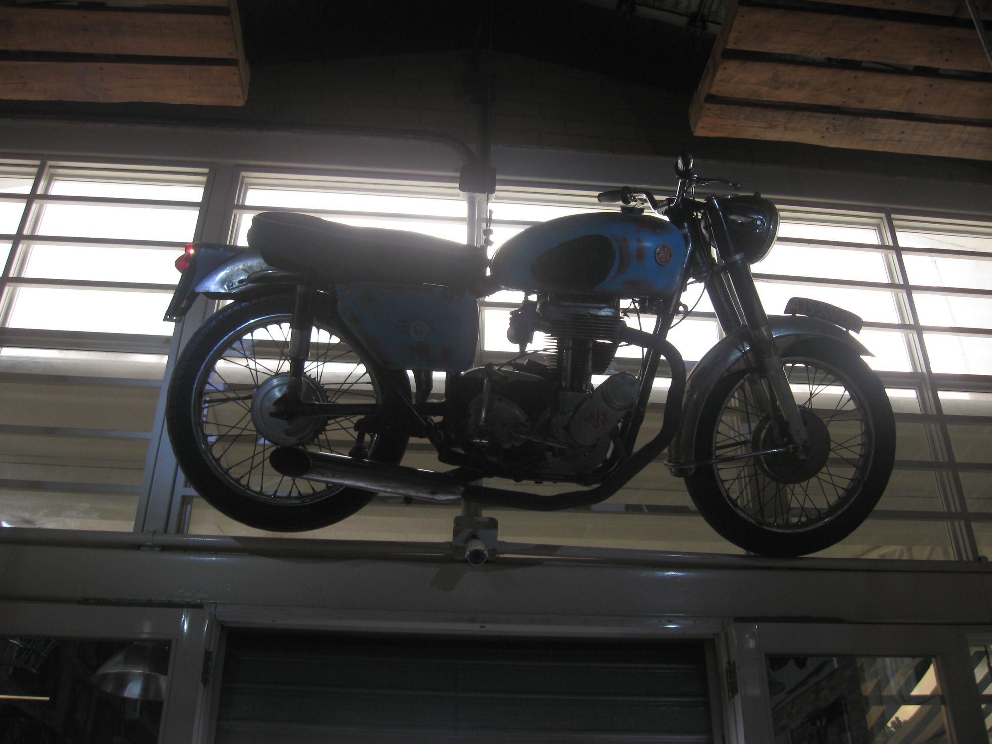 The motorcycle suspended above the bar caught my attention, the young man told us that it was a 1965 BMW, that is, he was practically my age. I think it is not as old as it seems, and who removes! If we lower it, it may work.
