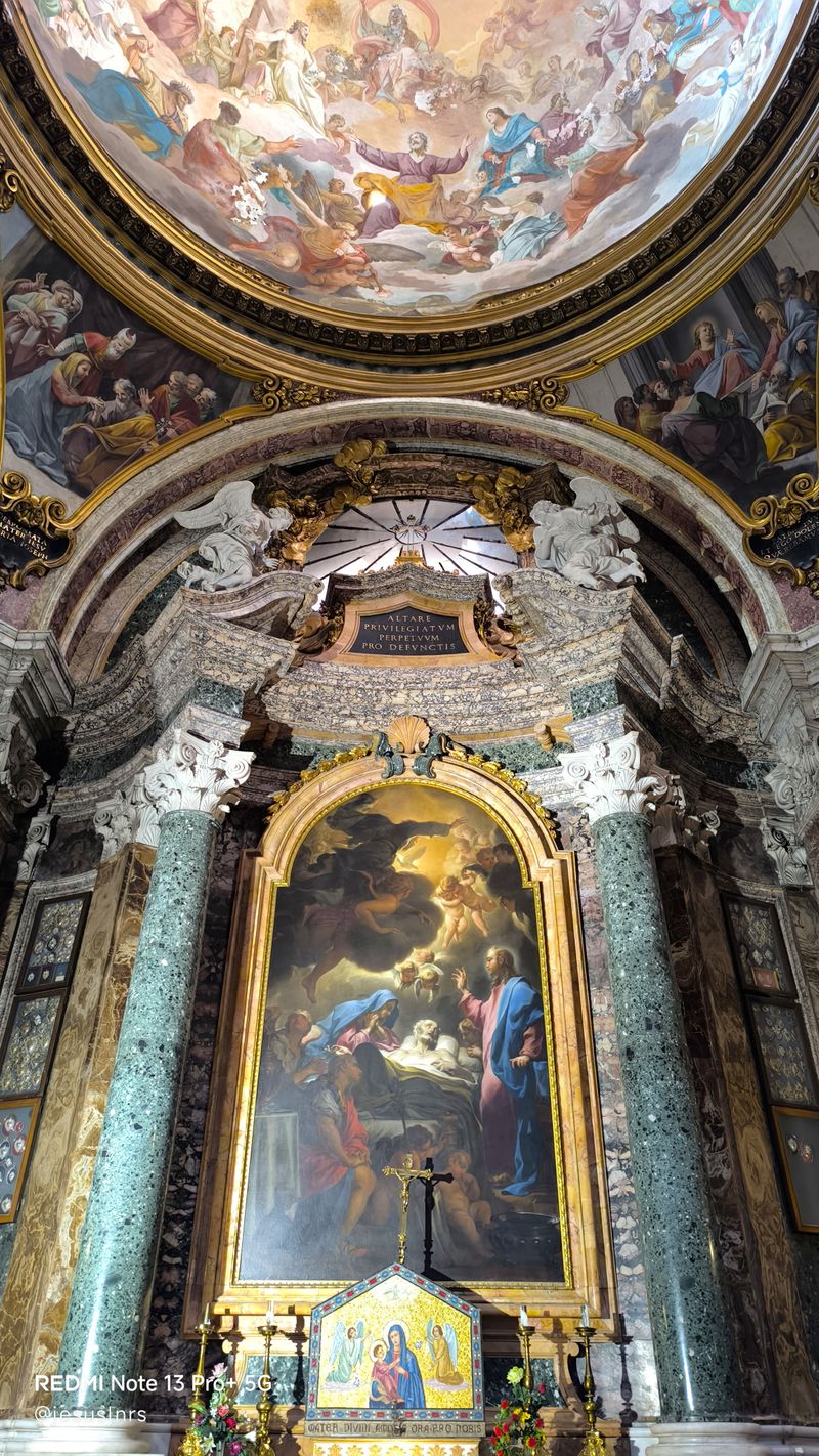 Like good tourists, we tried to take selfies with the church ceiling as a backdrop, but wow, it was complicated! That's why, even though entry to this church is free, people form a long line inside to take a picture with a large mirror in the middle of the aisle, reflecting the ceiling above. To save time and money, we preferred to do it the easy way, as we say in Venezuela. The bad thing is that none of the photos turned out well, but we do have the memory of that adventure among the four of us trying to take selfies. Before the altar, you can see a very dark dome, but it turns out that there's actually no dome at all; it's another painting on a flat surface. I couldn't believe how many visual effects you can find in this church in Rome—simply impressive...