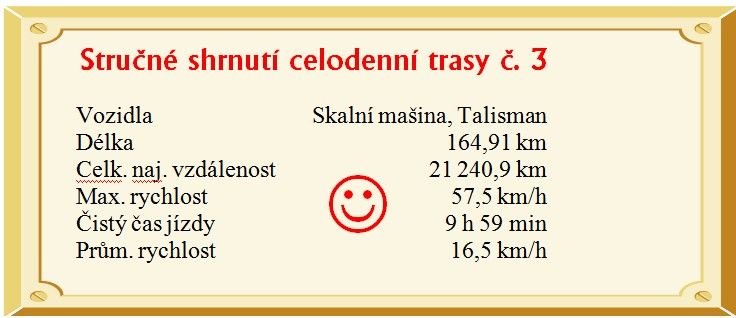 Projíždíme pod hradem. Působí monumentálním dojmem, zvláště proti zatažené obloze. Naše nadm. výška je 530 m. Neúnavně opouštíme městečko a stále stoupáme. Na 107. kilometru projíždíme kolem pohostinství Hubertus. Sbohem, říčko Teplá, ztrácíš se nám dole v údolí. 108,3 km. Stoupání stále pokračuje. Stále se neměnící obraz krajiny začíná být ubíjející. Stoupáme, nikoliv však neúnavně. Snad se někdy ocitneme nahoře. 110,5 km. Dočkali jsme se – vrchol kopce! Krajina se konečně mění, vidíme pole a v dáli malé kopečky. Prům. rychl. 15,2 km/h. Relaxujeme na volnoběh.