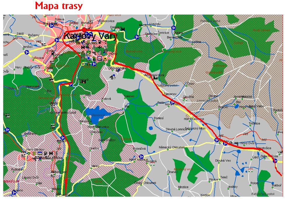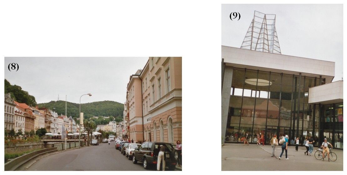 DRAHOVICE, nadm. výška 370 m. První zmínka r. 1434. Karlovy Vary, hlavní pošta, východiště značených tras. My pojedeme po žluté značce E3 – cyklostezce 1,5 km doprava. Většinou pěšky se proplétáme rozkopanými ulicemi. Lidí stále přibývá. Žlutá značka se nám zanedlouho ztrácí. Stojíme před hotelem Thermal, (7) zakupujeme pohledy a pokračujeme dále při říčce Teplá, která nás bezpečně povede. Všude se pilně rekonstruují budovy. Není tu snad jediný dům, který by byl zanedbán (8).