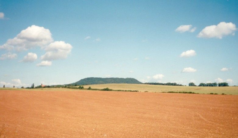 Znaveni stoupáme do 16 % kopce po svahu Chlumské stolové hory. 8:40. Na vrcholu kopce staneme spolu s klepajícím se polským Fiátkem. Naskýtá se nám pohled na okolní hory; a když se ohlédneme dozadu, vidíme i silnici, po které jsme svištěli do Manětína. Opouštíme poslední sochu. Ujeto 31,4 km.