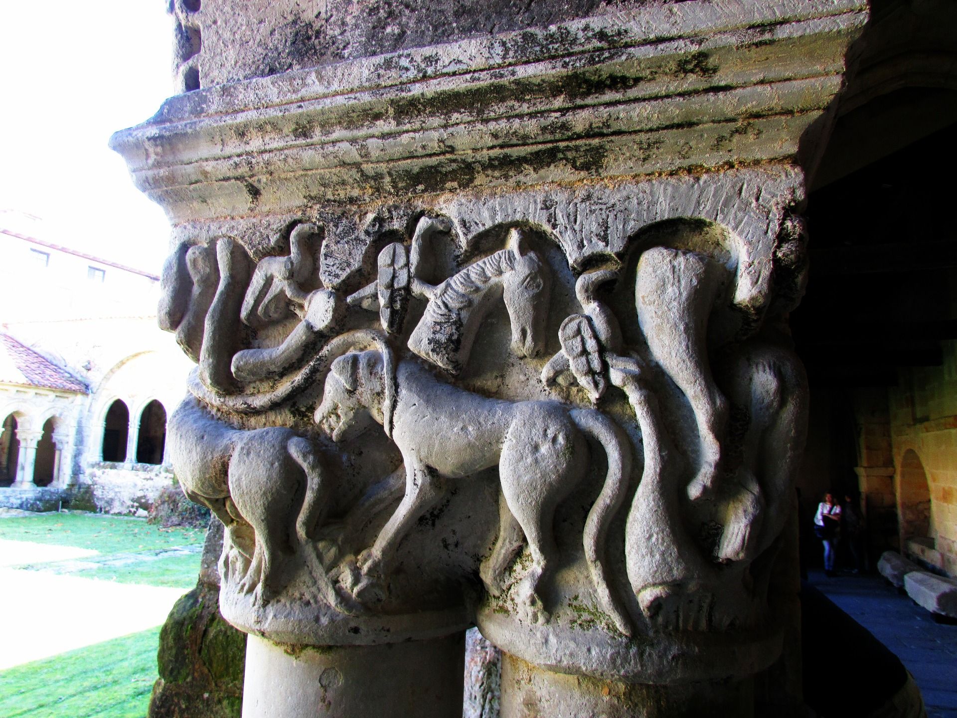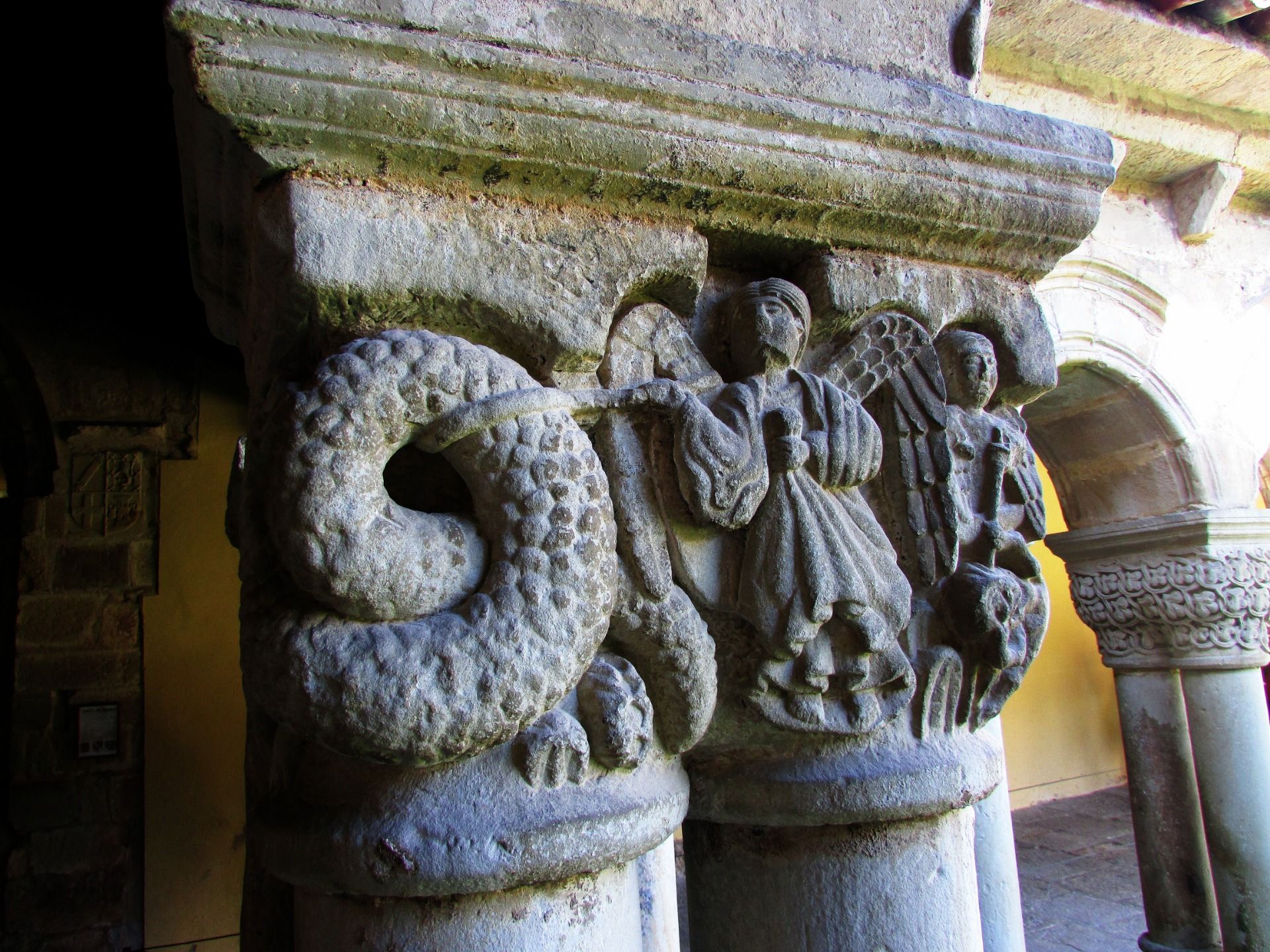 It is not surprising, therefore, that on this north side, between some chiaroscuro that the sun's rays can barely penetrate, a curious capital reminds us of the terrible struggle of the archangel Saint Michael with the fierce snake, which this phenomenal representation acquires dimensions really monstrous as corresponds to the terrible Cuélebre, the serpentón or dragon of the ancient Cantabrian-Asturian mythology.