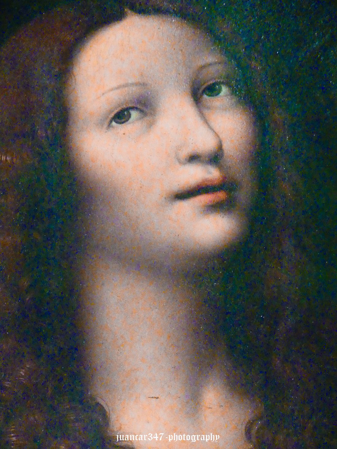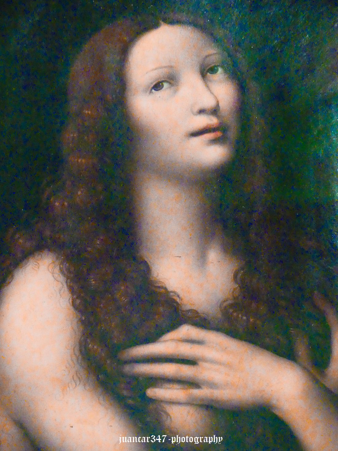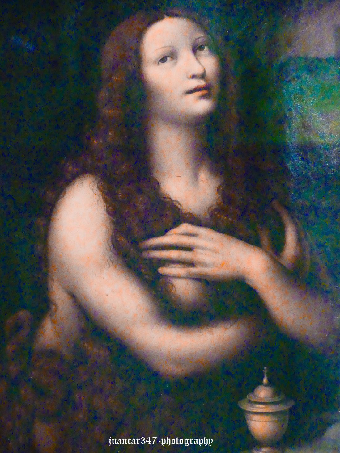 But once located, it induces a seductive contemplation, because, even showing one of the most controversial figures in the history of Christianity and beyond, in world history, Mary Magdalene, we see in her that familiar disposition of Leonardo's face, with a familiarity, a mischief, and a hidden mystery, which takes us back not only to that wonderful Mona Lisa, analyzed even by Freud, but also to that other marvelous young adolescent Savior, painted by another of his privileged students, the prolific Giovanni Antonio Boltraffio, who makes us think, even resorting to the powerful paths of speculative reverie, of that androgynous ambivalence of Leonardo's works, in what, possibly, even C.G. Jung would have seen as a perfect conjunction of opposites: the definitive balance between two soul concepts tending toward reconciliation: the anima and the animus.