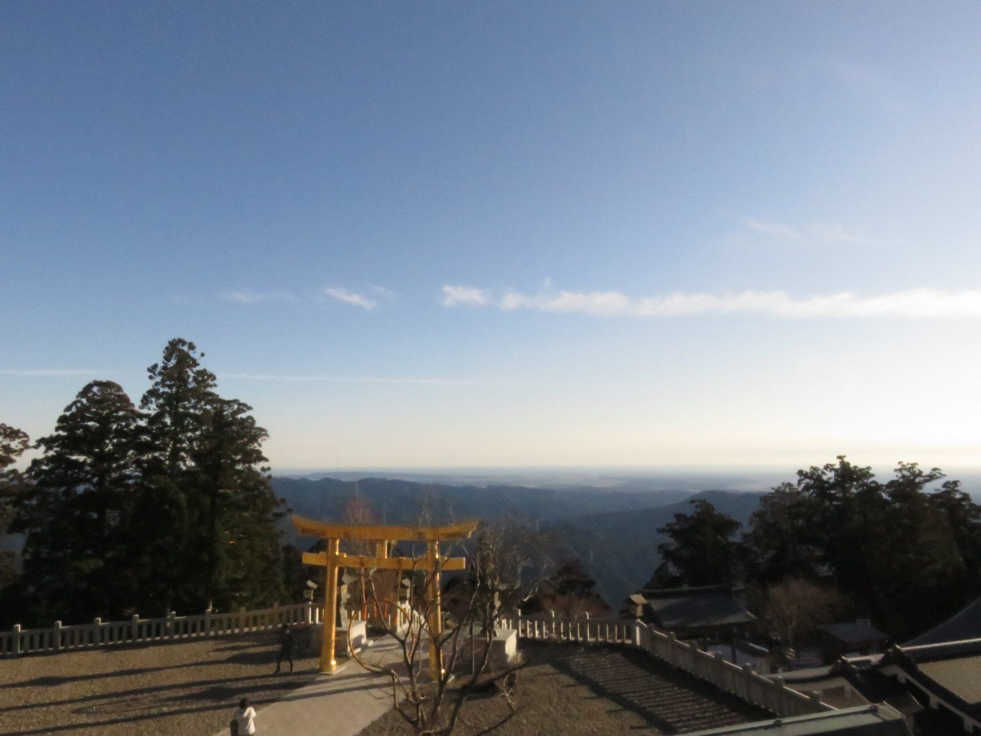 After the bottom shrine, we went to the top one. This one is much bigger, lots of people were there, you can buy three small plates and throw them off the cliff and try to get them through the straw ring below, for luck. You can also see a great view from the top of the shrine.