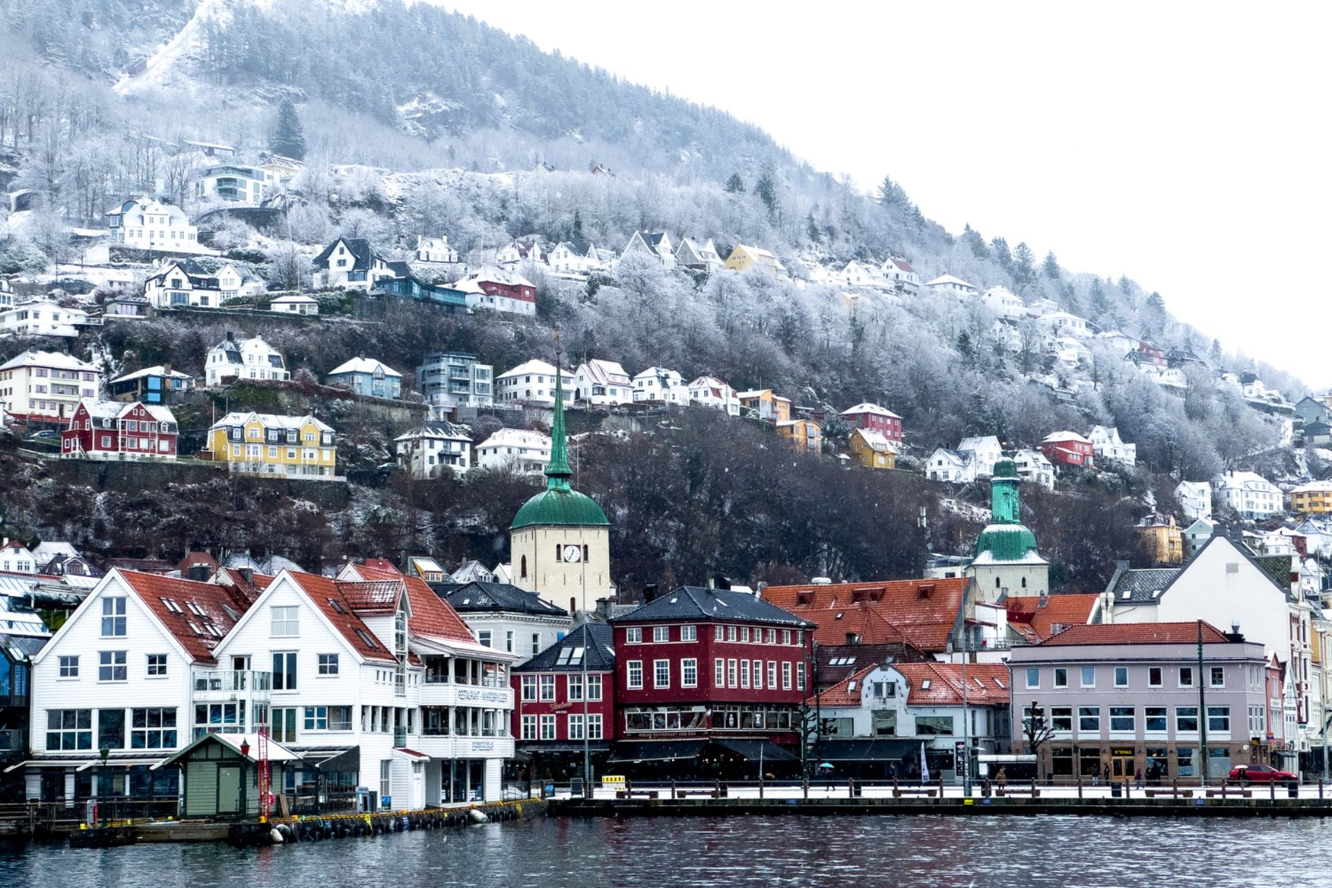 Bergen charakteryzuje się klimatem umiarkowanym morskim. Zimy są to łagodne i częściej deszczowe niż śnieżne. Kiedy przybyliśmy do miasta nie było prawie wcale śniegu. Jedynie w wyższych partiach. Temperatura balansuje raczej w granicach zera a wysokie mrozy są tutaj raczej rzadkością. W przeciwieństwie do ciepłych zim, lata są tu raczej chłodne i również deszczowe co czyni Bergen jednym z najbardziej deszczowych miast Europy. My jesteśmy tutaj dopiero dwa dni a już zetknęliśmy się z przeróżnymi warunkami. Od słonecznego dnia, po silny wiatr i naprzemienne opady śniegu i deszczu. Wszystko jednak przy temperaturach w okolicy 2-5 stopni Celsjusza. Na dwóch zdjęciach poniżej zobaczycie, jak zmieniła się aura Bergen na przestrzeni około dwudziestu godzin.