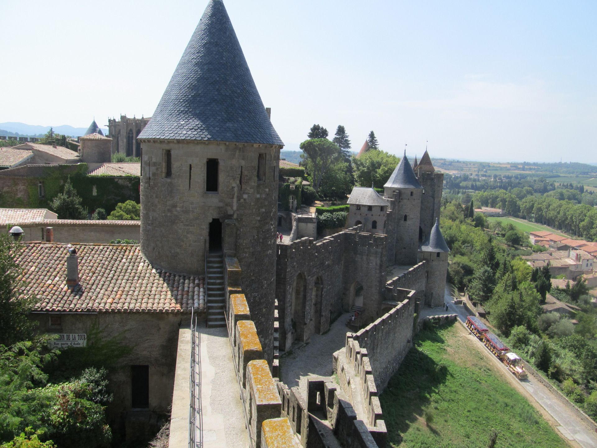 Carcassonne was founded as Carcasso by the Romans in the 1st century B.C. on the site of the present Cité. The towers with a horseshoe-shaped ground plan in the inner wall were typical of the Gallo-Roman period. As I have already told you how long the walls were, you can imagine the size of the area on which the fortress was built: Fourteen acres of it. In the Middle Ages, 3,000 to 4,000 people could live here. I don't know about you, but for me it would be a strange feeling to live in such a fortress, which is also a bit above and therefore isolated from the other inhabitants in the area. Everyone else works for tourism and lives outside. The Cité is an extensive open-air museum used by tourists and normally not accessible for cars.