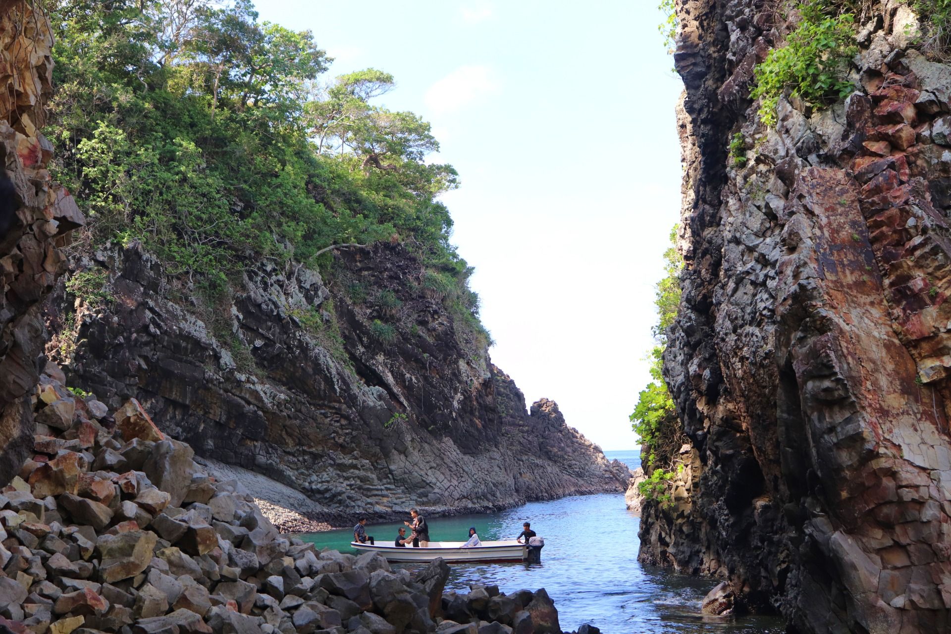 At the location of this first cave, there are two hills of the rock, I think this is not a hill because too small, but still good to be the background of photography. I have seen that someone was climbing the rock hill here without safety and taking a selfie up there. So careless. When taking a picture I also see some foreign visitors riding a speed boat to see this beauty and they are just staying in a speedboat to see all of this. I don't think it's interesting, because they don't feel the sensation of walking. Hahaha