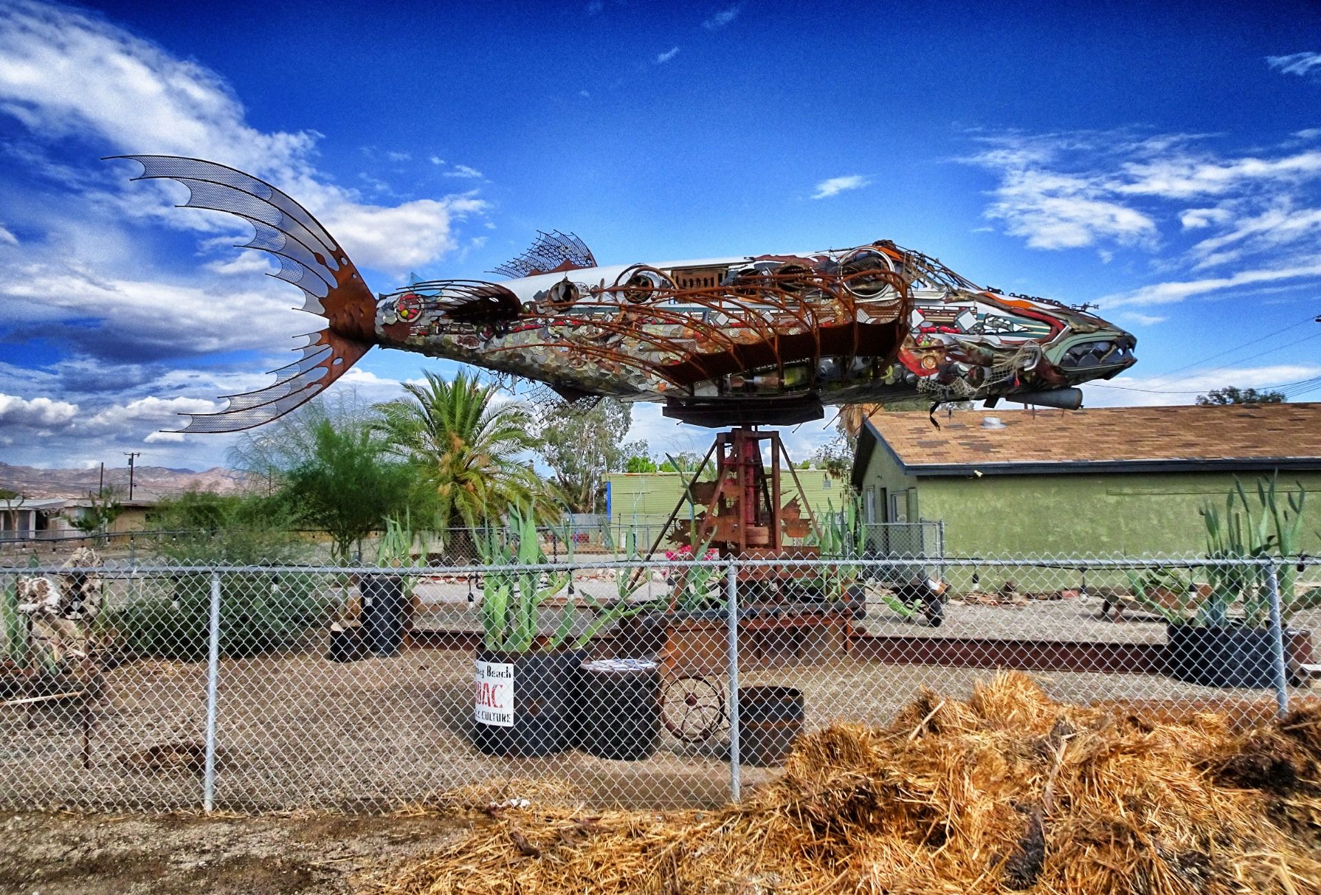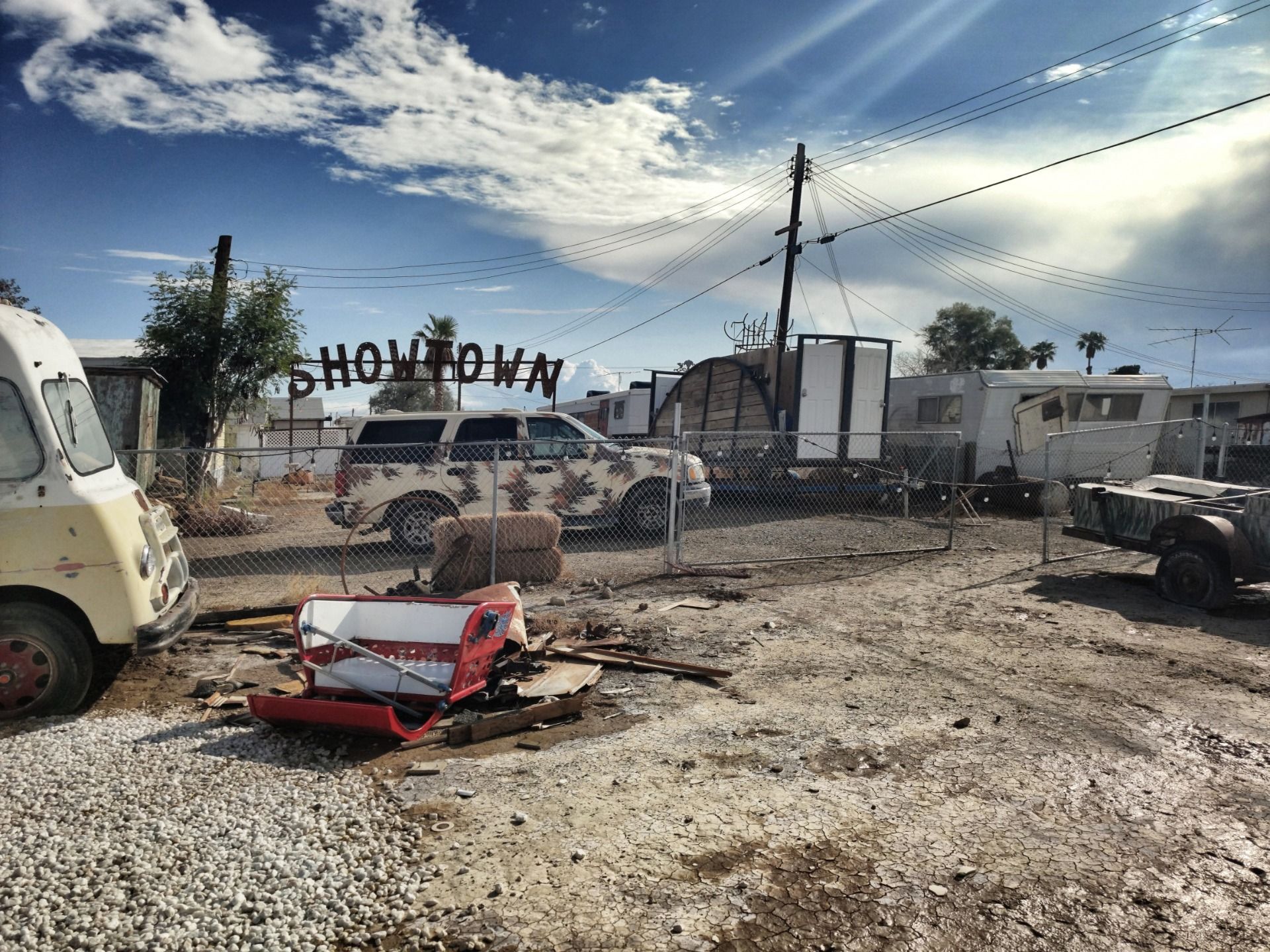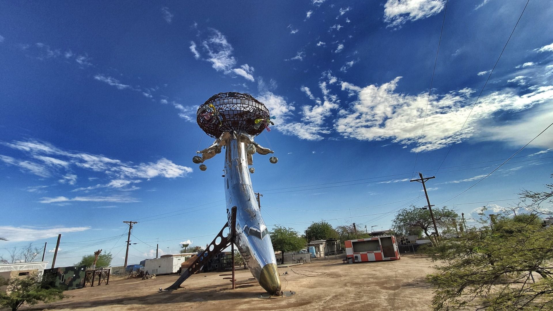 It should be art now thats save the former paradise and the 200 residents. They drive around with golf carts in the village because the next petrol station is 65 km (40miles) away. But they have a shop for food and liquor, they have a bar and the had a car cinema made from a dozen of rusty and rotten classic cars. In front of this bizarre place Hermann said, a neighbor on the small and dusty street, you can find the hugest camera of the world.