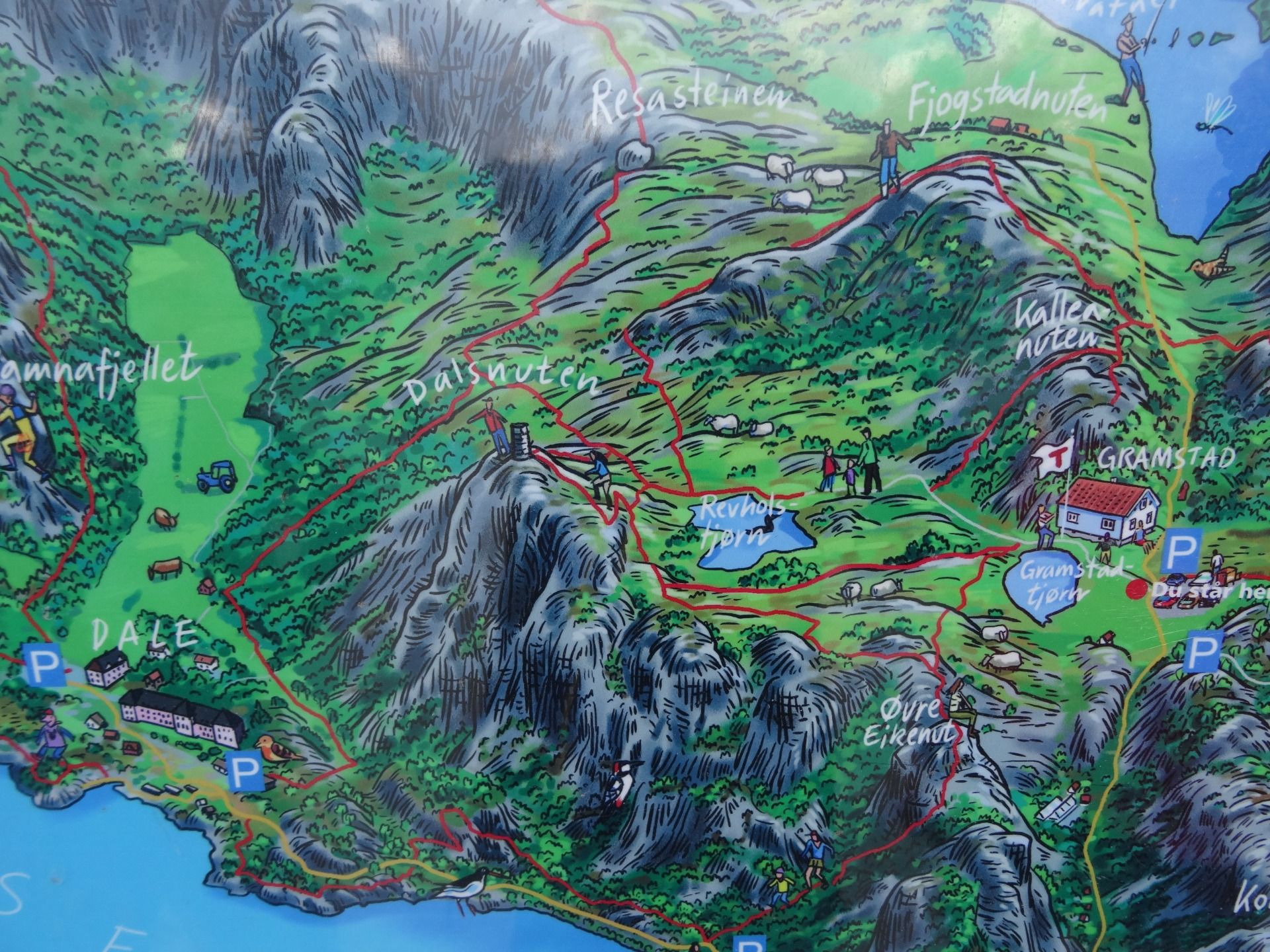 You should not be worry about the lenght of ther trail or the difficulty of the paths. Right from th parking lot at the start or the bus station – we were there by Bus 29 of the perfect norwegian public transport system from Sandness towards Dale, and getting out in Gramstad - you have to go two to four hours for the whole thing. It’s easy at the beginning. Wide is the path, green the grass all around. You walk through a forest an dover some fields. There are a number of marked trails in the area, but you have to go straight ahead to the peak.