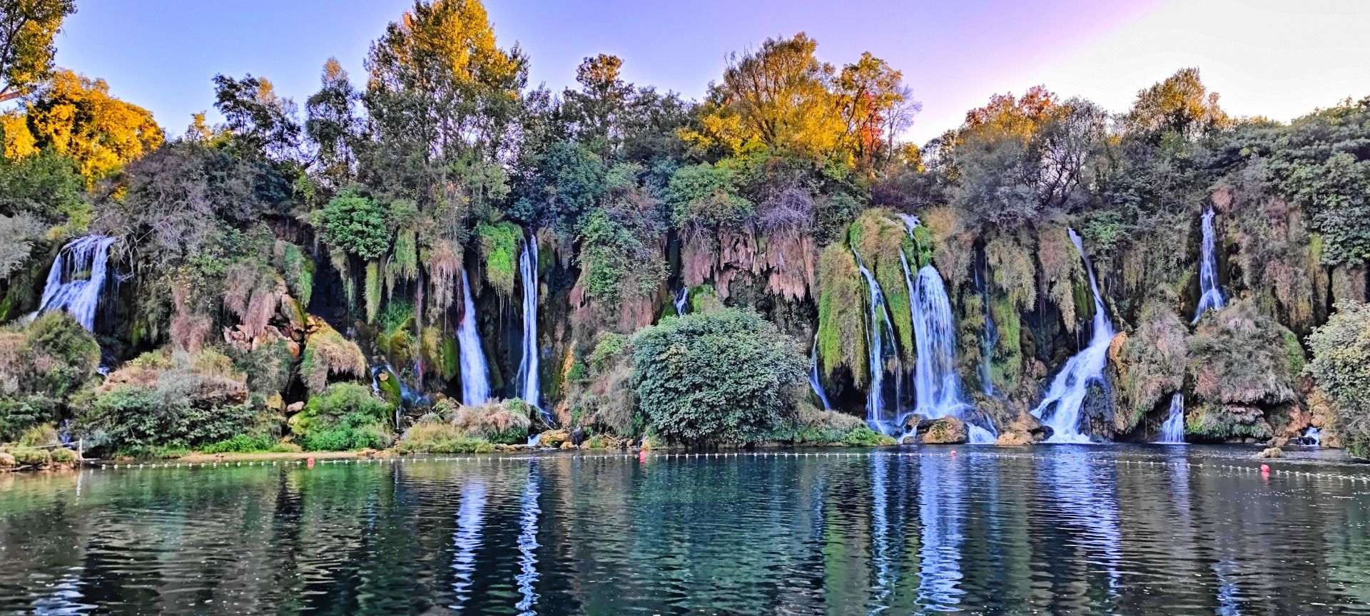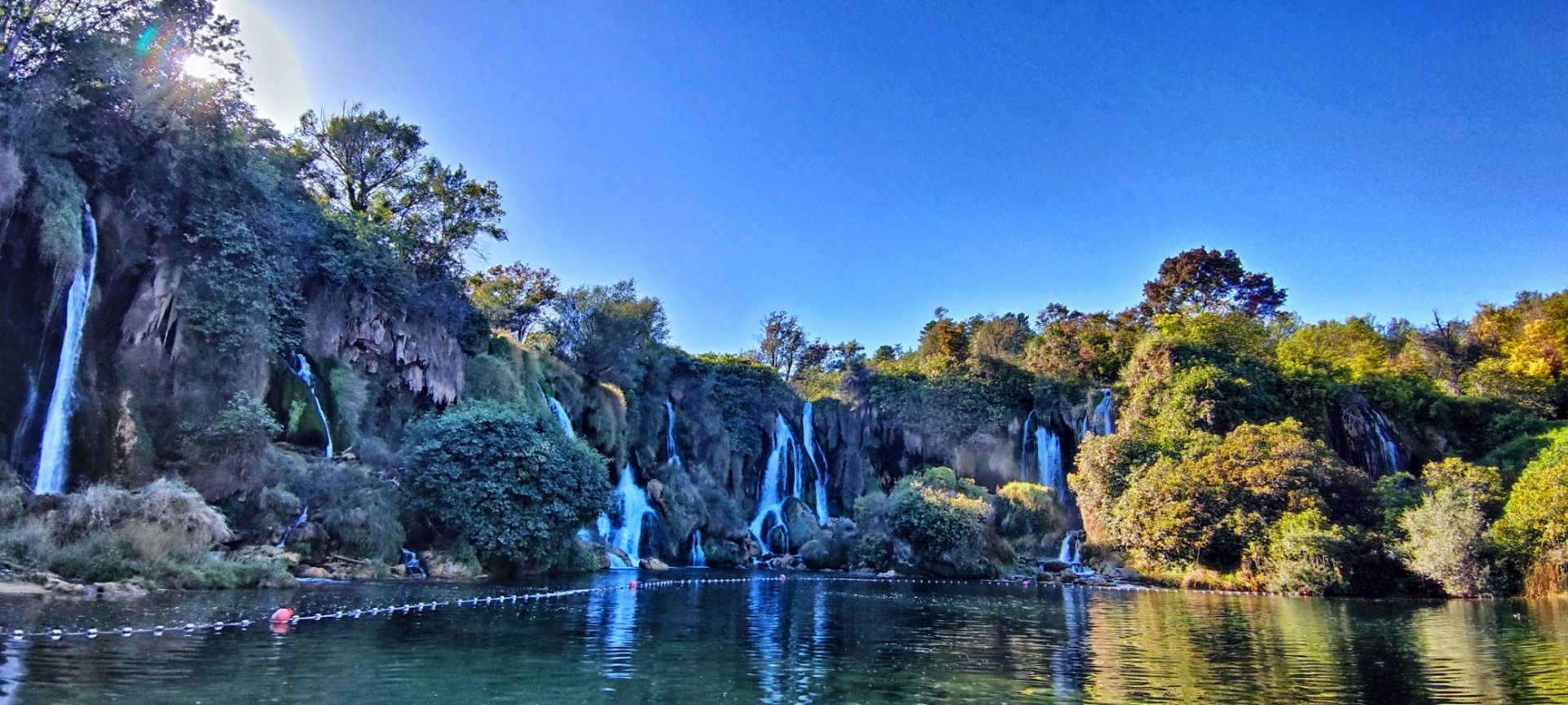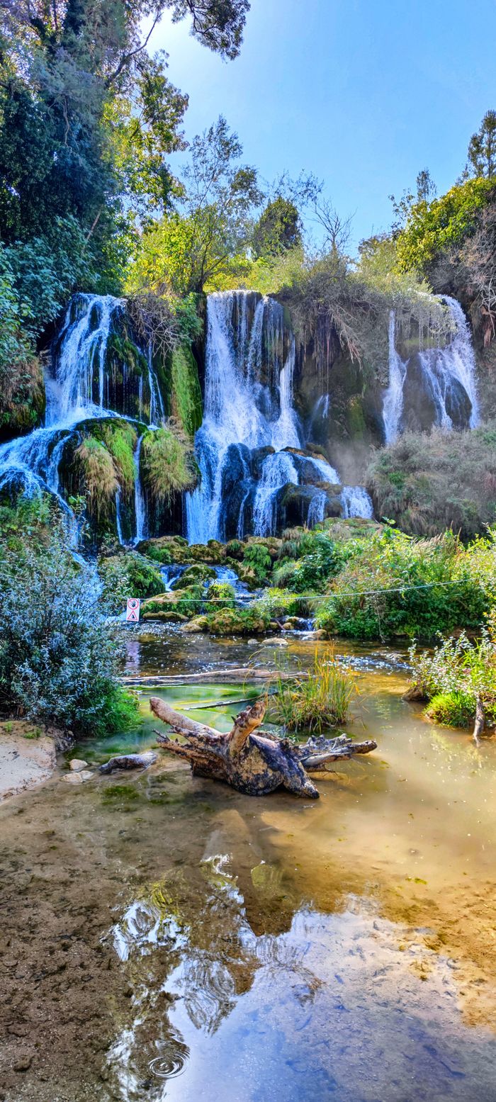 The various waterfalls are between 26 and 28 meters high, coming down a semicircle 120 meters wide. At the bottom they form a small lake before the water flows on. It comes from the small river Trebižat. This rises further north in Herzegovina and, together with its much larger brother the Neretva, flows through Bosnia via Croatia until it finally flows into the Adriatic Sea.