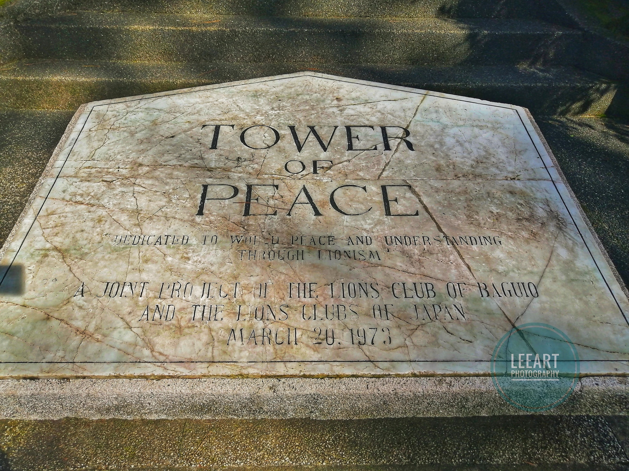 The tower is in the middle and a white marker is placed below it stating "Dedicated to world peace and understanding through Lionism." It further states that it is a joint project by Baguio and Japan dated March 1973.