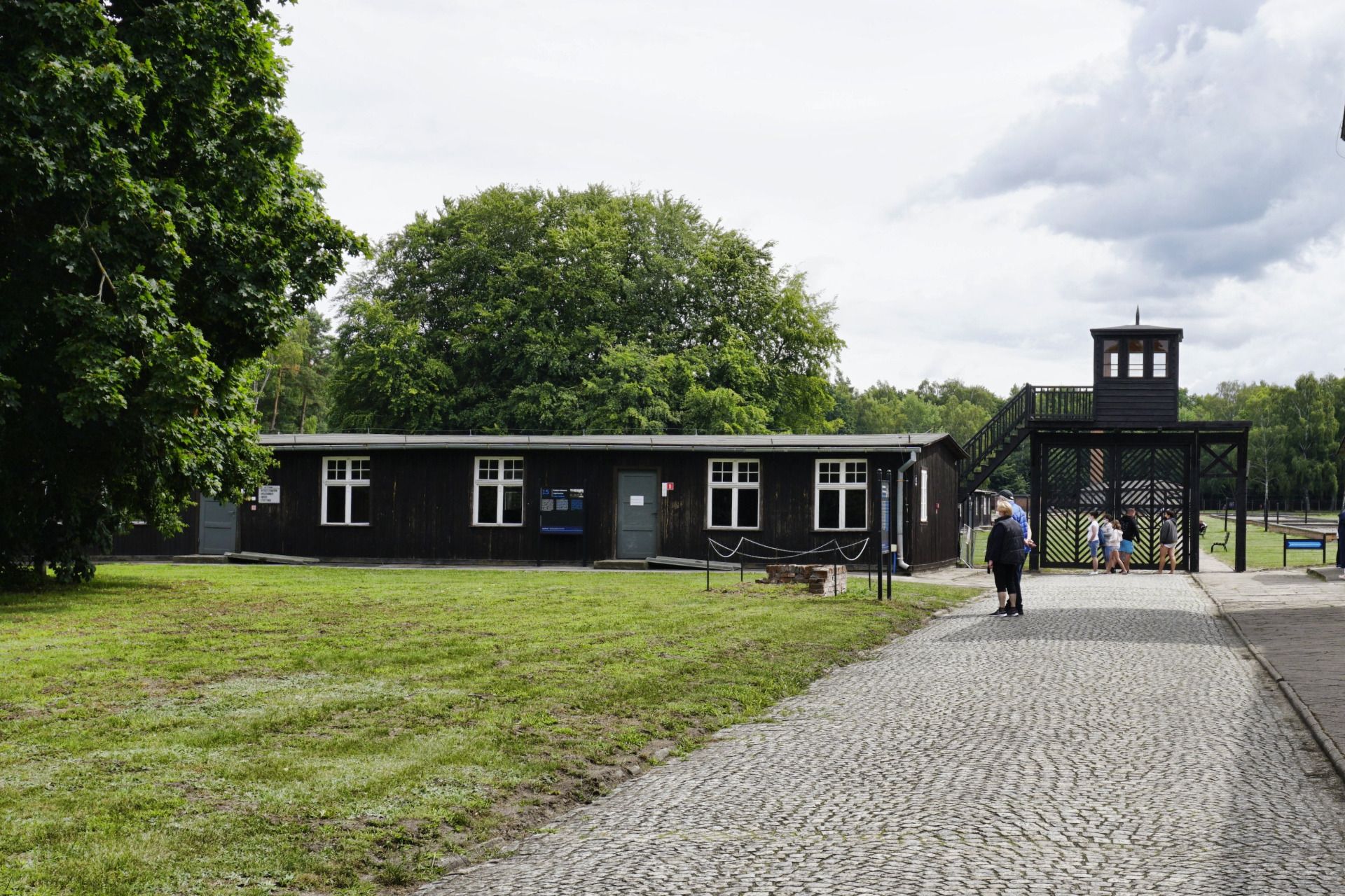 Po wiejściu na teren obozu po lewej stronie jest budynek wartowni SS, gdzie teraz mieści się punkt informacyjny i sklep z pamiątkami. Po prawej stronie natomiast wita zwiedzających monumentalny budynek komendantury, gdzie obecnie mieści się kino i sale wystawowe.
