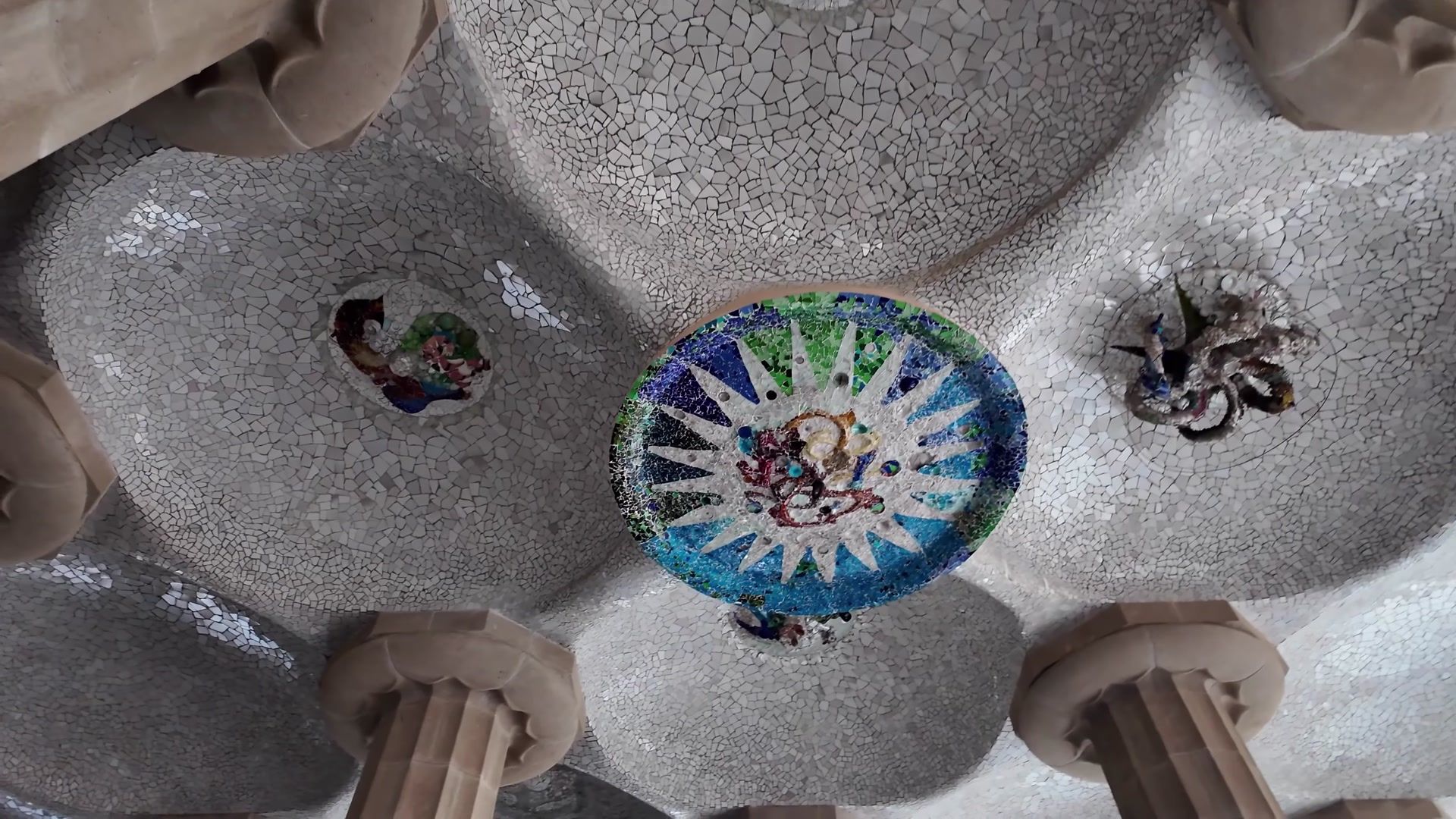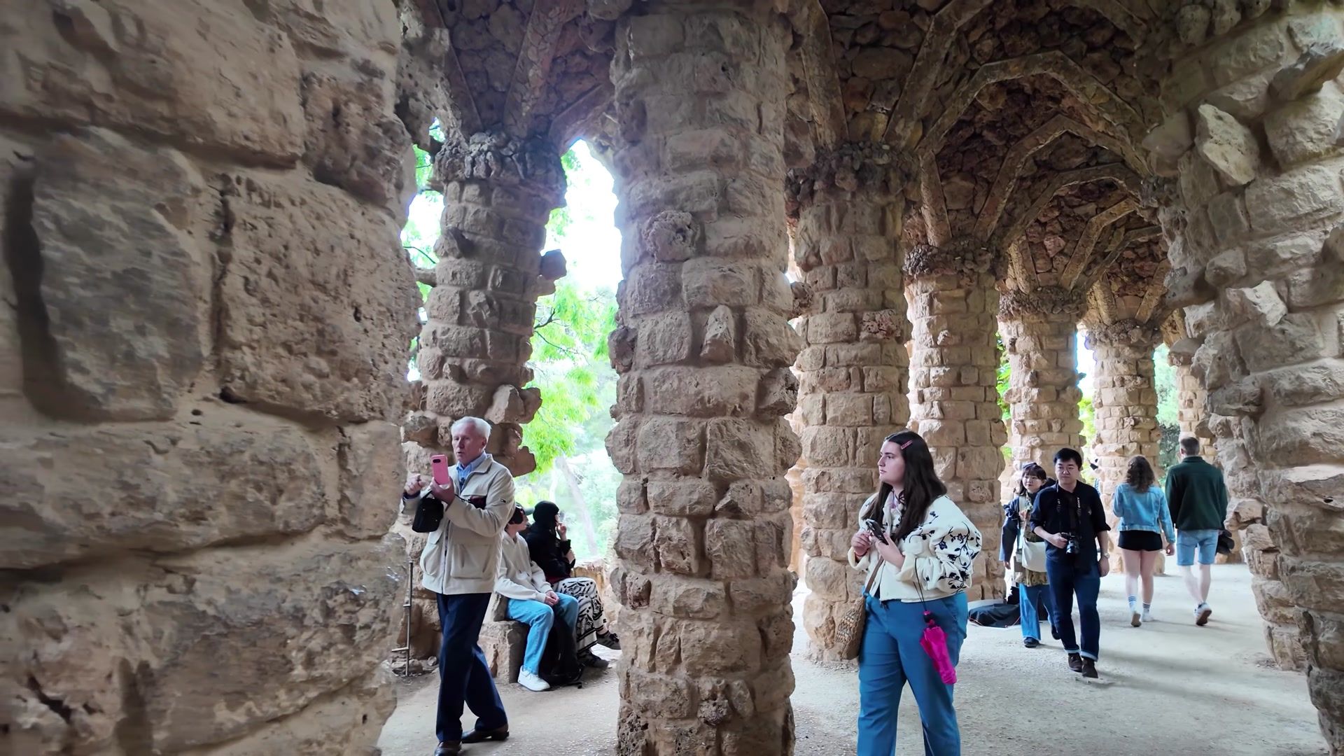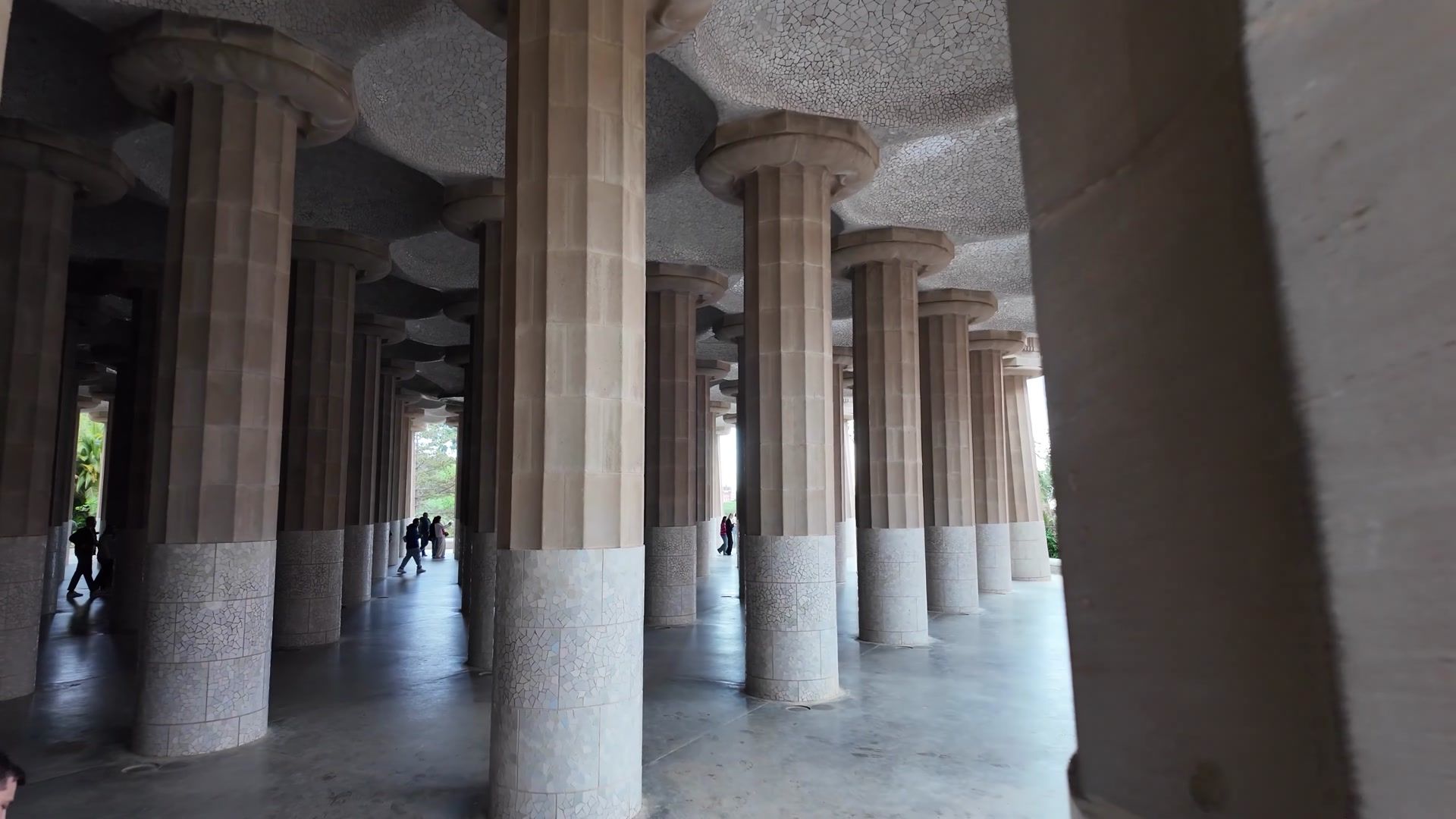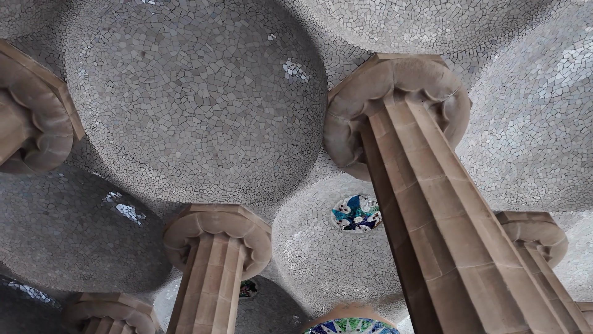 This area was planned as a public space for the local community. Each column is different, each stone is different and there are no visible connectors. Everything is solid and artistic in Gaudí’s style. It feels like a new version of nature. These curved shapes look like a tornado made of stone.