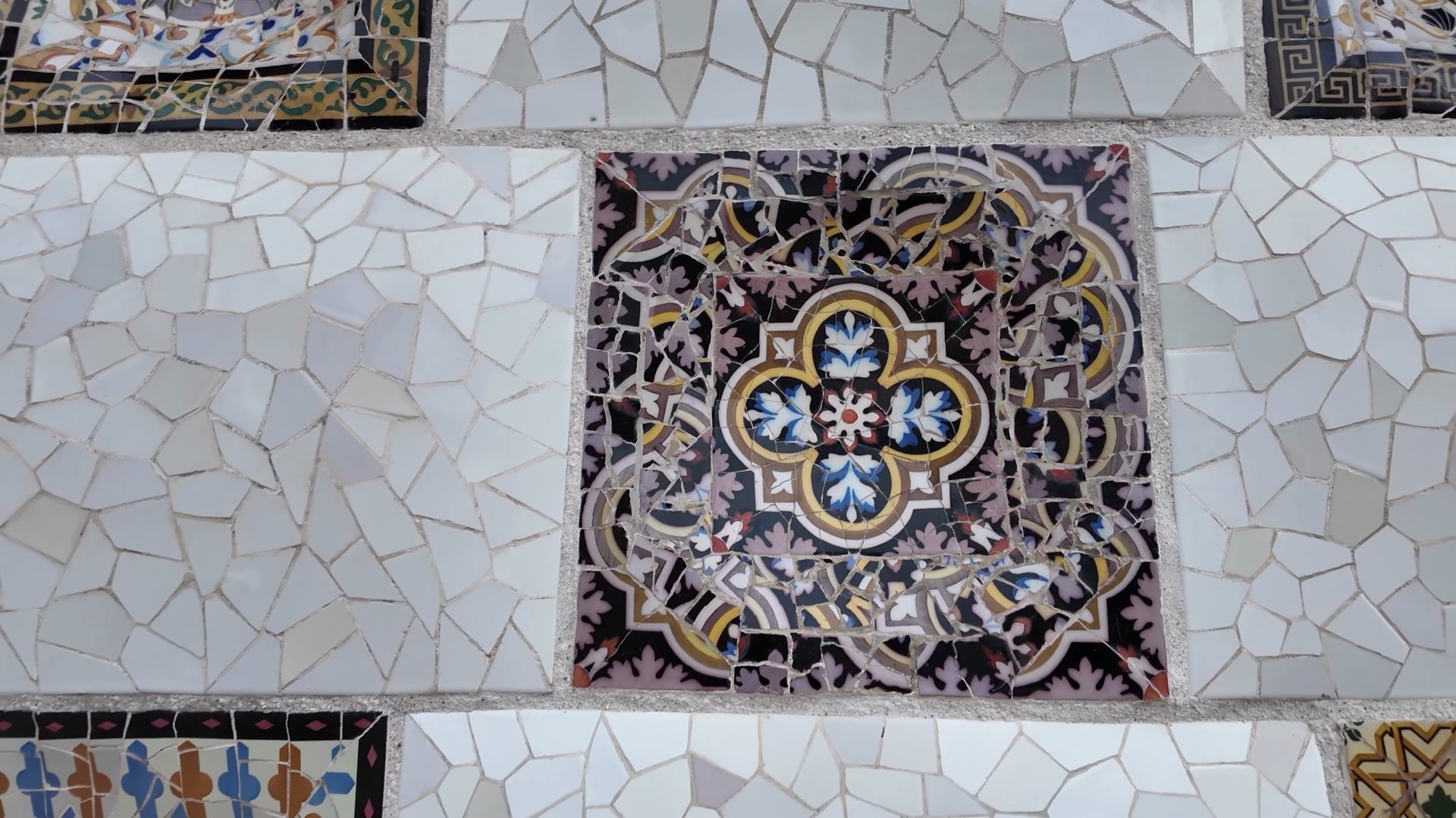 Here there are animal-head-shaped water spouts designed to direct rainwater away from the benches. The water is collected, filtered and then flows out of these heads. The Trencadís technique is used here, where broken tiles form patterns. Holes are made to let the water flow through so it doesn’t pool on the benches. You might feel the dampness but you don’t actually get wet.