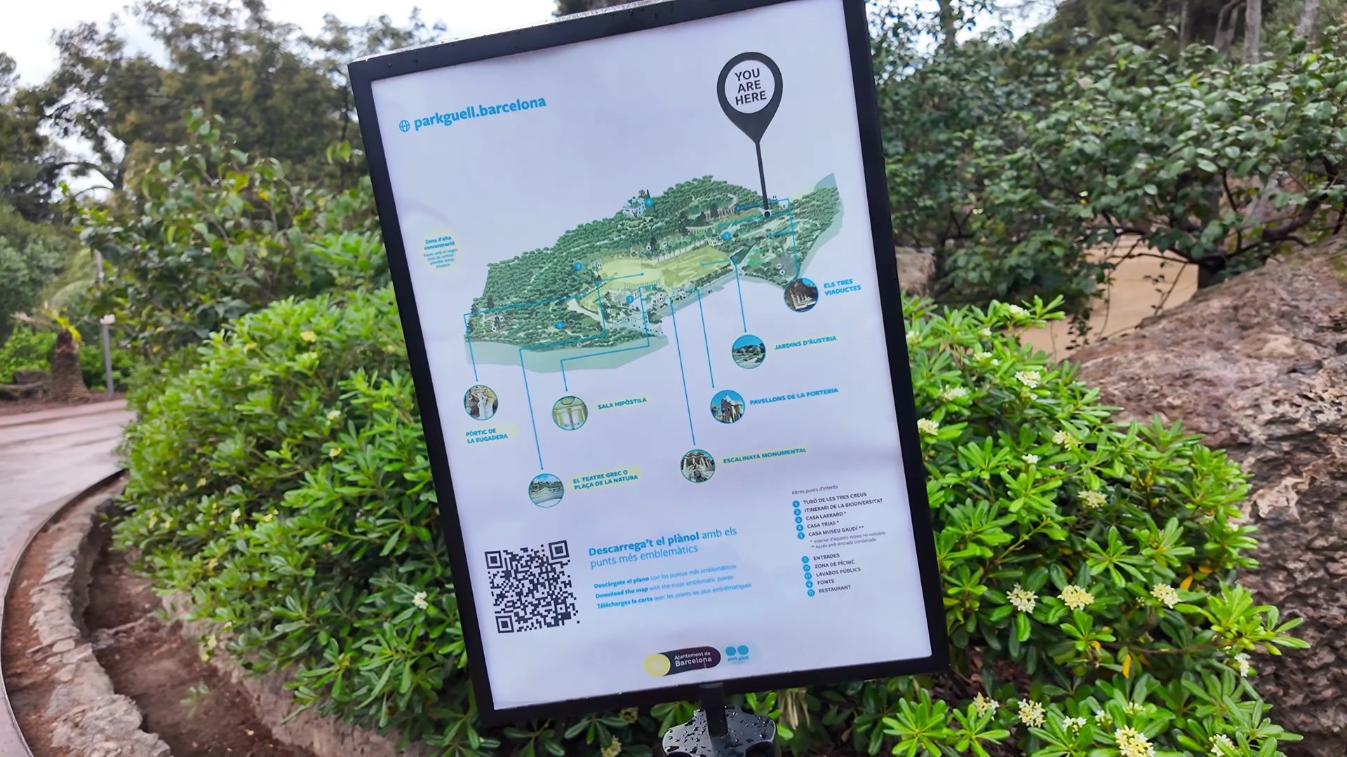 The entrance fee is 18 euros per person. We stop at a fork in the path where there are signs showing what's where. There’s also a map in the park where you can see your location and the main areas. You can download an app using a QR code. I tried the app but it only provided a short three-page document with basic information. So we decided to keep walking and explore the park on our own.