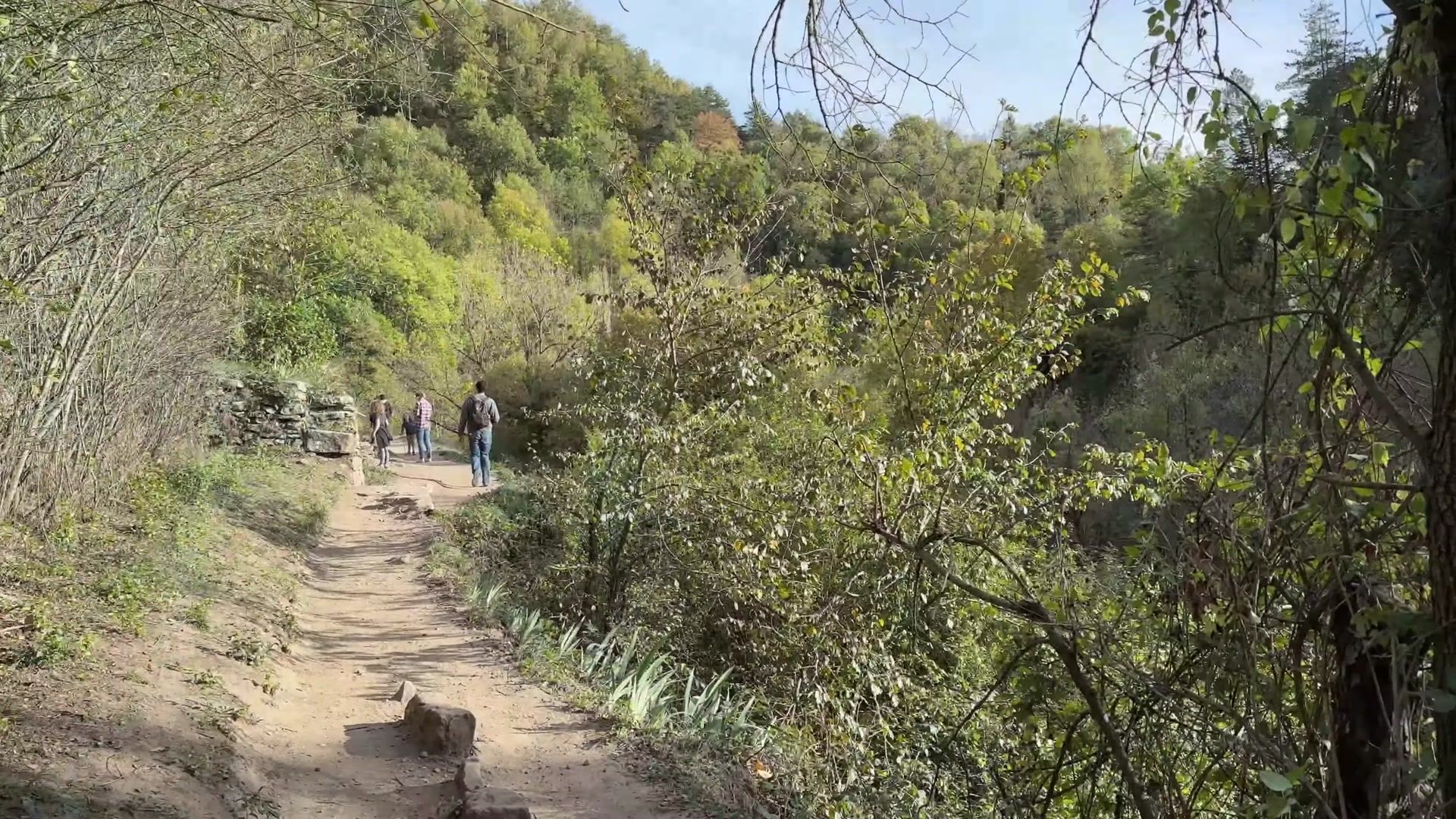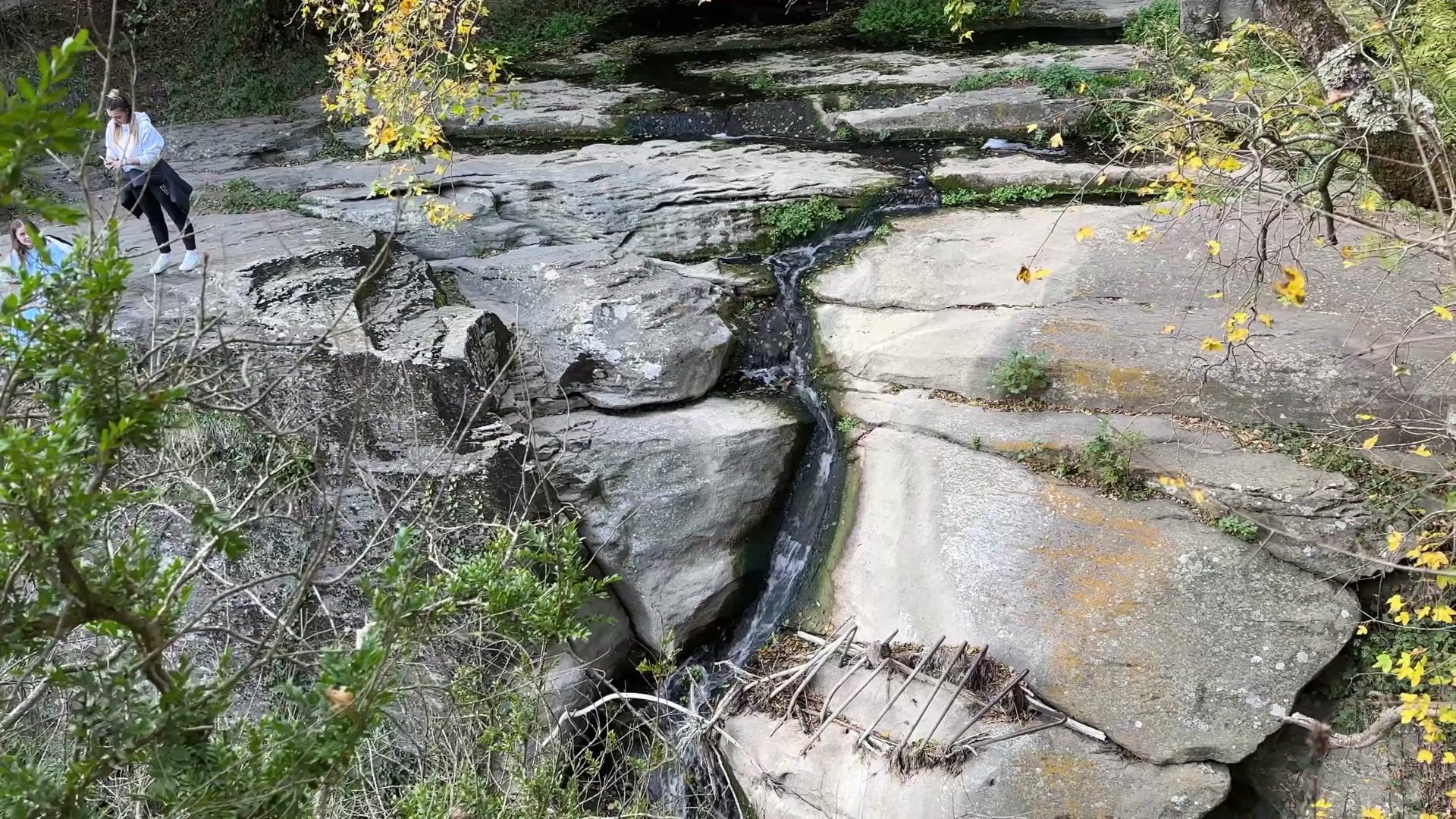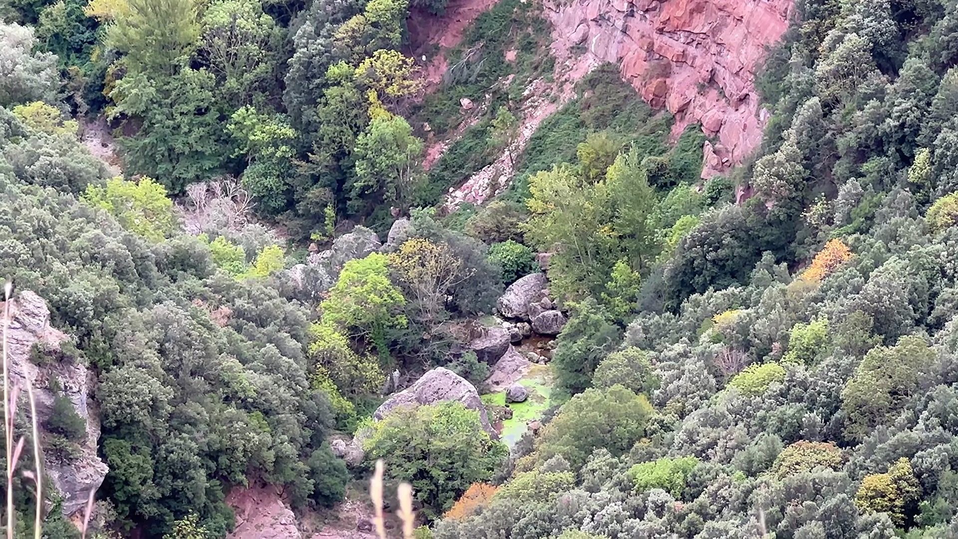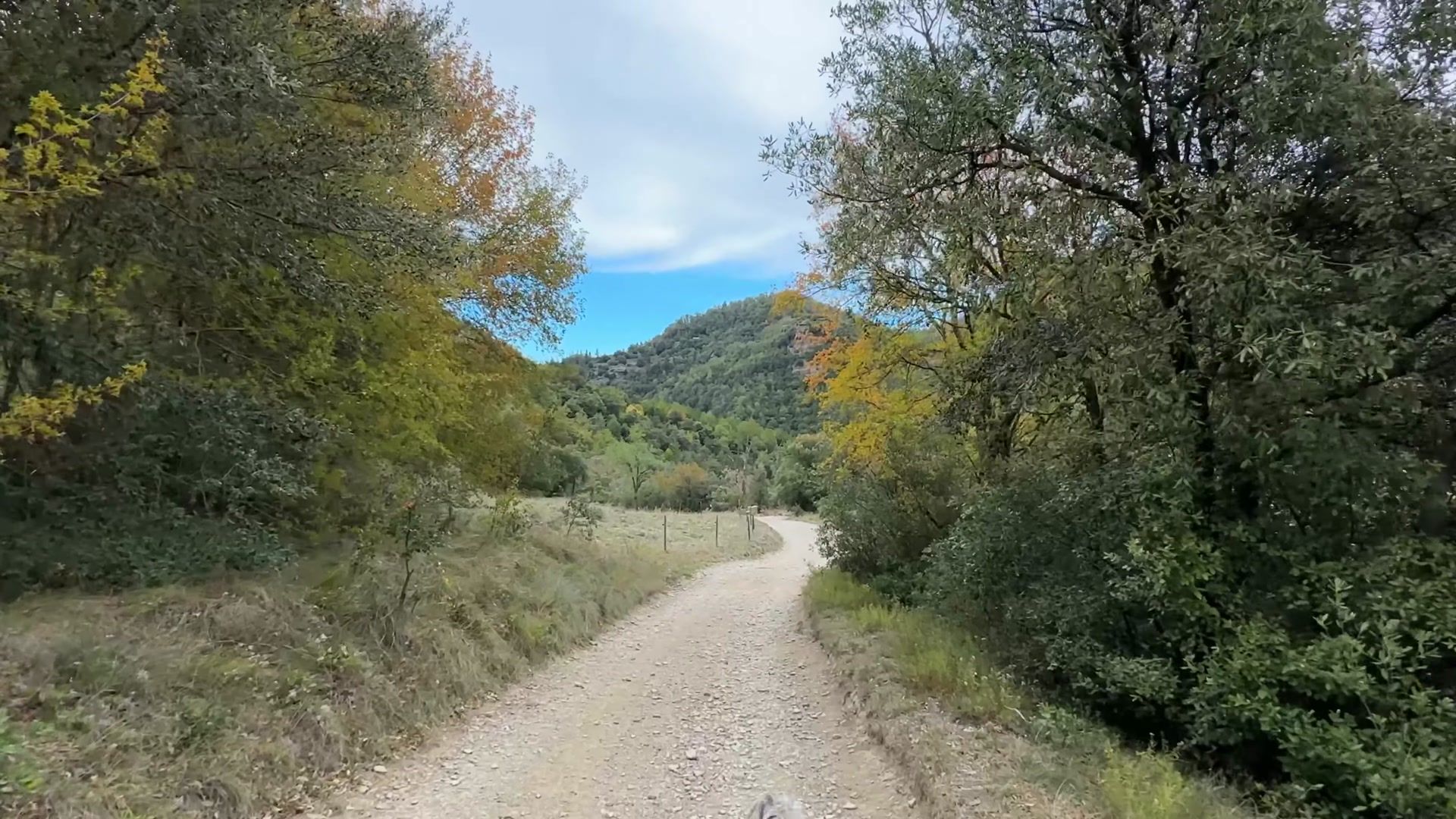 Of course, we were walking to enjoy these beautiful views. The Golden Autumn season had just begun, but it wasn’t as colorful as I had imagined. I think it would take another week for the leaves to fully turn yellow because everything was still quite green below, with some yellowing at the top. There used to be a large mountain river here, but now everything is dry. This is a result of the drought in Catalonia. There were small puddles in some places. When I visited here before, I was scared to jump over the rocks because the water was flowing so fast.