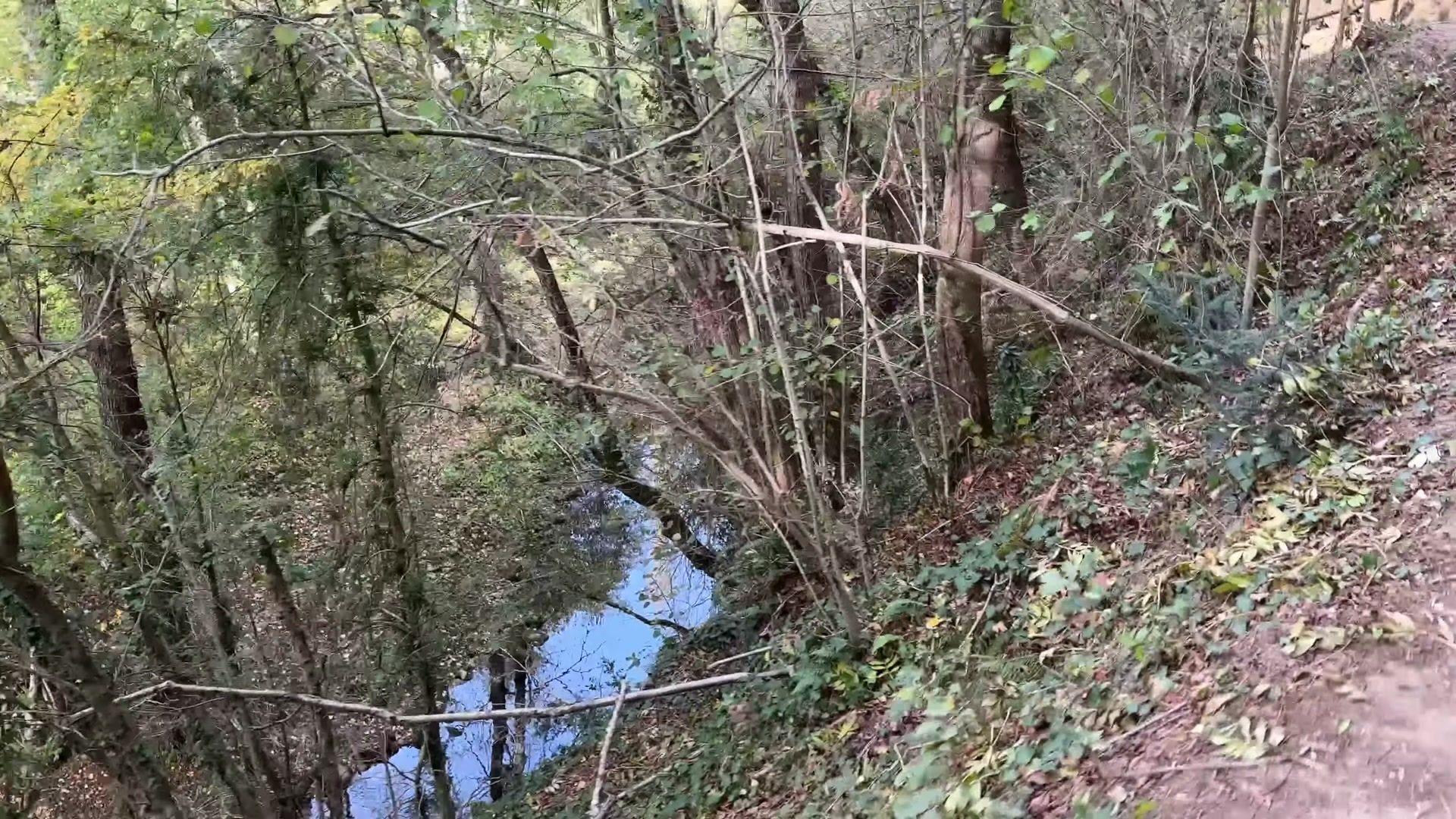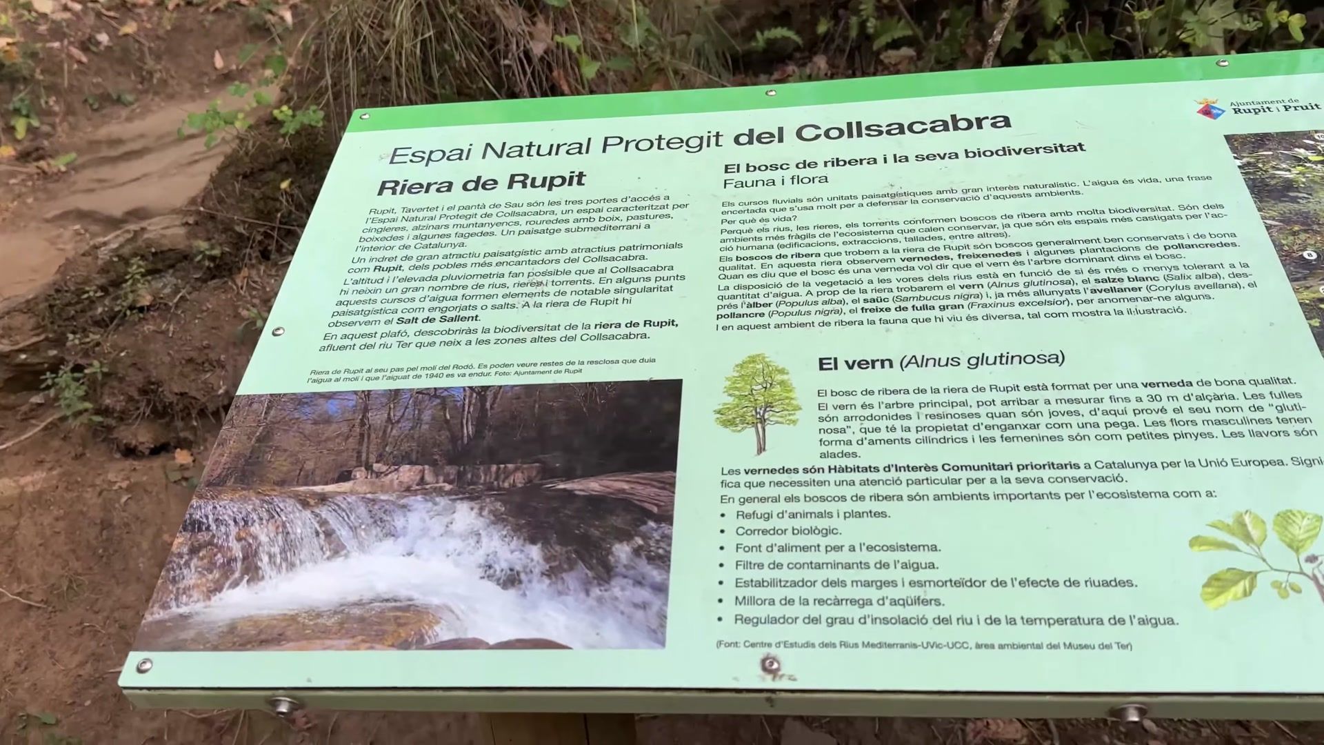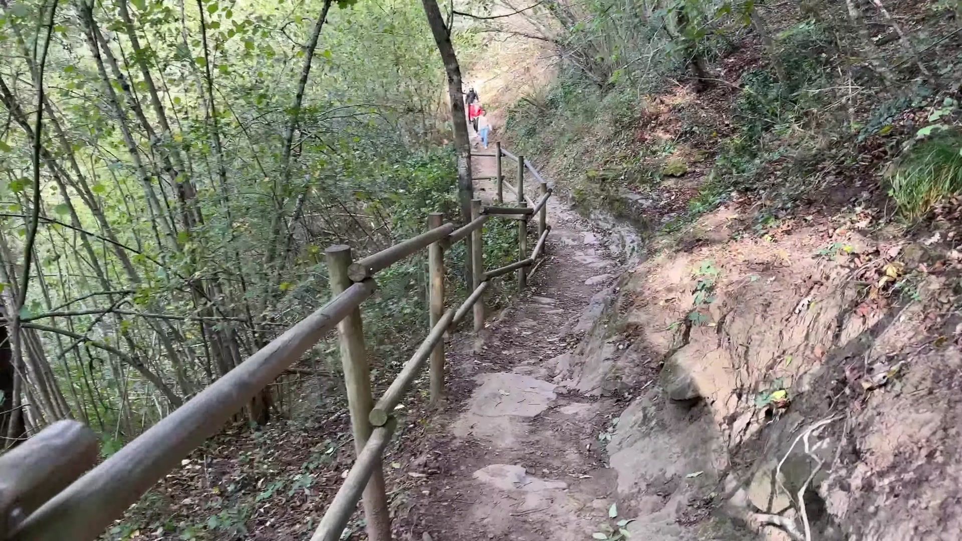 To reach the canyon we followed a regular road, a paved one. There are actually two paths here: you can either drive or walk. I recommend this route for those who don’t want to walk through the forest or can’t. This road is a bit longer, about 500 meters. But it’s comfortable to walk on, with beautiful views of the forest and the canyon. You can also see the town of Rupit right next to you. We also saw some lovely buildings along the way. If you prefer the forest trail, you should know that it’s a bit more challenging. There’s mud, puddles and sometimes you have to cross streams by jumping over rocks. The trail is tougher, but the views are absolutely worth it.
