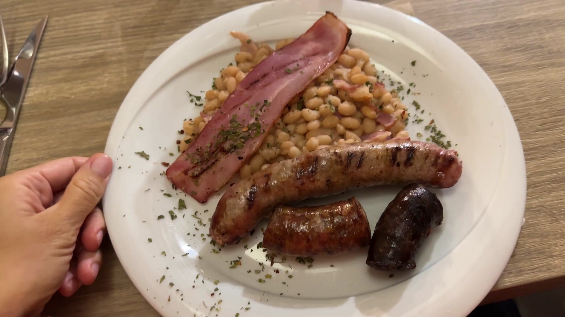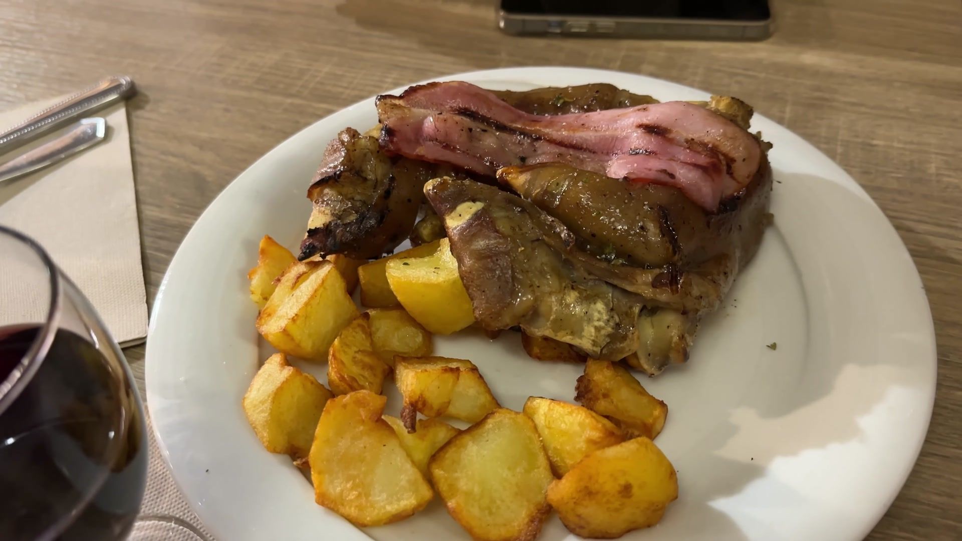 We ordered our food at the restaurant. My friend ordered wild boar, while I didn’t want to take a risk and just had sausages. A bit of information about the restaurant: it’s located right in the center of the square. A glass of red wine costs 8 euros and 20 cents. The food here is great. We sat inside because it was a bit chilly outside, but you can sit outside if you dress warmly enough.