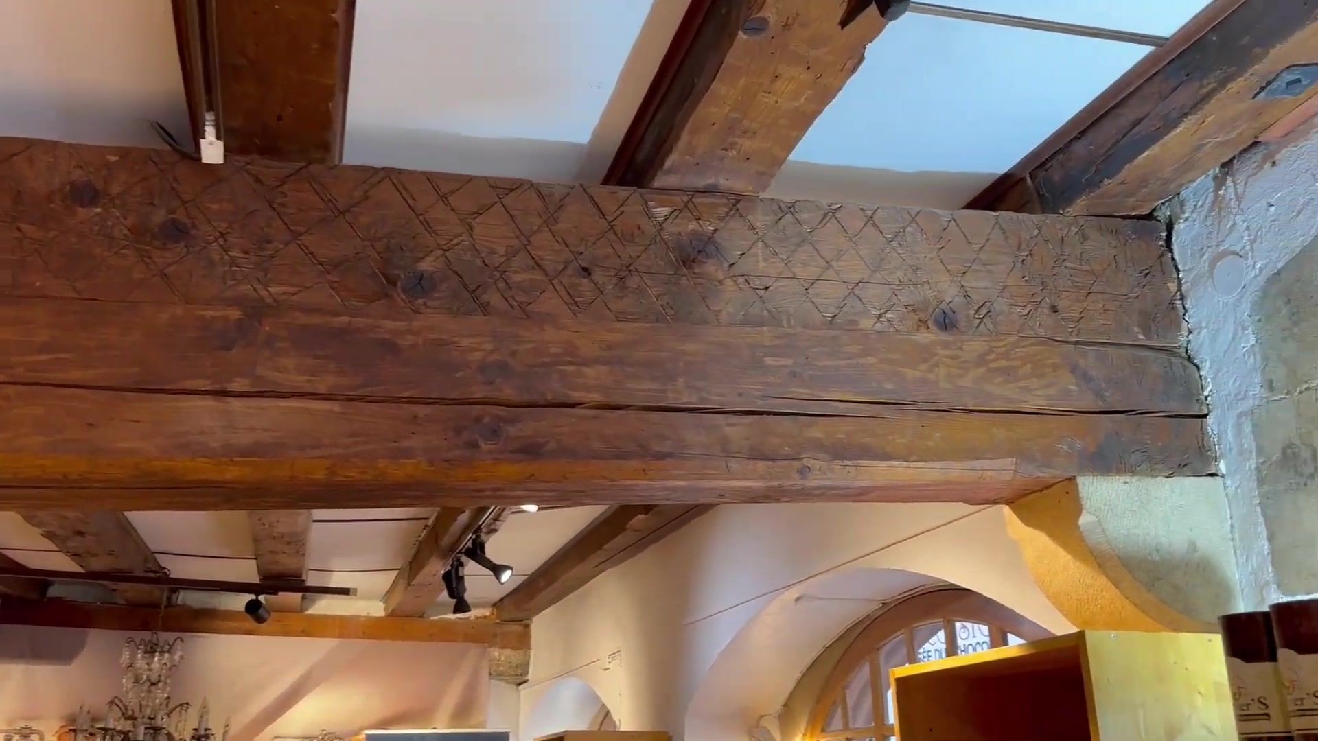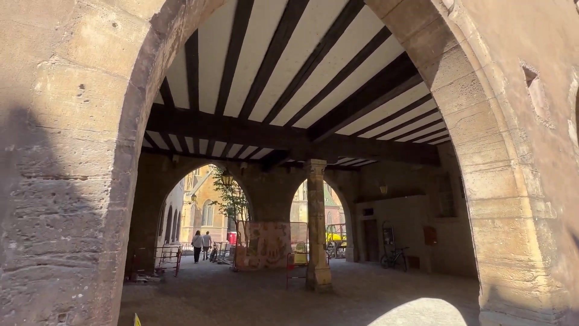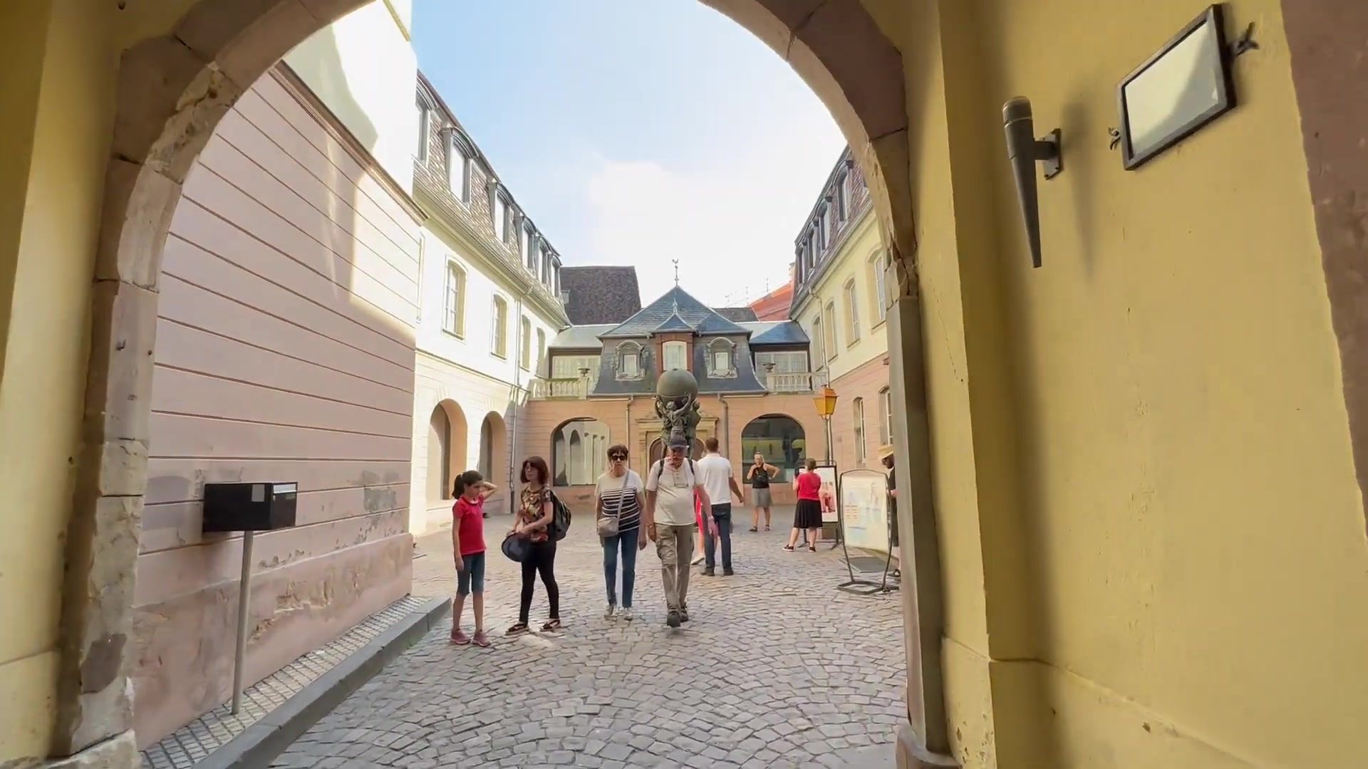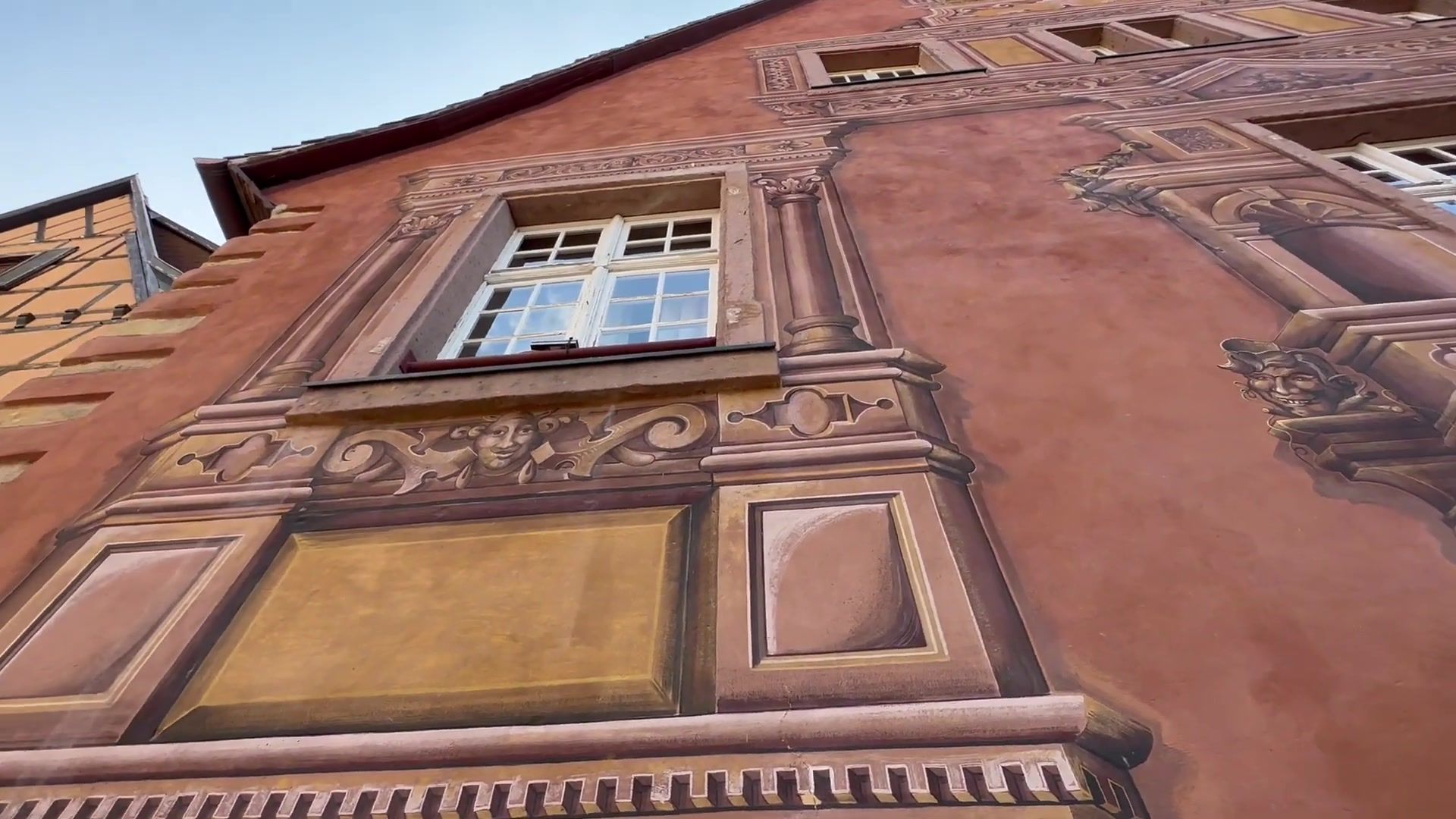 We saw a green-faced house from the year 1419. Next to it stands a more elegant structure called the Pfister House. It was built in the mid-1500s by a wealthy miner. The façade is very striking. Inside there’s a wine shop. The building's frame is still made from 500 to 600-year-old beams.