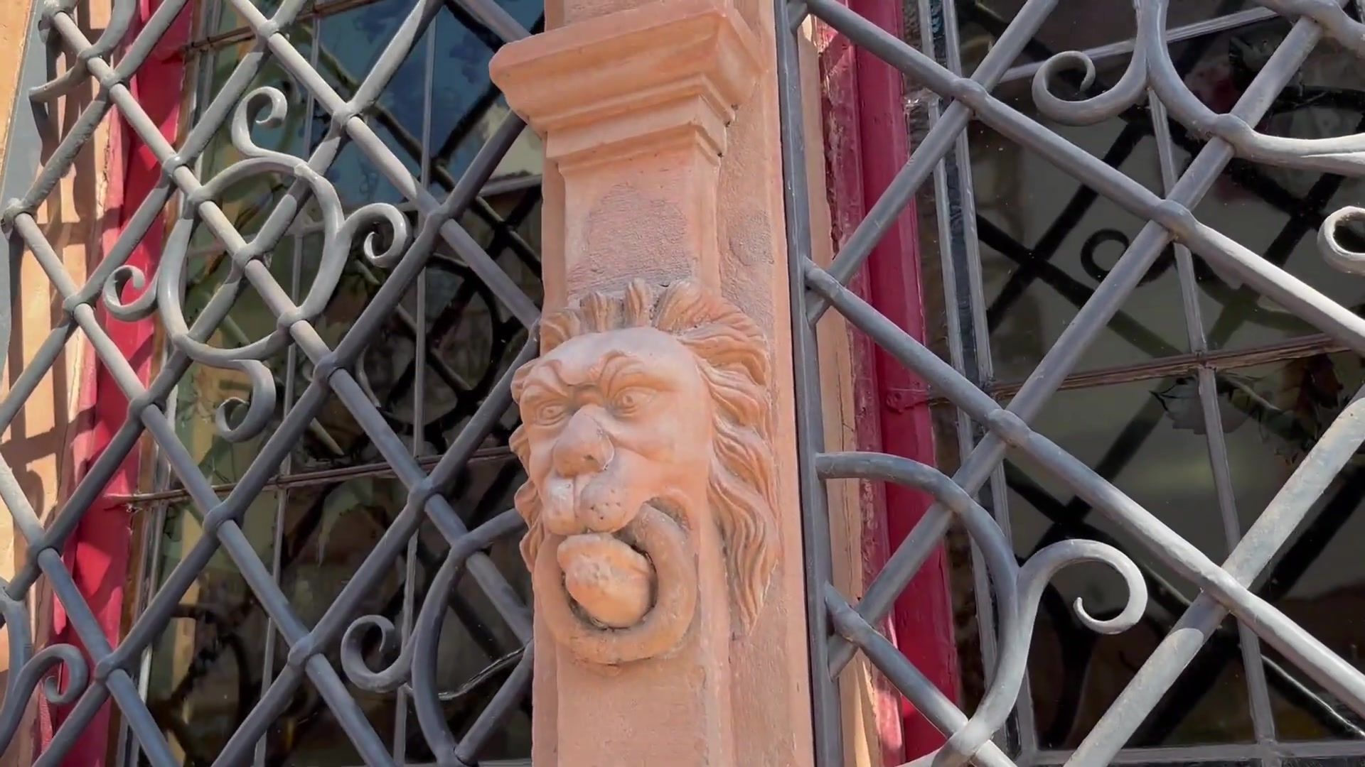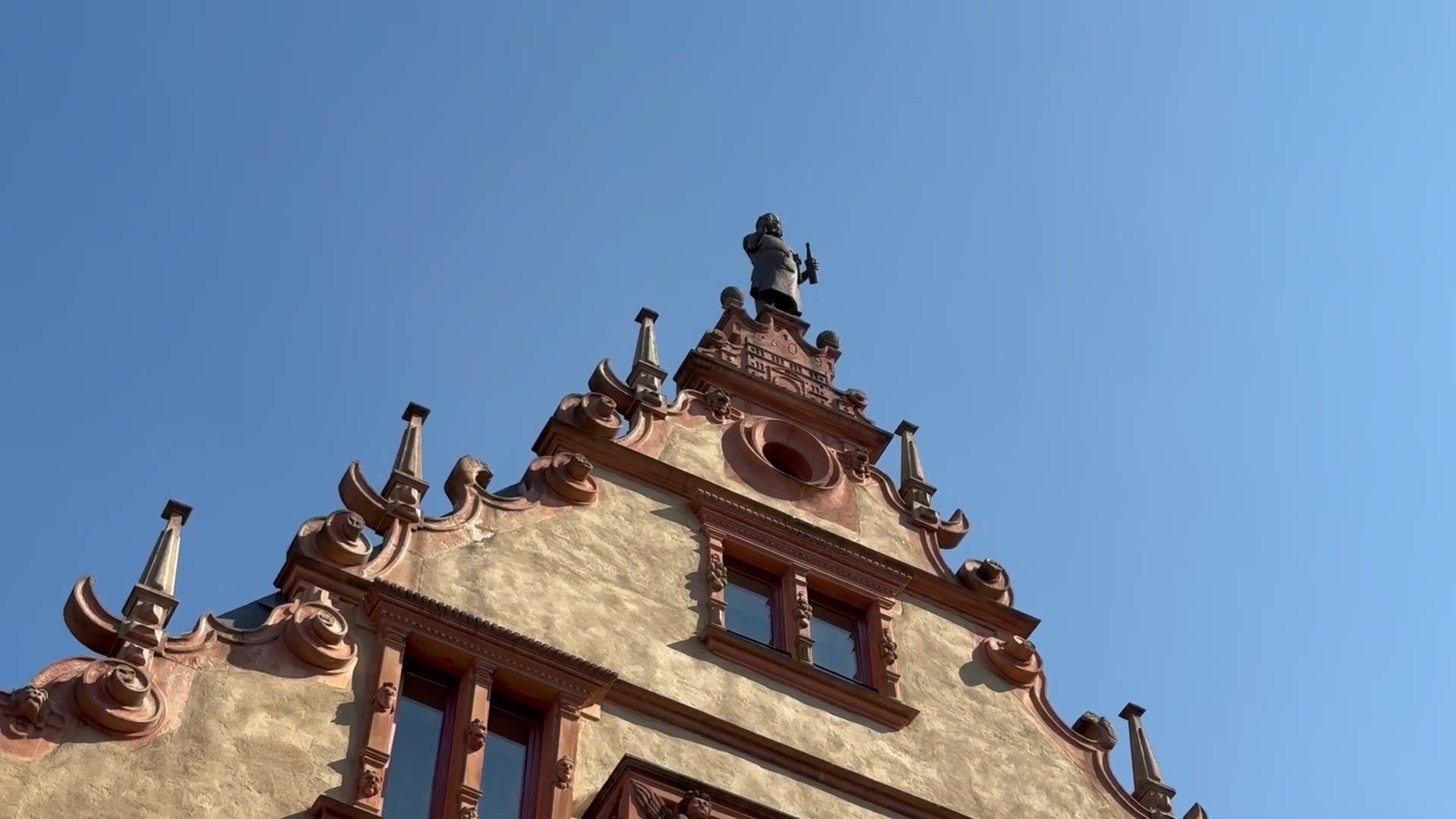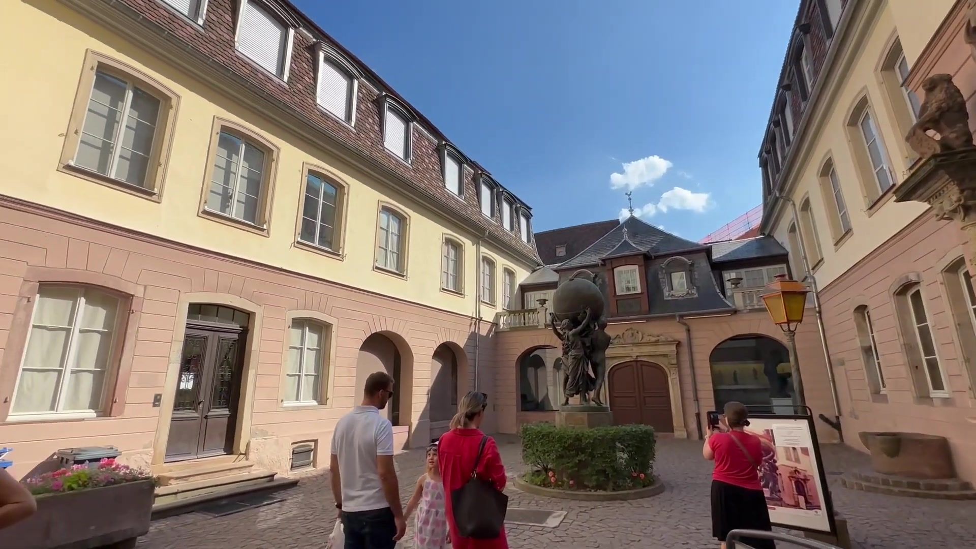 The first important building we saw was the House of heads or in French, Maison des Têtes. It was built at the beginning of the 17th century. Why is it called that? Because its façade has exactly 106 different faces, masks and heads carved into it. At first glance it looks like fewer, but if you look closely, you can really count all 106. When you look up, you notice a strange statue. This statue also has an interesting story. It was made by a great local architect. The figure holds a wine bottle in its hand because the building was converted into a wine exchange in the 19th century. Wines were sold and prices were set there.