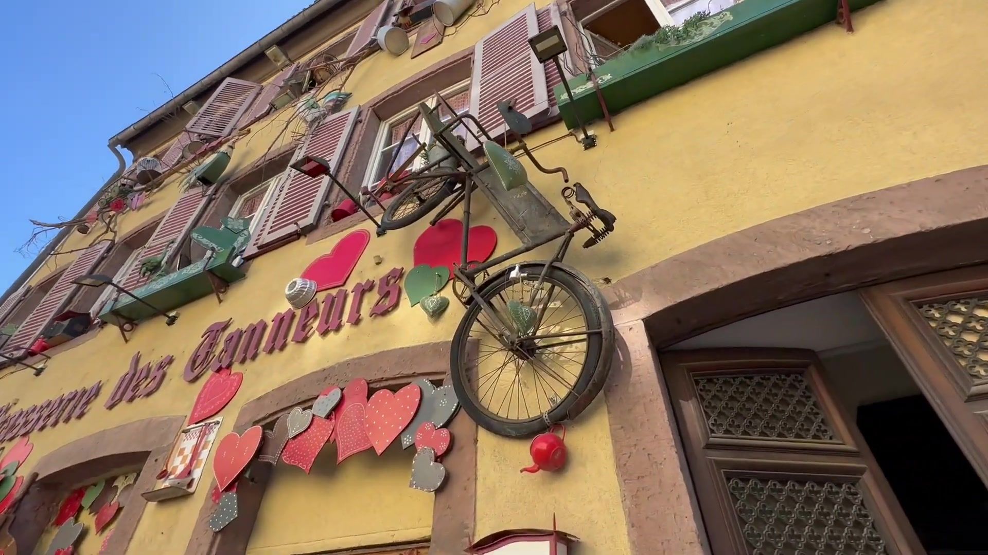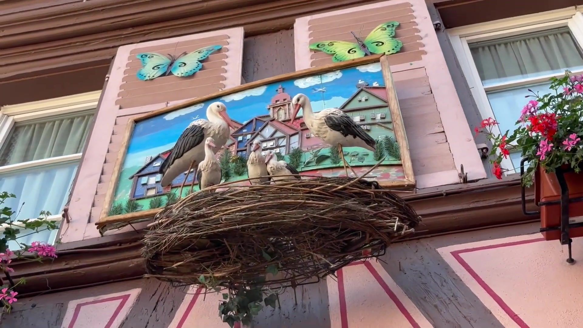 The decorations are another beauty altogether. Colorful flowers, heart-shaped ornaments, vintage bicycles. Some houses even have plastic stork figures. Why? Because the stork is a symbol of Alsace. In the 1980s storks almost disappeared due to pollution and wetland drainage. But later they were reintroduced, farms were built and the stork population began to grow again. Now they don’t migrate to warmer countries anymore, they stay here. Colmar is also one of the driest cities in France, which creates perfect conditions for vineyards. Even the corks of local wines have stork symbols on them.