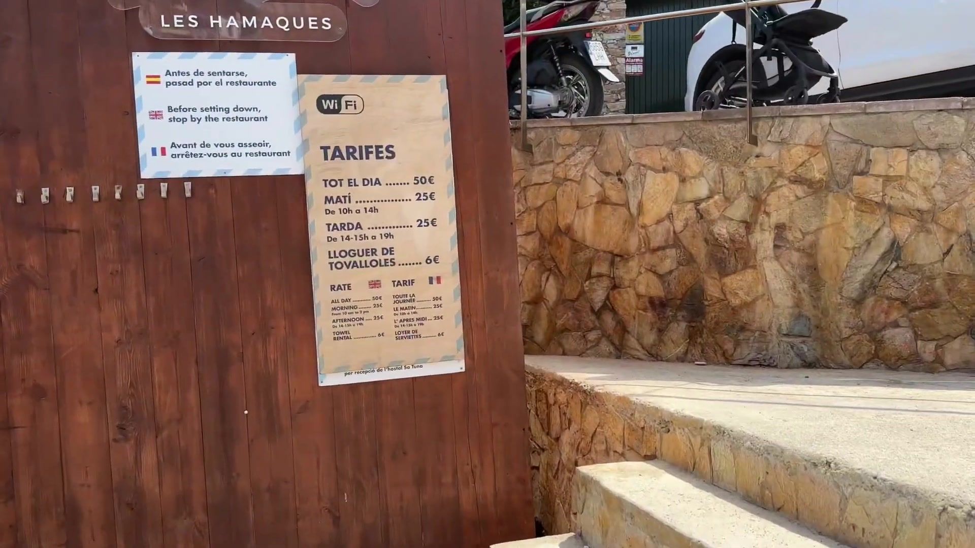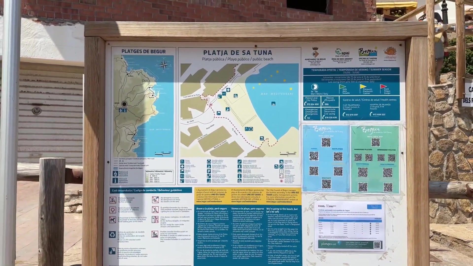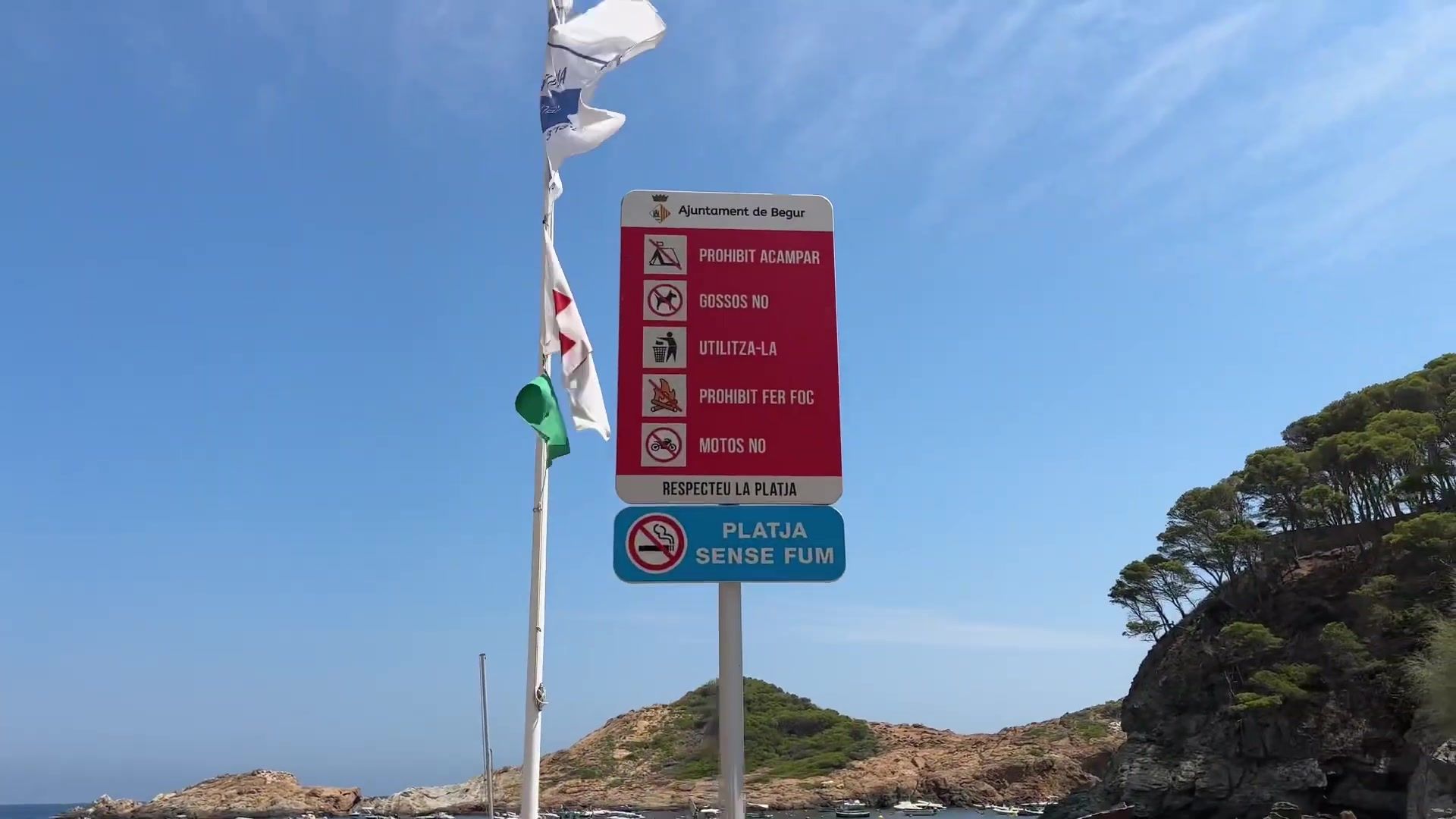At the beach entrance there’s a sign listing the rules: no dogs, littering, fires, smoking or motorbikes allowed, just standard regulations. There’s also an old anchor on display, a reminder that this used to be a fishing village. The beach is called "Platia De Sa Tuna" and is located in Begur. The cabin on-site has restrooms, with an entry fee of €1.