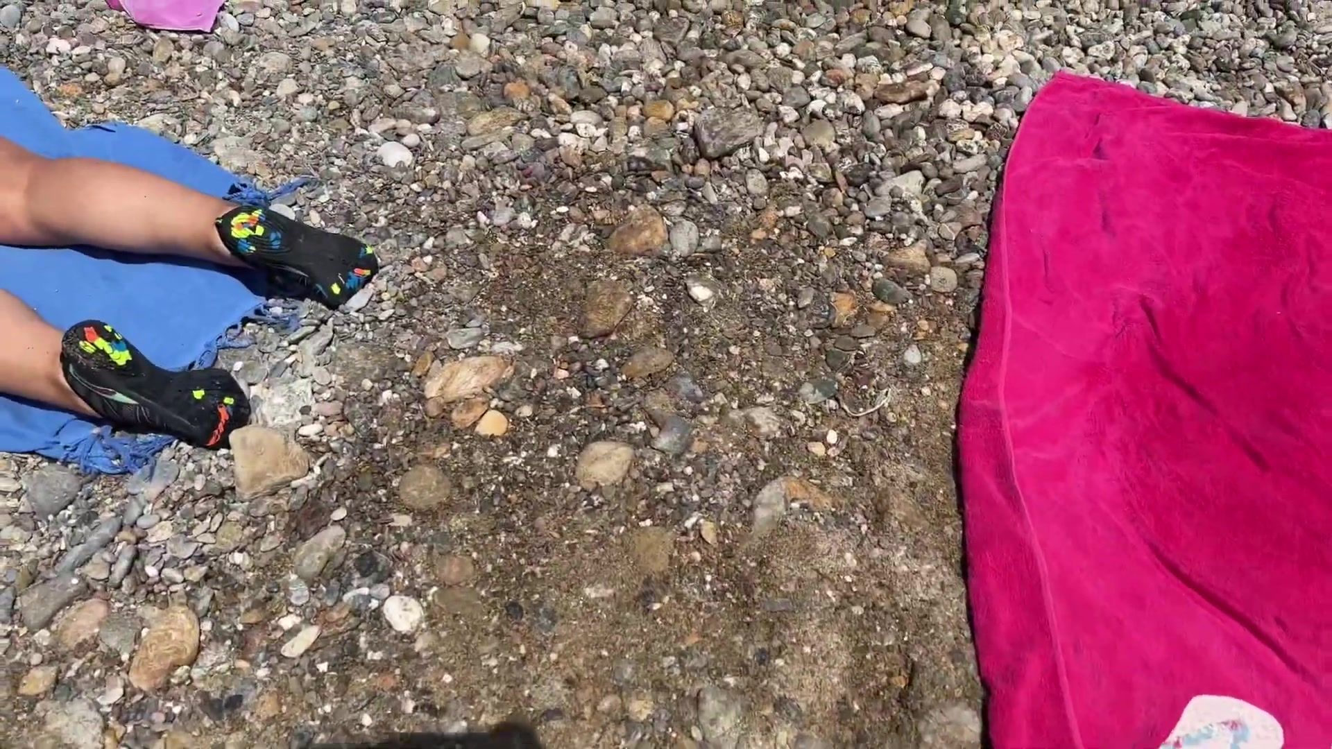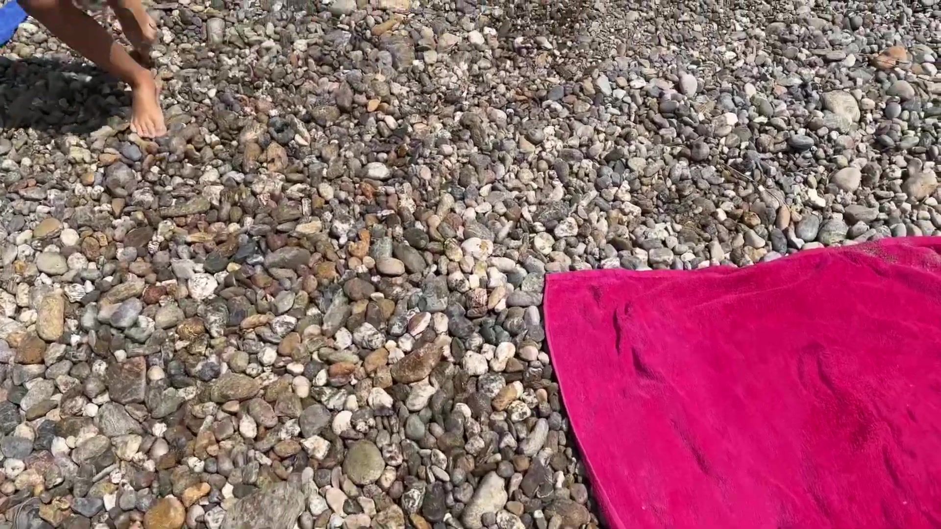 I want to draw attention to the beach's condition. It's stone, stone and more stone. Walking here is quite uncomfortable and painful, as the stones get extremely hot. Getting into the water is another challenge; you can easily understand why a girl might be lying down in slippers, as there is no sandy surface here. Entering the water means navigating small to medium-sized pebbles, which is quite uncomfortable. Occasionally sharp rocks appear and there are also large boulders in the sea. The beach and the seabed are filled with stones, which is unfortunate.