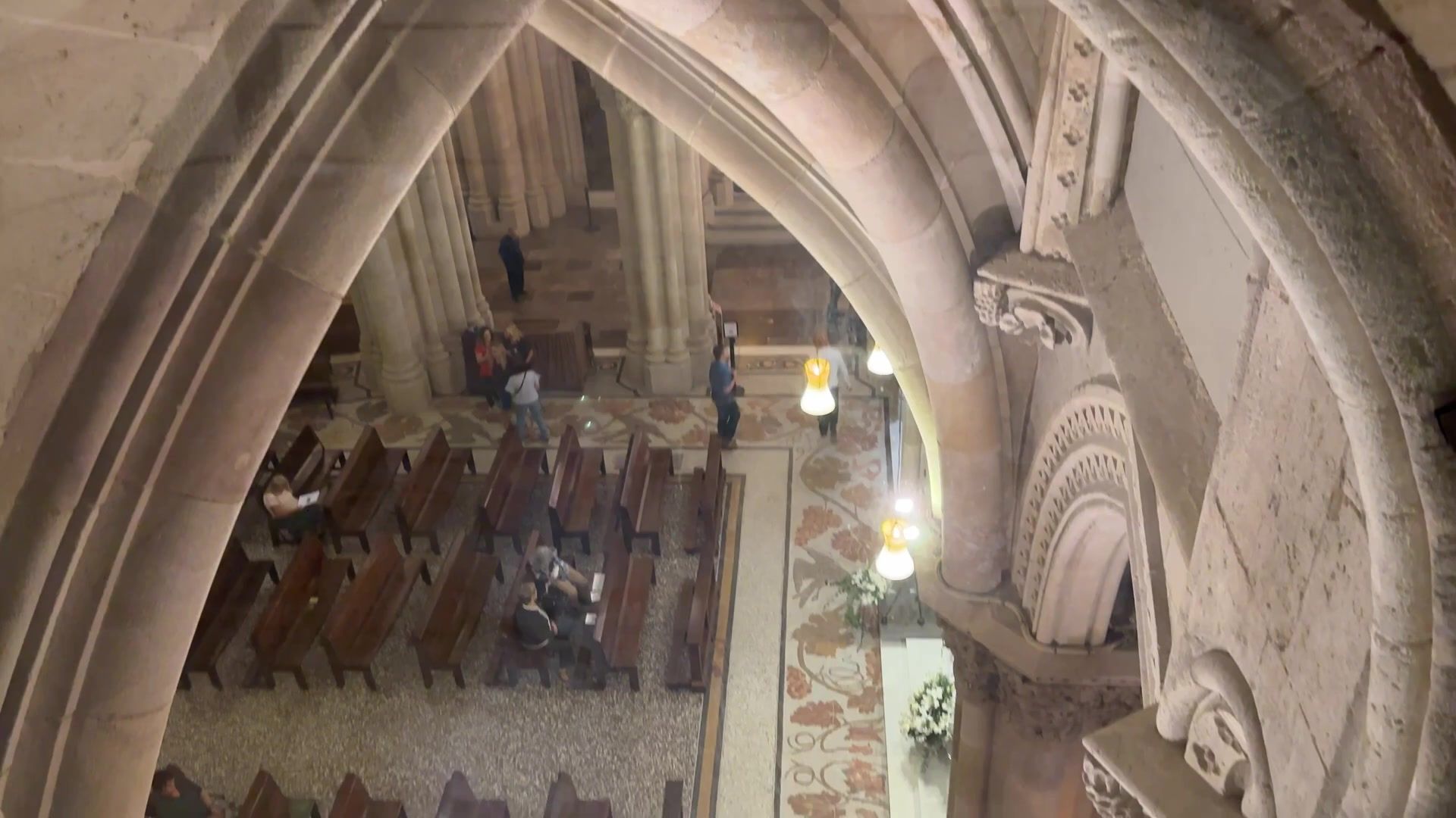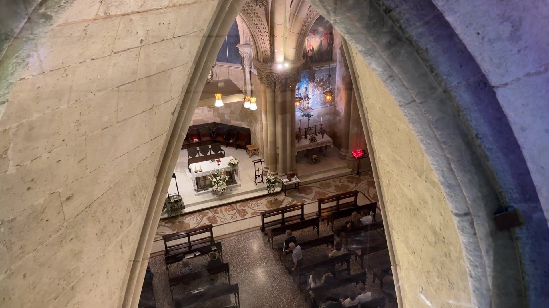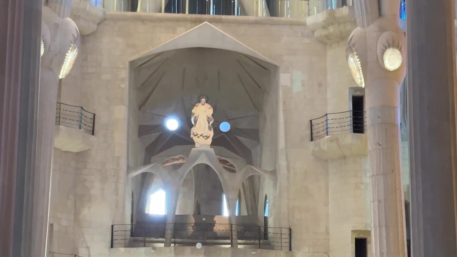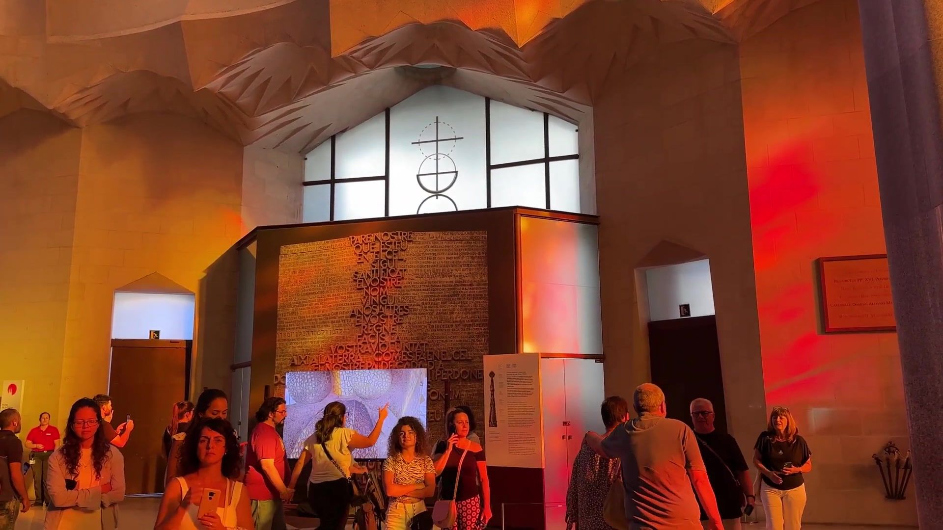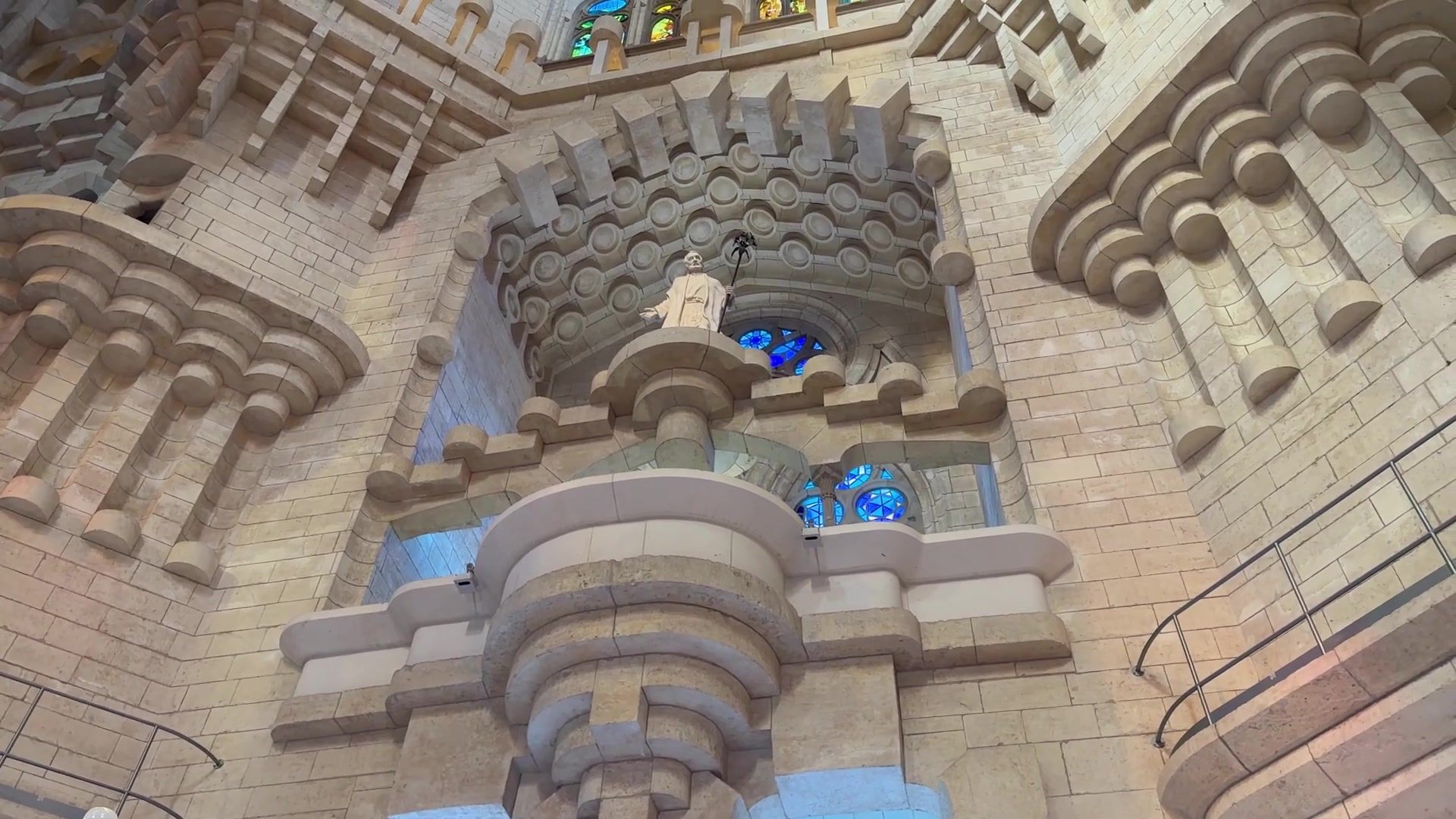 Inside the temple there are many monitors, including screens showing the first restoration of the bell towers built in 1930. One monitor allows us to take a virtual tour of the chapel that began construction in 2022 and shows us what the dome looks like. The play of light shows how light is distributed inside the temple on this monitor. But as we went a little further we reached the altar area.