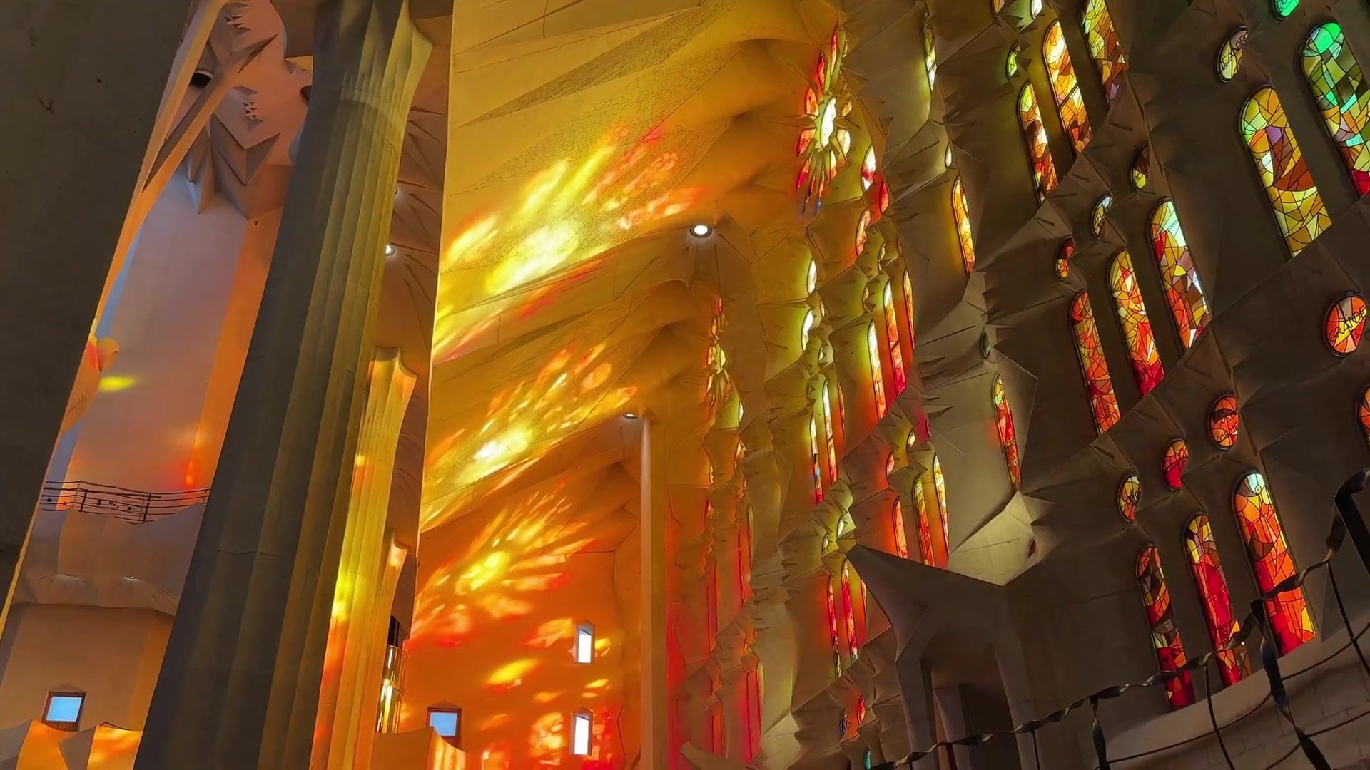 The stained glass windows on the east facade are in cool tones, while those on the west facade are illuminated in warm tones where the sun's rays come in.