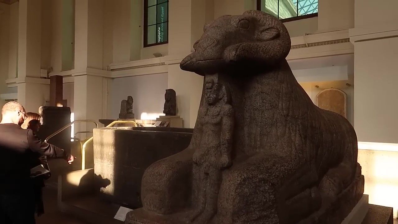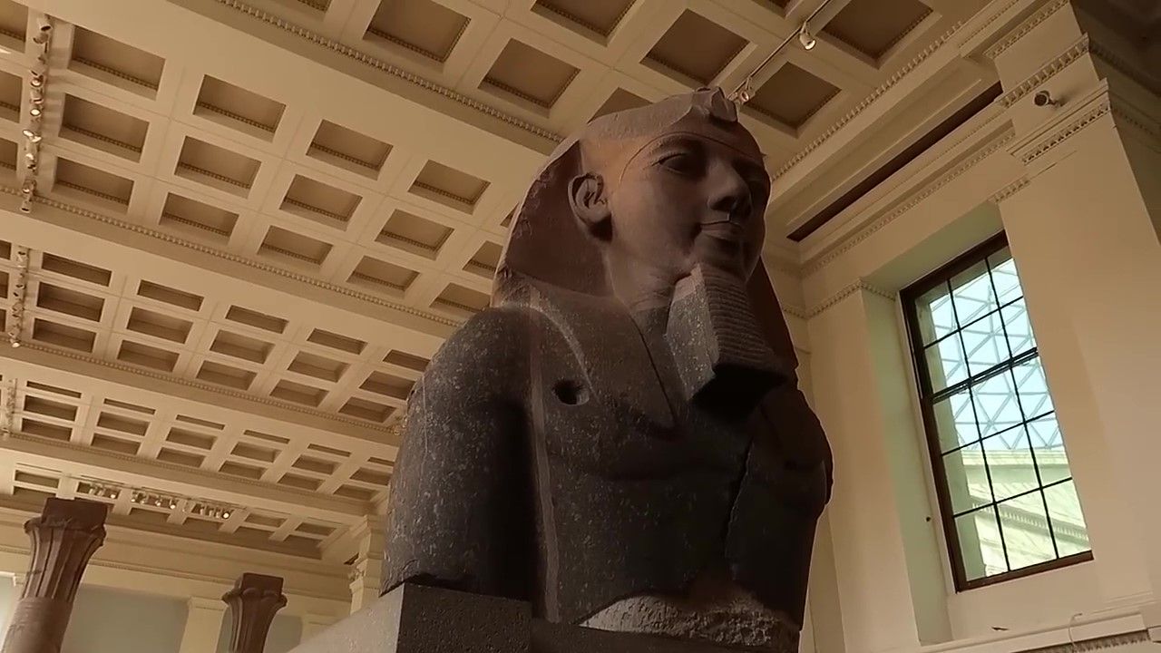 The next piece is located in the Egyptian gallery but is currently on display in the Enlightenment Gallery in a replica form. It's the "Rosetta Stone." Upon closer examination we see a text written in Egyptian hieroglyphs. There's also another text written using a script known as demotic. This second text belongs to a later period of Egypt.At the bottom of the stone an ancient Greek text is inscribed. Having three different texts with the same content on the stone helped scholars become familiar with the thematic Greek alphabet ultimately aiding in deciphering the Egyptian hieroglyphs. This marked a turning point as historians could now unlock Ancient Egypt's secrets and read documents written in hieroglyphs.