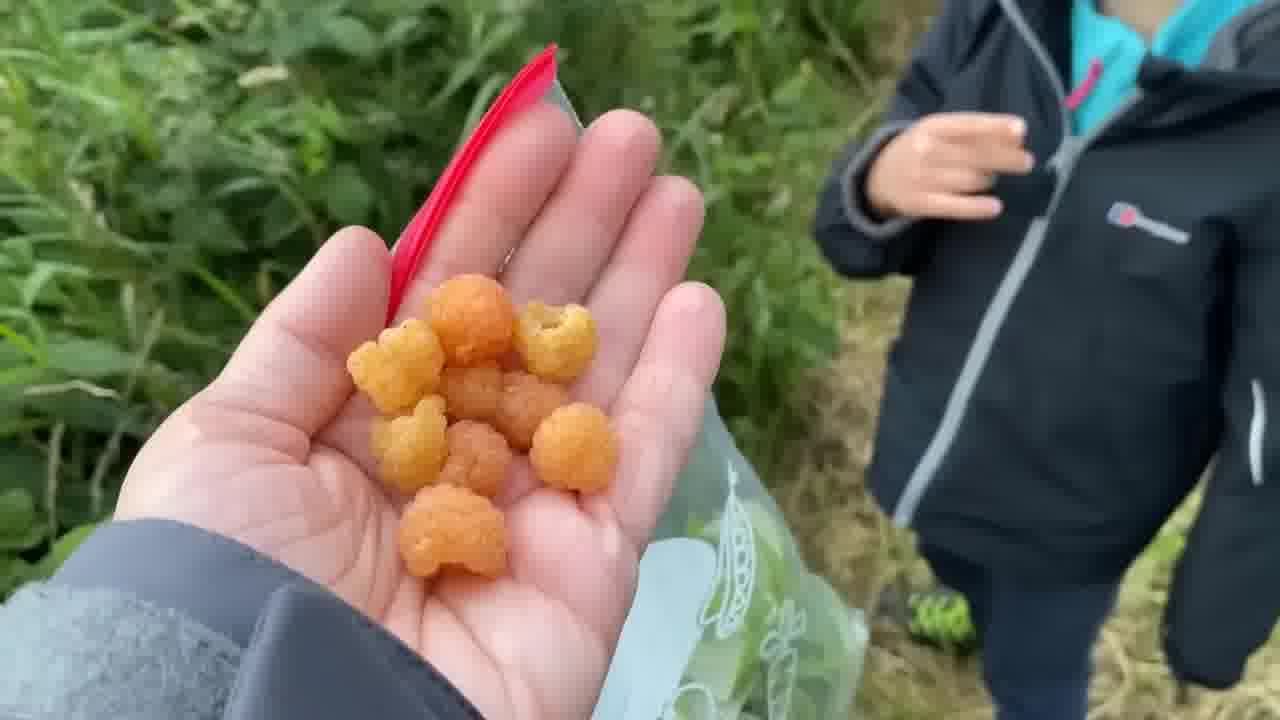 Sheep are grazing quietly while we chase after the yellow raspberries because we saw wild raspberries somewhere yesterday. I don't know if they're wild or cultivated, but they naturally appear and have a yellow color. The children are seeing them for the first time. They got excited and said we should go on another yellow raspberry hunt today. Okay, we've reached the goal, the children are happy. Wonderful, perfect raspberries.