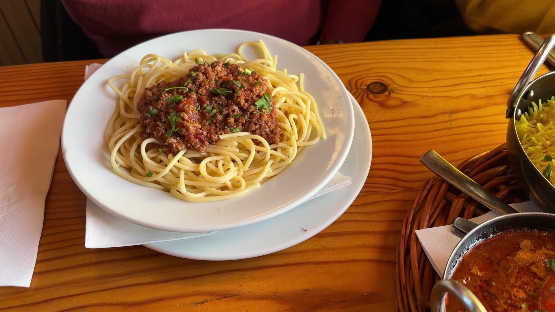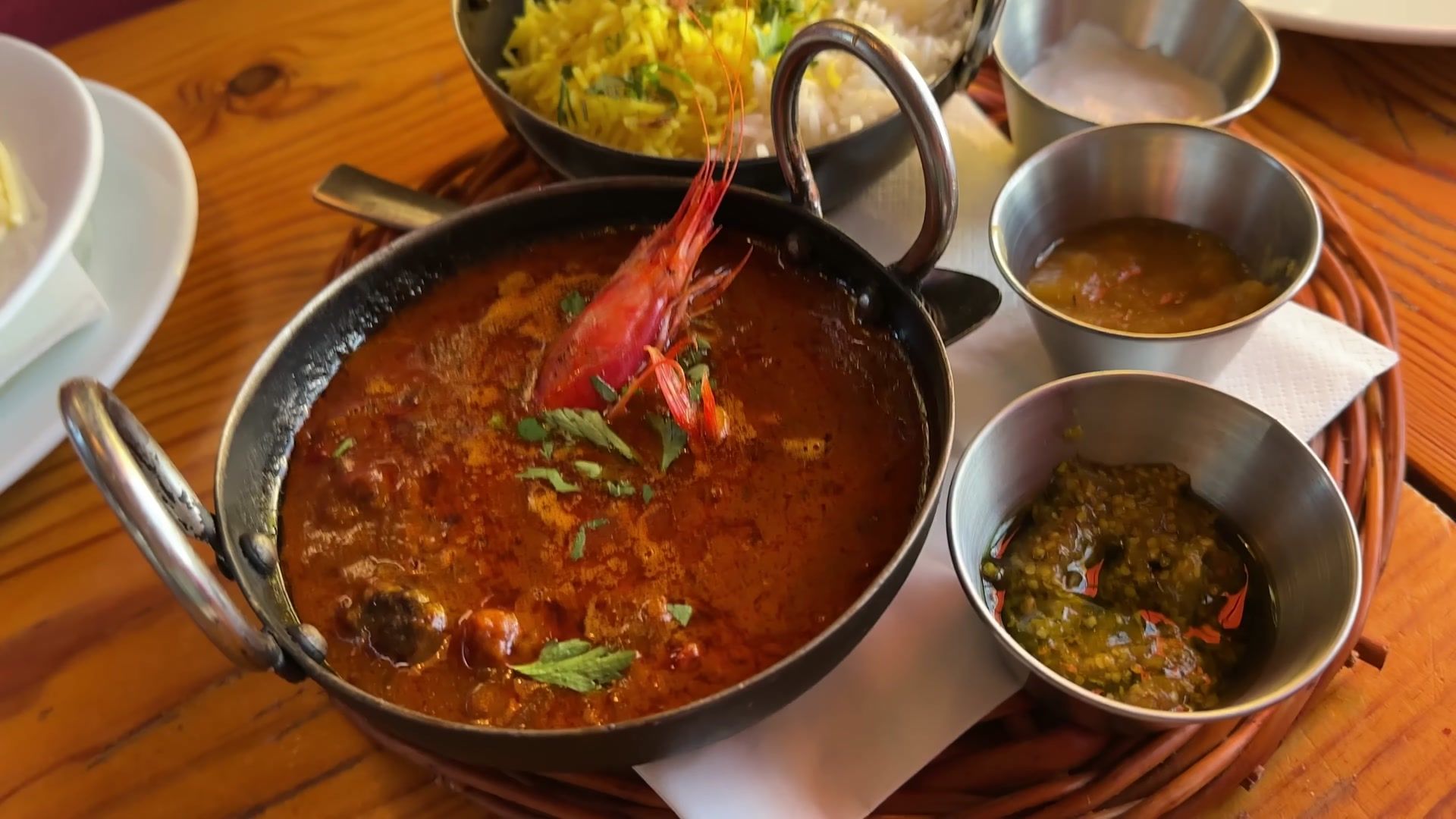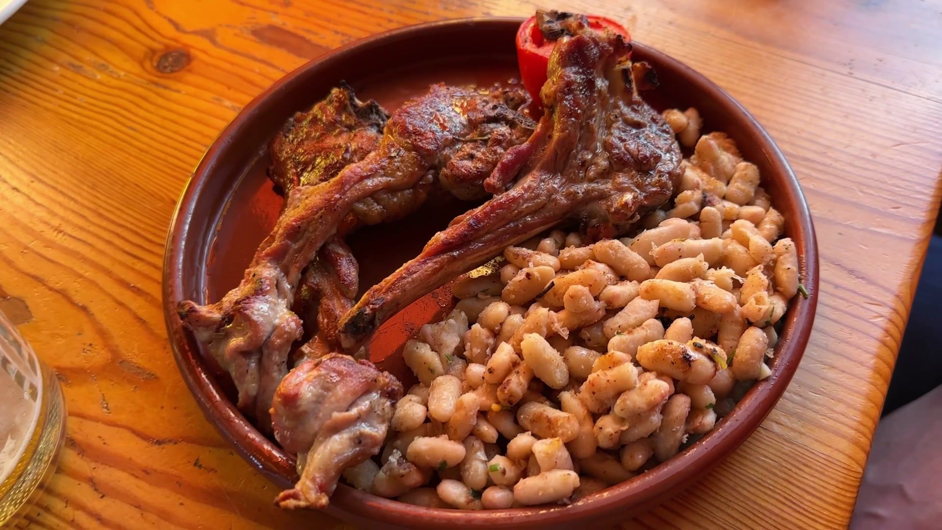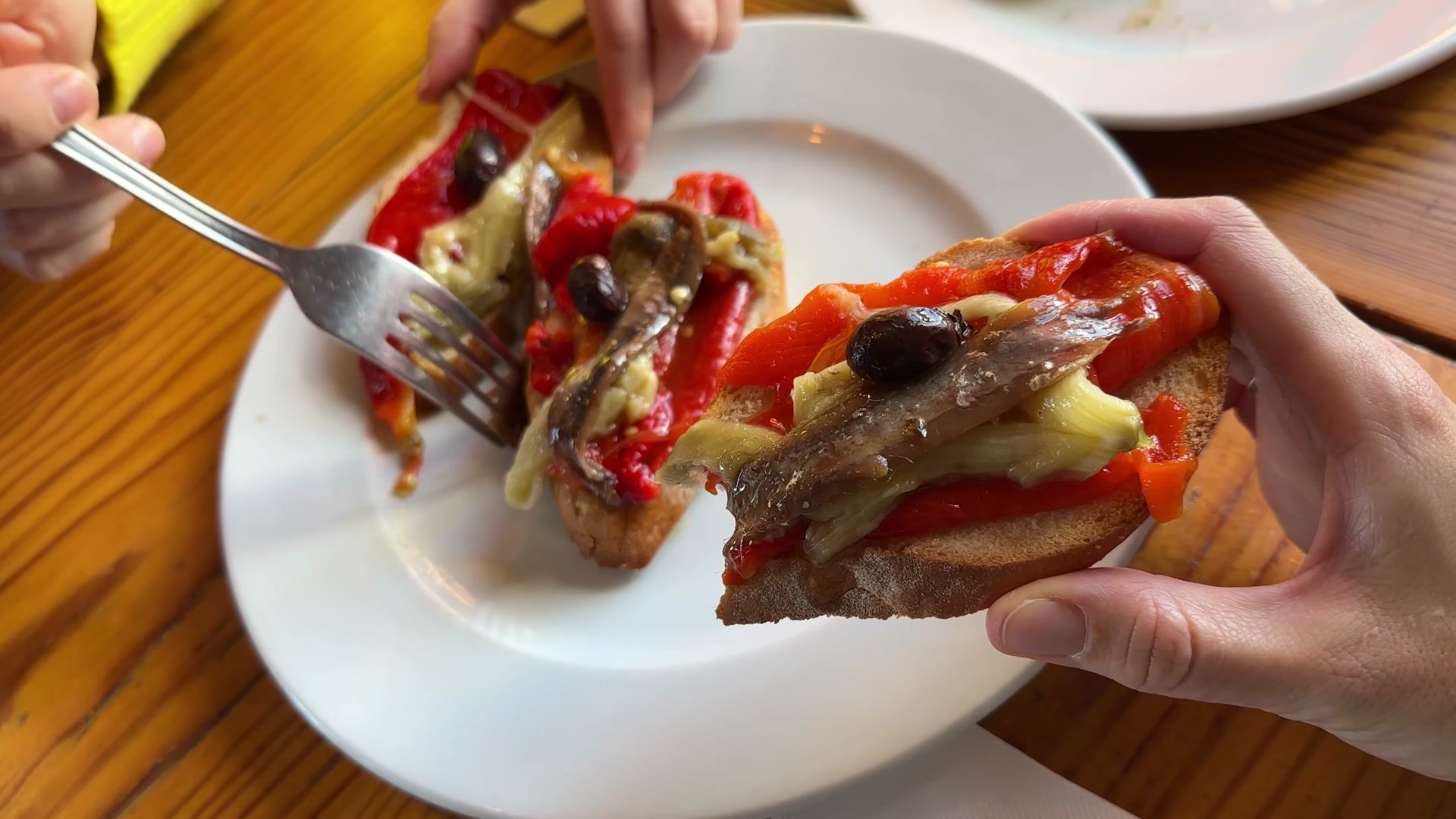 As we got out of the car, there was an incredibly strong wind outside, making it difficult to reach the restaurant. The place was quite noisy because all the tables were full. While waiting for our meal, we were served anchovy canapés as a starter, which were very delicious. When our meals arrived, everything looked fantastic and we started eating right away. There were shrimp and I had steak and lamb. We sampled a bit of everything.