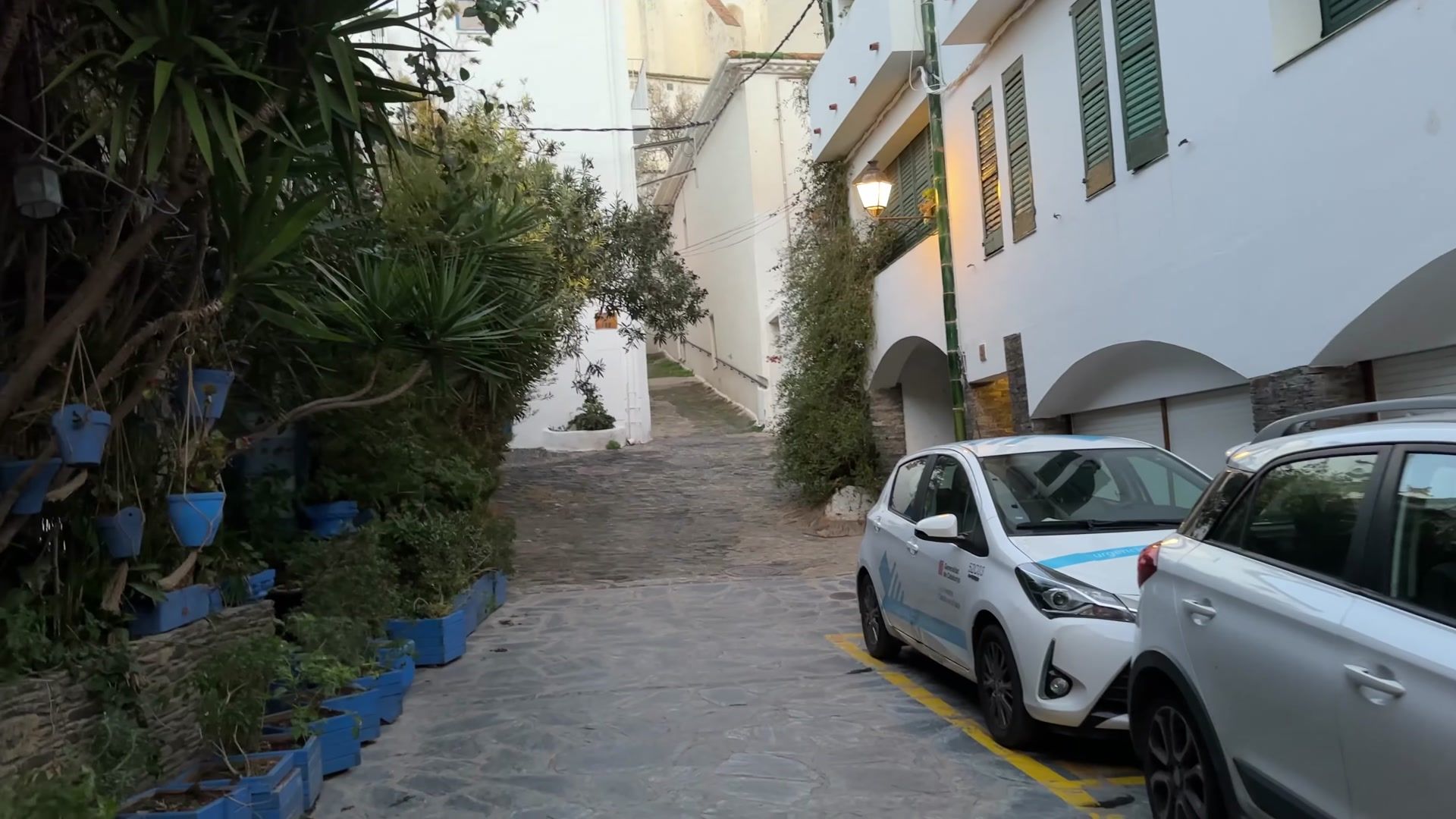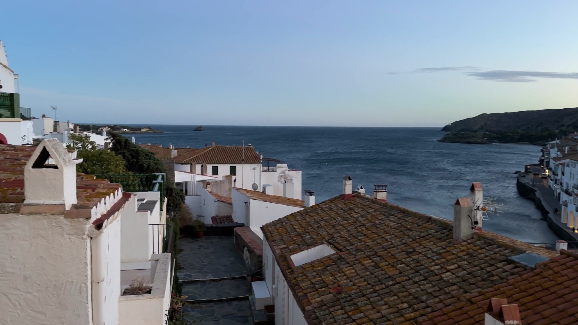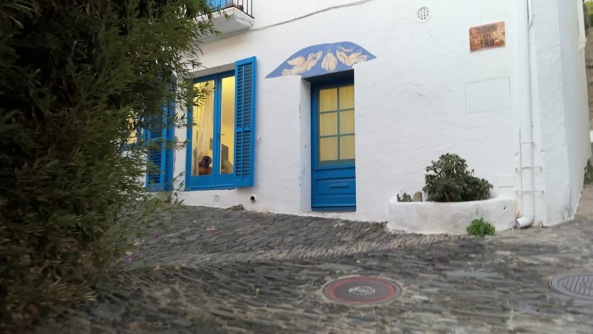 In the twilight everything looked different. While the white walls with blue windows or blue flower pots looked one way during the day, they appeared different at sunset. But it was beautiful either way. This is how you can understand Cadaqués. Typical white houses with blue windows. The place was quite hilly, surrounded by mountains on all sides. There were constant ups and downs. The strong wind near the restaurant and lighthouse wasn't present here, but there was still a slight breeze. The wind was cold because it came from the mountains. You can come to Cadaqués directly by bus from Barcelona. It takes about two and a half hours, with winding roads for the last 25 km.