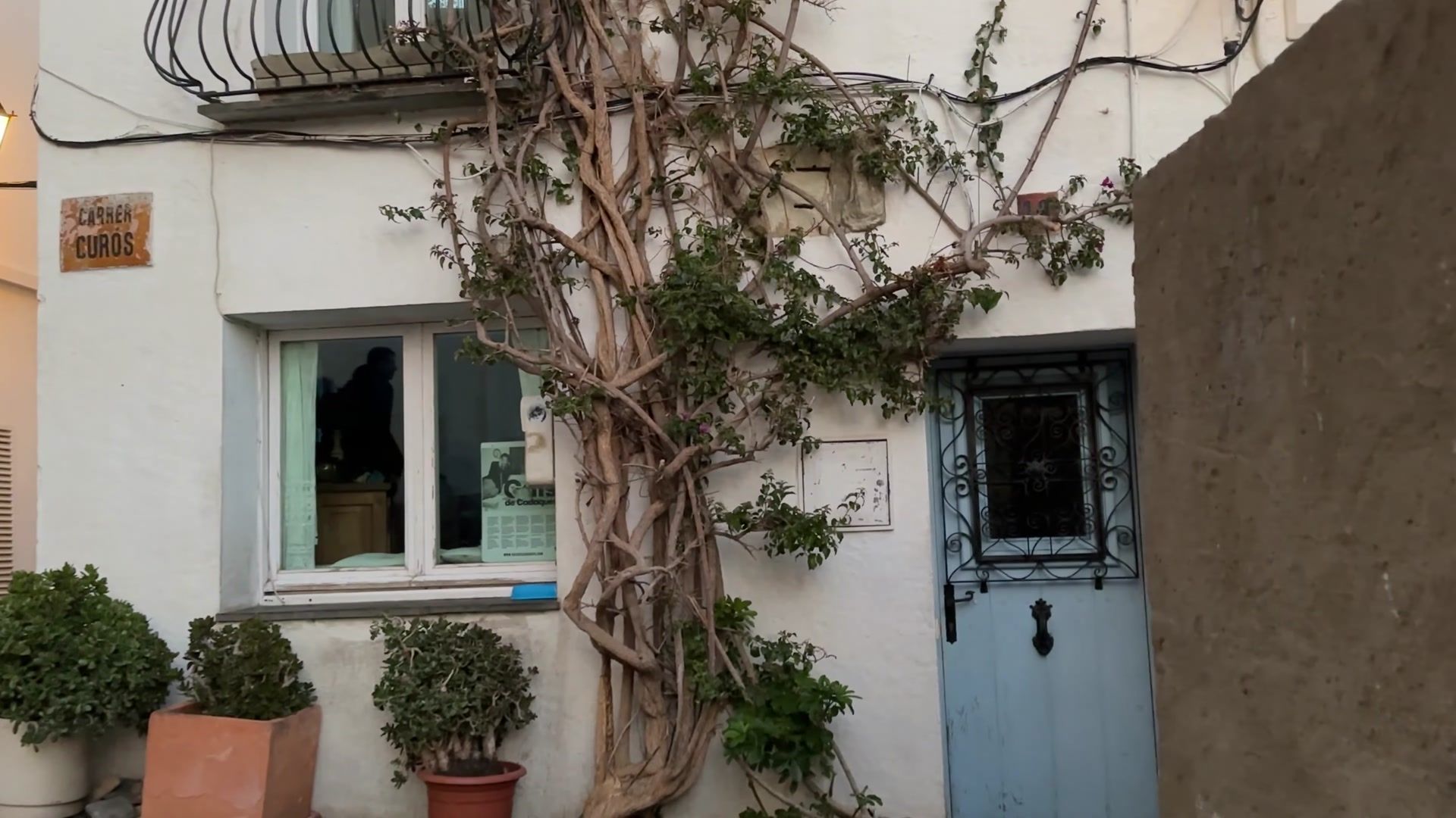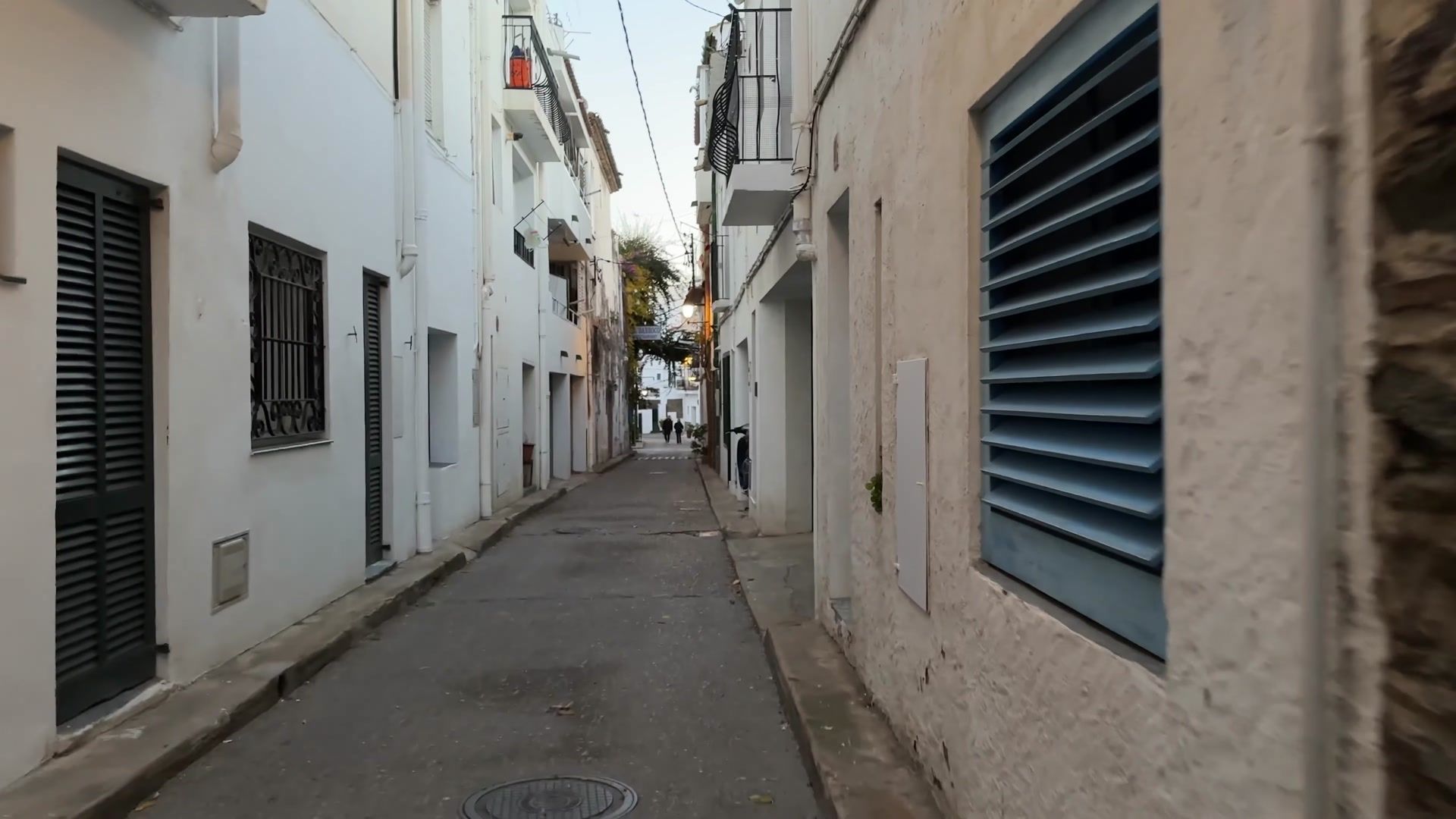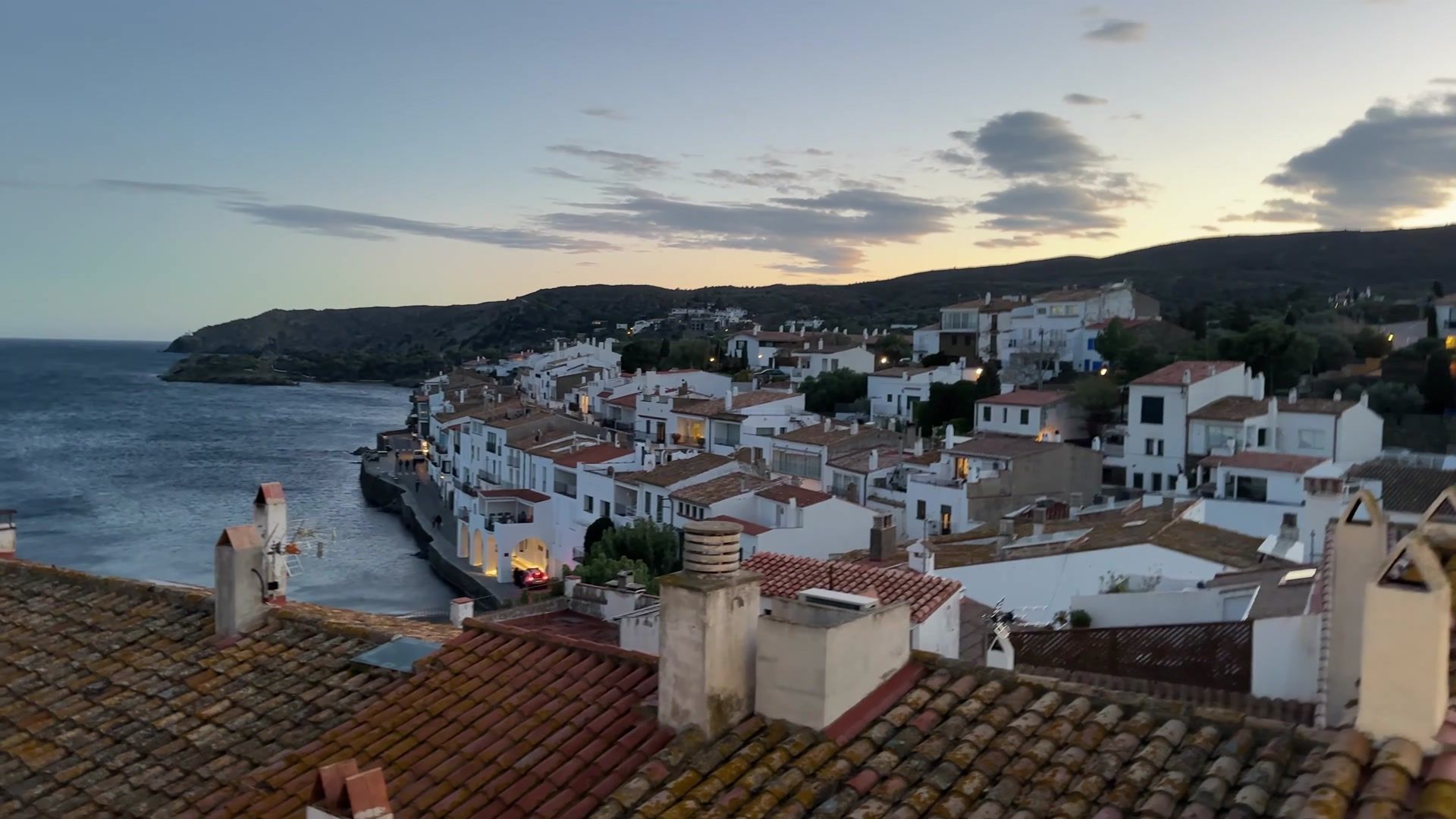In the twilight everything looked different. While the white walls with blue windows or blue flower pots looked one way during the day, they appeared different at sunset. But it was beautiful either way. This is how you can understand Cadaqués. Typical white houses with blue windows. The place was quite hilly, surrounded by mountains on all sides. There were constant ups and downs. The strong wind near the restaurant and lighthouse wasn't present here, but there was still a slight breeze. The wind was cold because it came from the mountains. You can come to Cadaqués directly by bus from Barcelona. It takes about two and a half hours, with winding roads for the last 25 km.